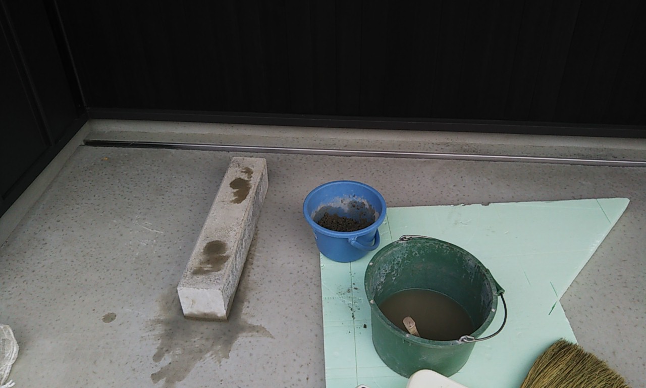 駐車スペースの車輪止め取付工事。土間コンクリートにアンカーを打ち、車輪止めの穴に挿入、モルタルで固めて強度を出します。