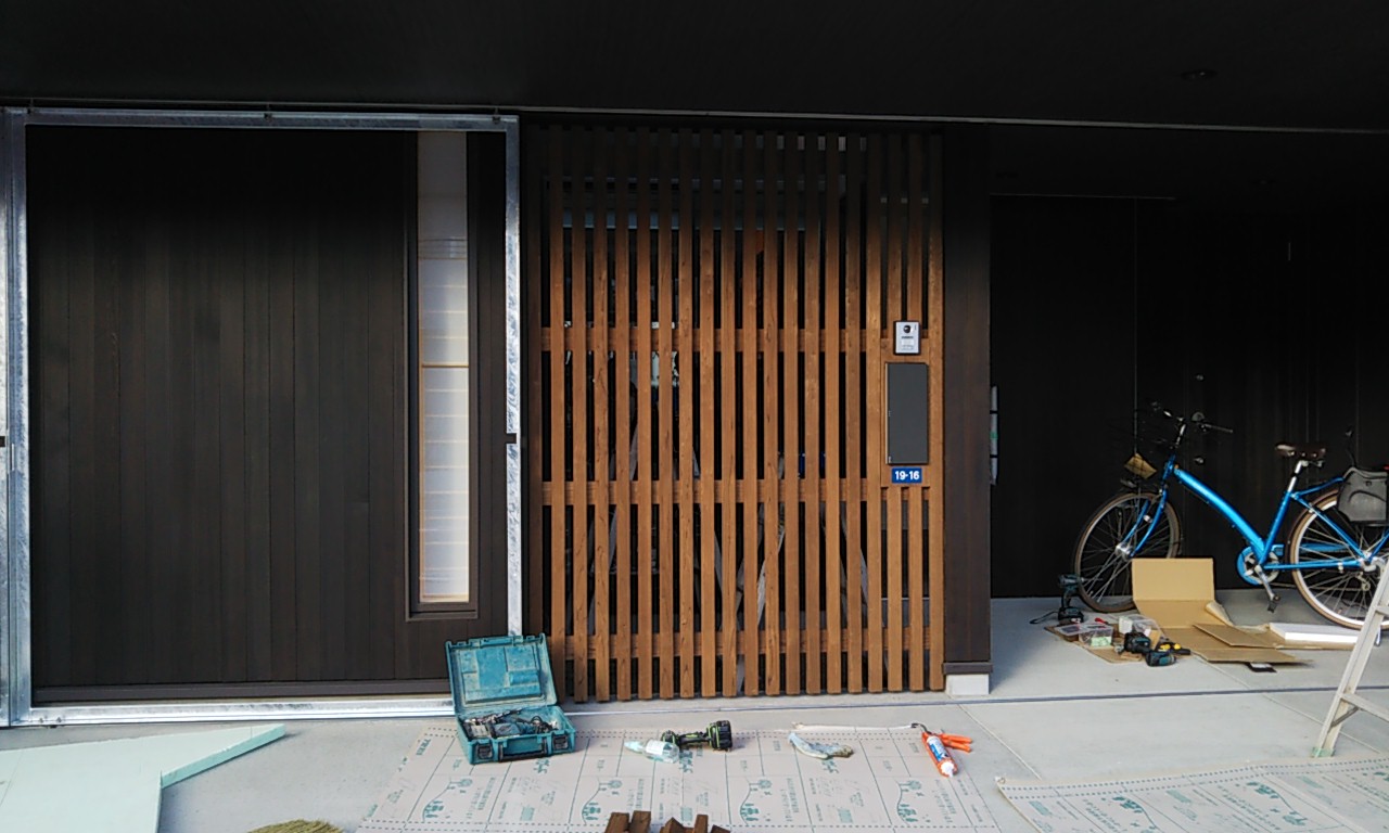 格子の一部にポストとインターホンを組み込みました。名古屋市では取り付ける事になっている地番プレートのブルーが意外なアクセントとなり、ちょっとレトロな雰囲気ものぞかせています。