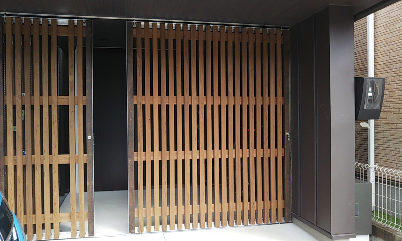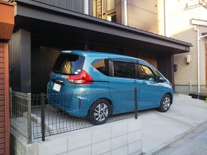 南北につながる奥のフェンスは着工前からあるものでグレー色ですが、新規フェンスのみは南立面の統一感を重視してブラウン色となっています。