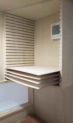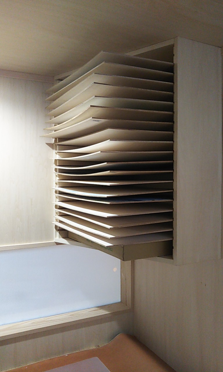 奥様が使用するアトリエには水彩画の『水打ち』用の板を収納できるように上置き棚が設置されています。水打ち板同士が接触せず収納できるように溝を切った板を両サイドに取り付けました。約20枚の水彩画の下地紙を同時に保管する事ができます。