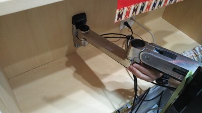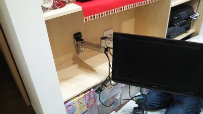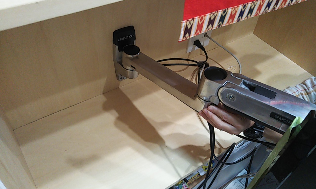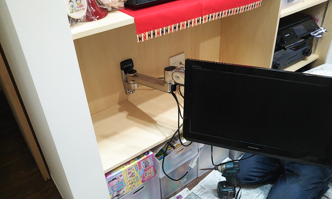 リビングのテレビ用アームの取付。収納棚からテレビを引出し、いろいろな角度から視聴する事ができます。