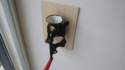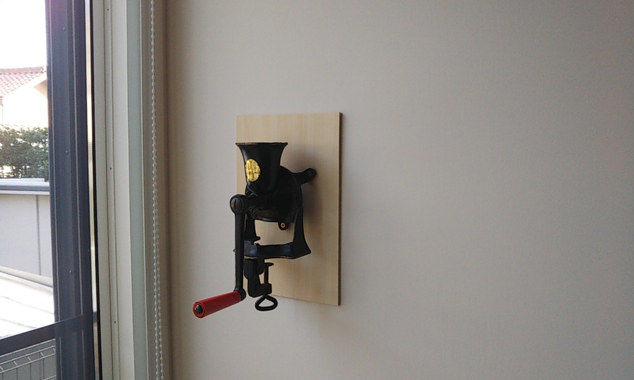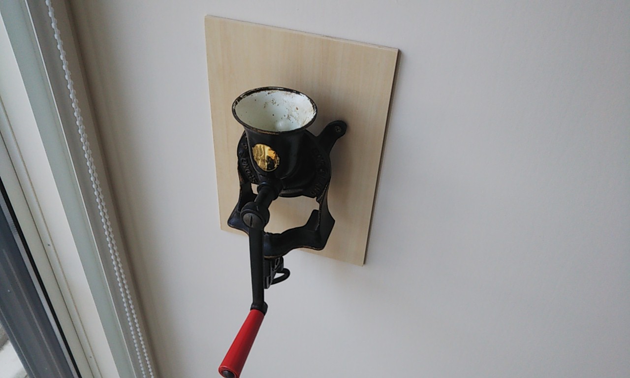 ダイニングキッチンに近い部分の壁にコーヒーミルを取り付けました。白い塗装の壁に汚れが付かないよう、吹抜に使用したのと同じシナベニヤを台座としてあっさりと仕上げてみました。だいぶ年季の入った鋳鉄製(?)のミルです。