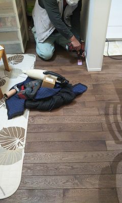 エアコン目隠し格子カバーの取付部品の取り付け、床換気口の落下防止網戸等取付。地味に手間のかかる作業を地道に続けていきます。