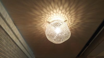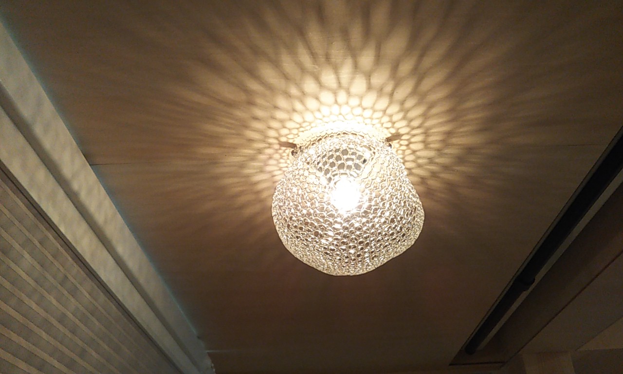 住宅が完成してから、約2か月が経ち、玄関部分の照明カバーの取付にうかがいました。ガラス工芸のデザイナーさんが作成されたガラスのネット状のカバーを小さいL型アングルで天井に留めつける作業です。素材の繊細さもあり、取扱には細心の注意を払う必要がありましたが、出来上がってみると、天井面には幻想的な陰影が映し出されます。