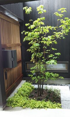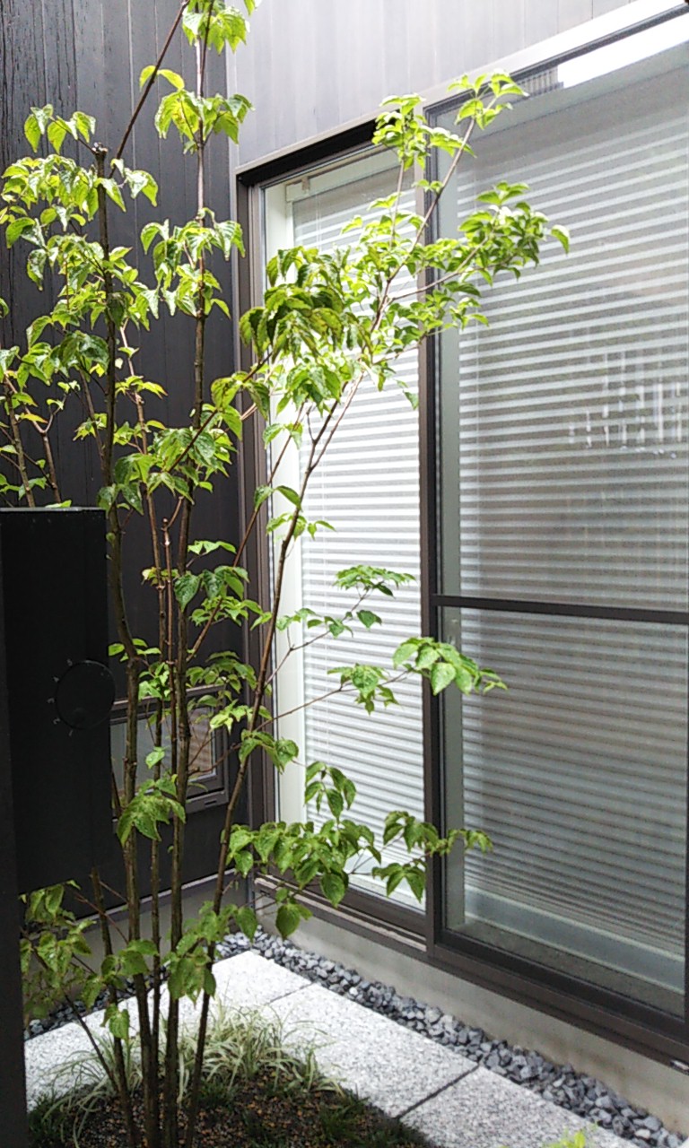 春先に植栽工事を行ったとの事で、でき上った庭を拝見しました。実際にはもう少しグランドカバーとなる植物を植えられるそうですが、その植物の季節に合わせるそうです。設計士さんのお知合いの造園業者さんに依頼したという事でした。都会の住宅の敷地の限られたスペースの中に自然を醸し出すまさに『坪庭』といった風情です。