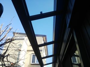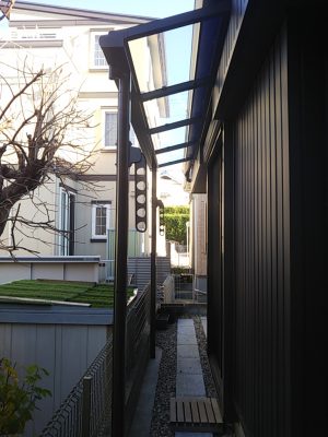 北側の通路となる部分にアルミテラスを取付けました。洗濯物を屋外に干したい時、北側につき陰干しとはなりますが、比較的たくさんの洗濯物を干すスペースが取れるようになりました。