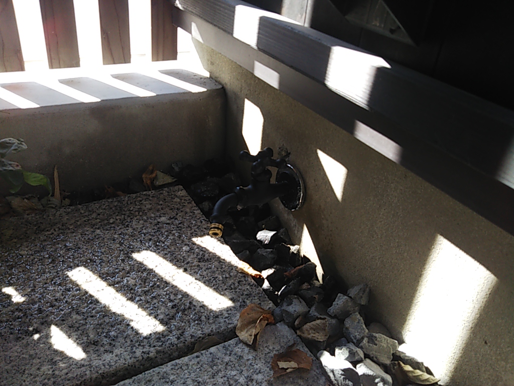 坪庭の植栽に水をやる時に便利な位置に水栓が欲しい、とのご希望です。通常であれば他の外部水栓の周りを掘ってそこから給水管を分岐し、土の中を埋設配管して坪庭まで持ってくるところですが、今回の坪庭は二方が基礎コンクリート、残りの二方が土間コンクリートに囲まれているため、埋設の方法が使えません。そこで室内から床下へ潜り、内部の設備の給水管から分岐し、基礎コンクリートに開口して給水を取り出す、といったある意味力業で取り付ける事にしました。