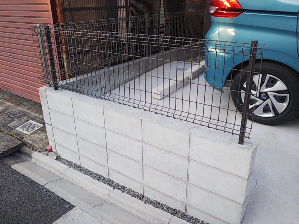 道路境界線の一部ブロック積みとフェンス工事を行いました。道路にも比較的勾配がついていましたので、写真向かって左側は駐車場と高低差がありました。誤って落ちてもいけないという事で、2.0mのフェンス一枚分ブロックを積んでその上にフェンス取付としました。