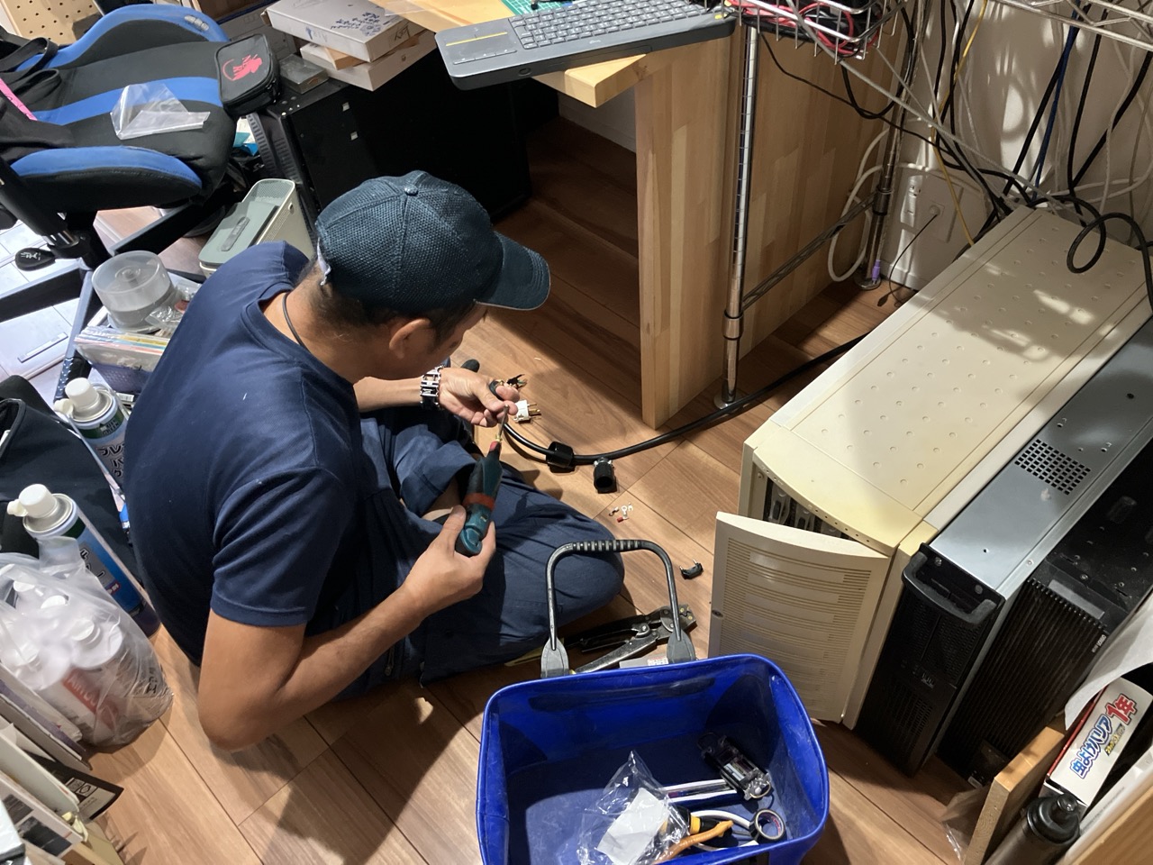 k様の在宅ワークの状況に合わせて20Aを引いているコンセントの位置を変えたい、との事で交換工事にやって来ました。その他細かな電気工事も行いたいのでf井電気のh場さんと一宮の現場を辞した後にそのままハシゴして名古屋市まで来ています。
