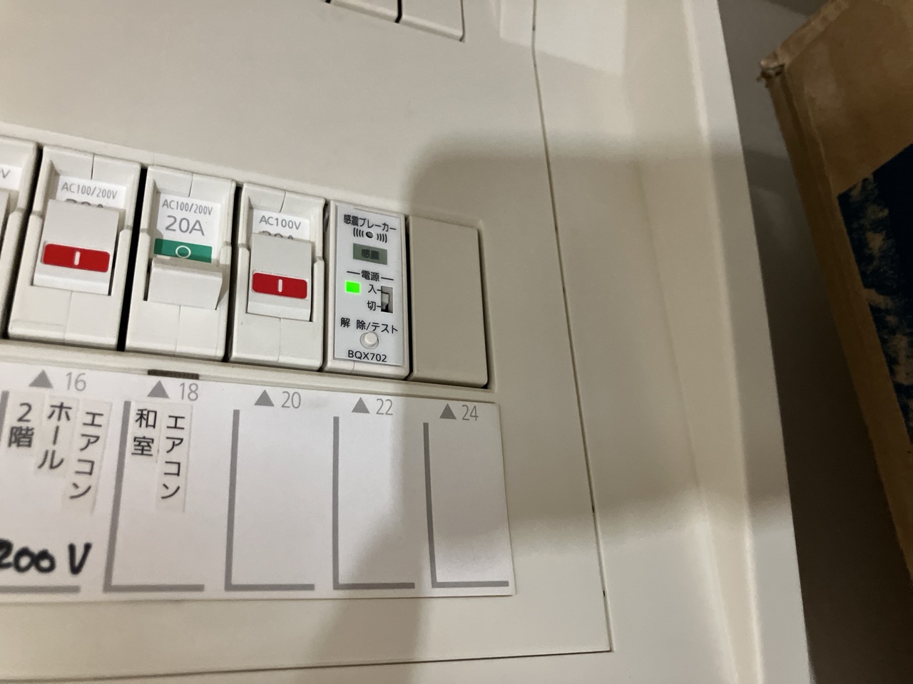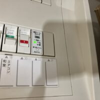 また分電盤の一角に『感震ブレーカー』を取付けたいとの事。震度5以上の揺れを感知する、あるいは建物が30度以上傾くなどの状態になった際、自動的に全電源を落とすという装置です。準防火地域であり、比較的木造住宅が密集しているこの地域で災害により電源がショートするなどしての火災を防止するために転ばぬ先の杖を先に突いておこうというお考えです。