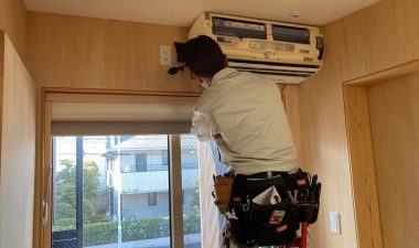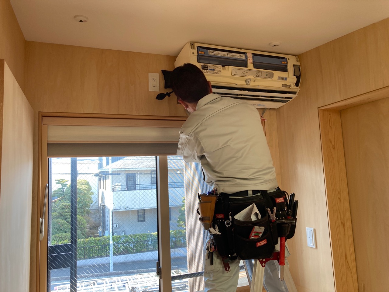 2階サンルームにあるエアコンの交換工事にやってきました。元のエアコンはk様が以前のアパートで使用していたものを取付けていたので、もう10年選手の機械でした。このサンルームは設計士mさんのこだわりで少々複雑な冷媒配管とドレン配管をしているので交換工事も一苦労です。