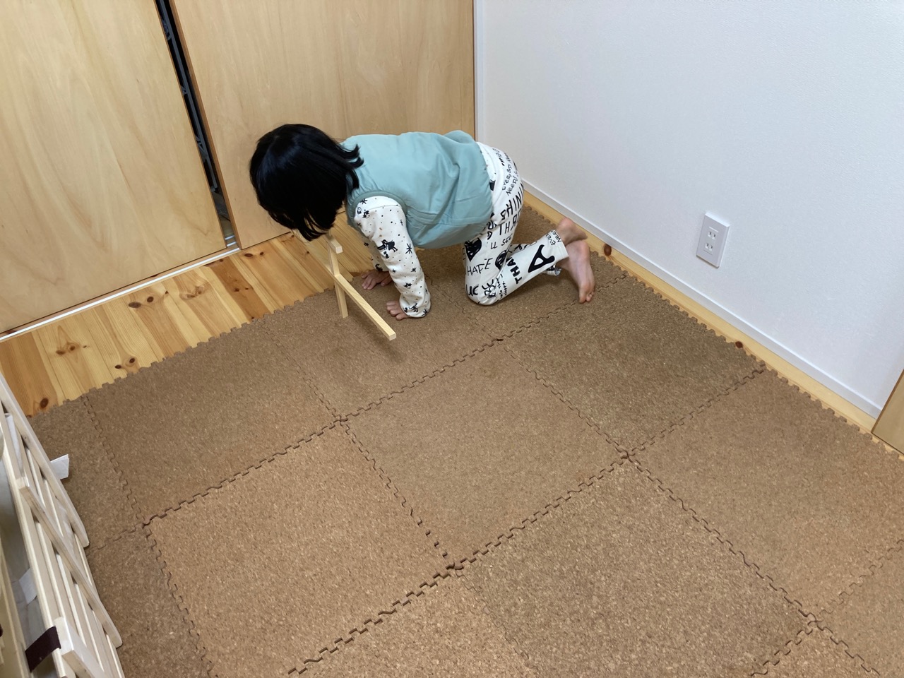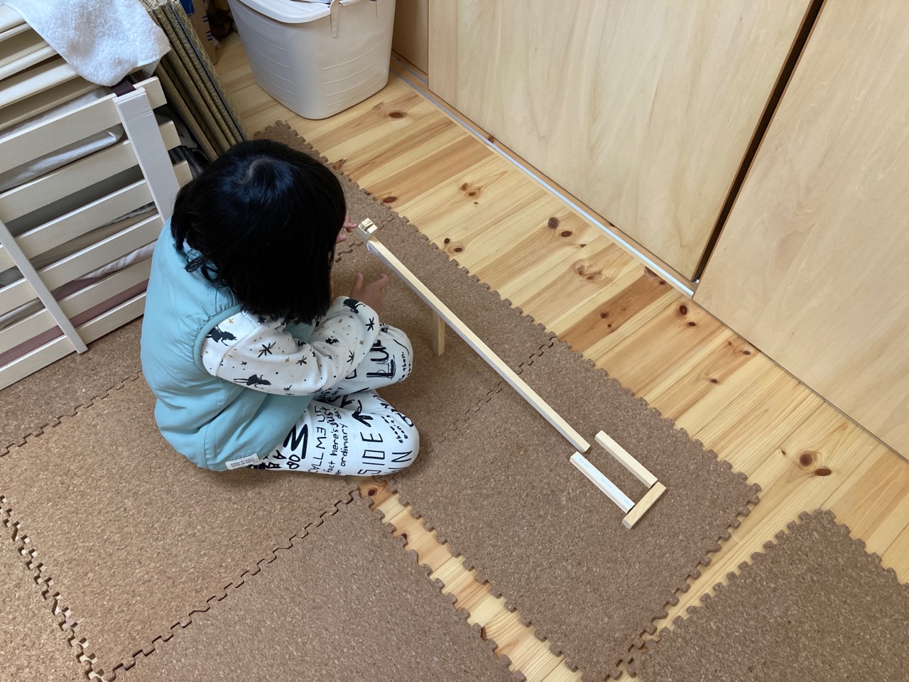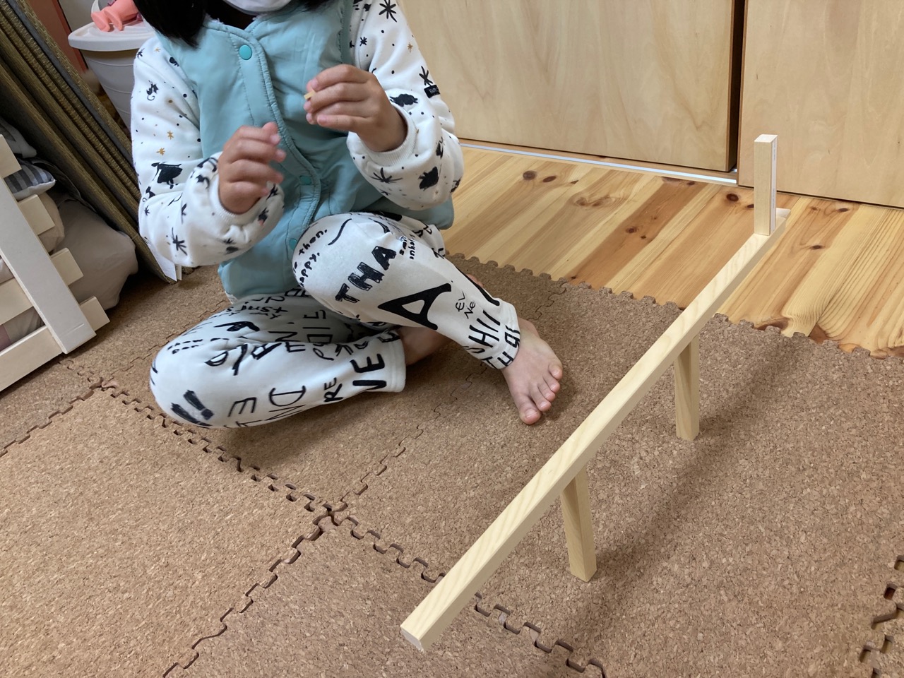 ・・・と書いて『f田建具さんの持ってきた戸当たり部材の余りですべり台をつくって遊ぶ、自宅待機中のsumiちゃん。』と読みます。