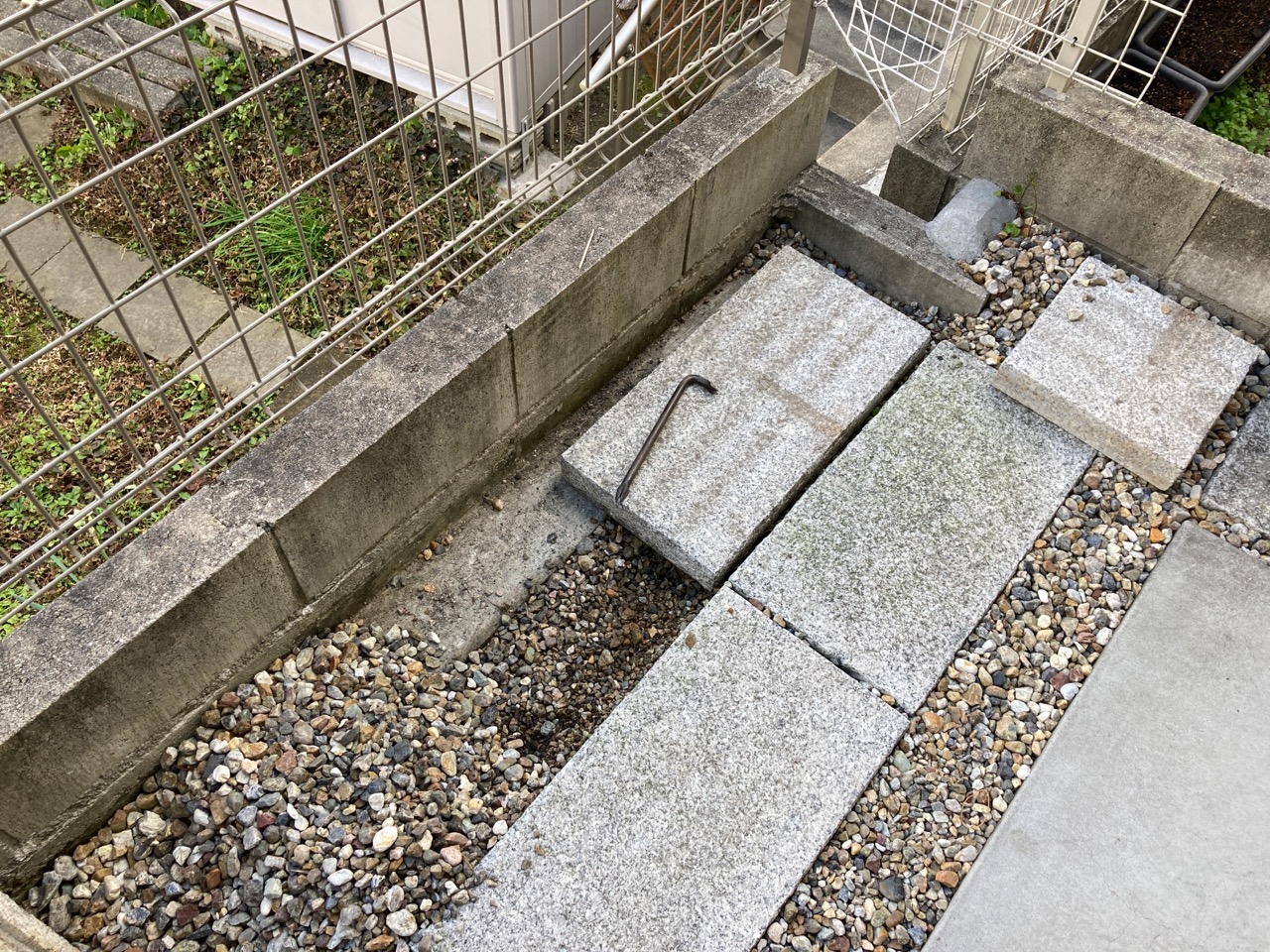 御影石は幸運にも寸法ピッタリに収まりました。一枚あたりが重いのなんの。砂があれば下端調整が容易でしたが、砂利で代用しました。