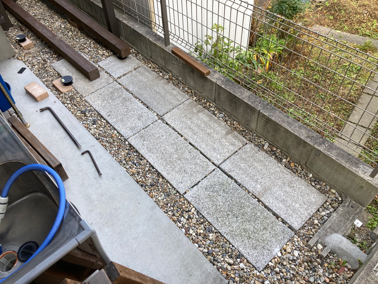 元々敷いてあった御影石の敷石はデッキ下となってしまうため、いったん撤去。元々の列の隣に新たに敷きなおします。
