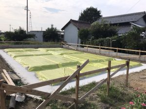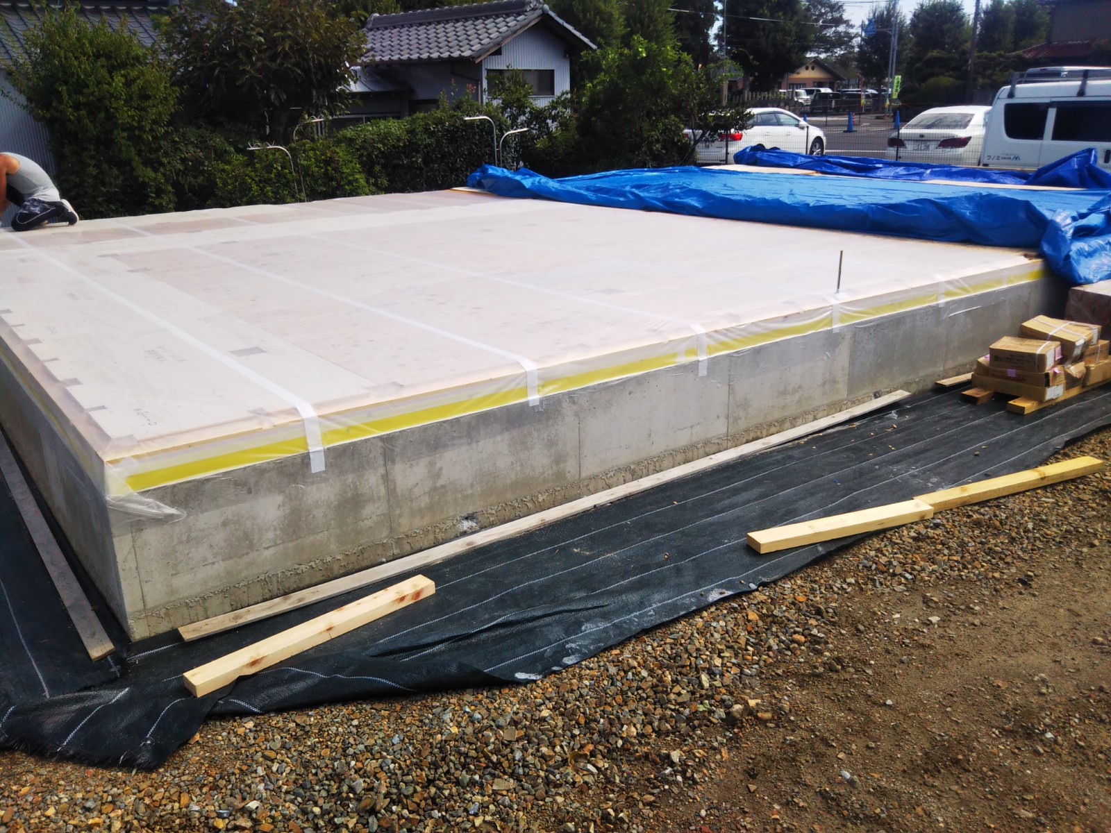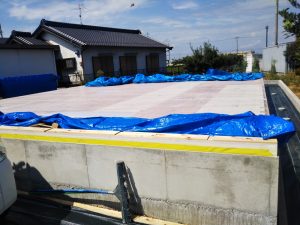 土台伏せが完了し、丁寧に養生していきます。週末予定している上棟、雨が降らないといいですね。