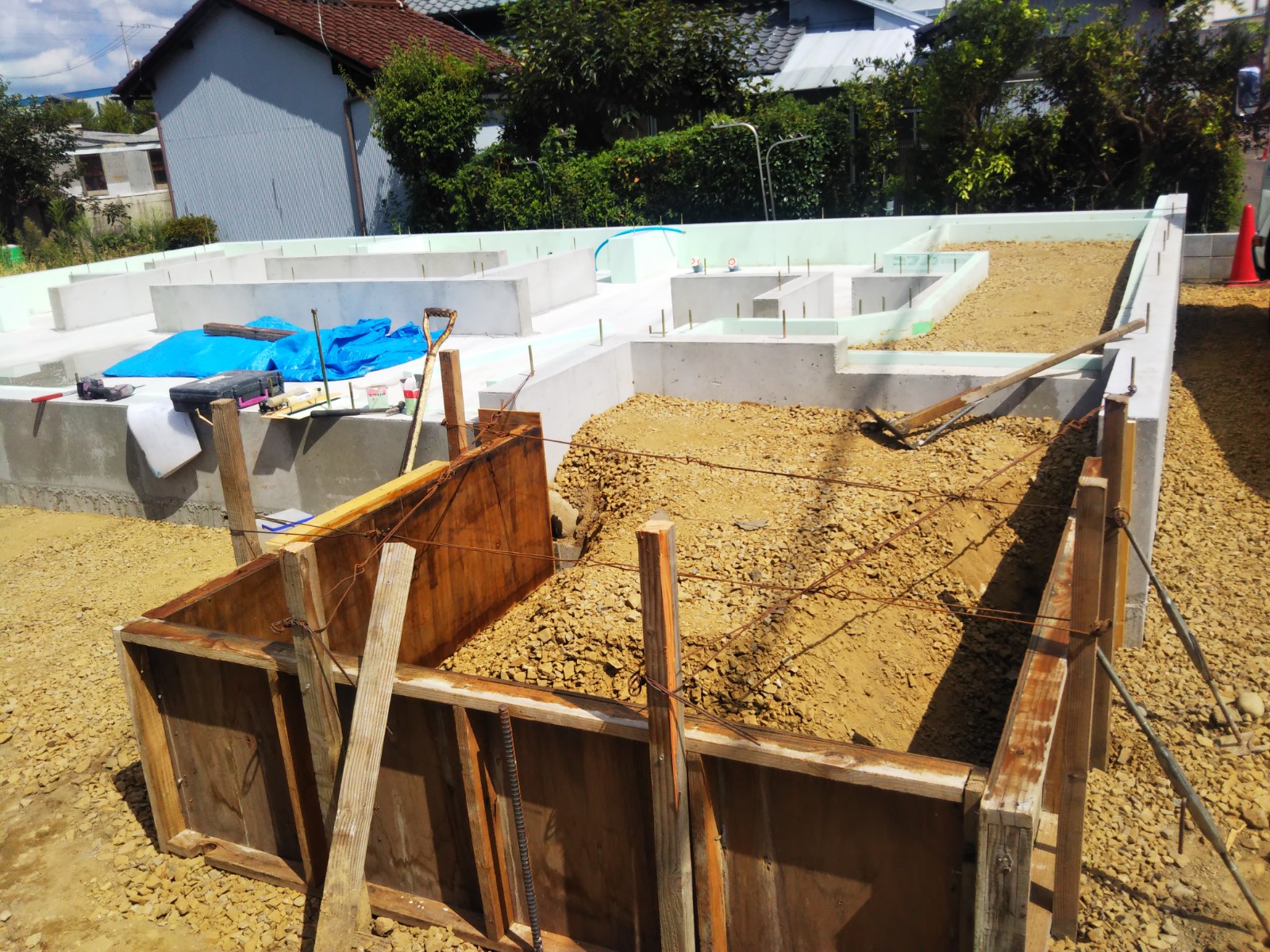 基礎の型枠が撤去されすっきりました。木枠に囲まれている茶色の砕石部分は玄関ポーチで、奥の玄関へと続きます。