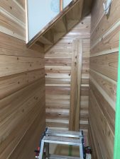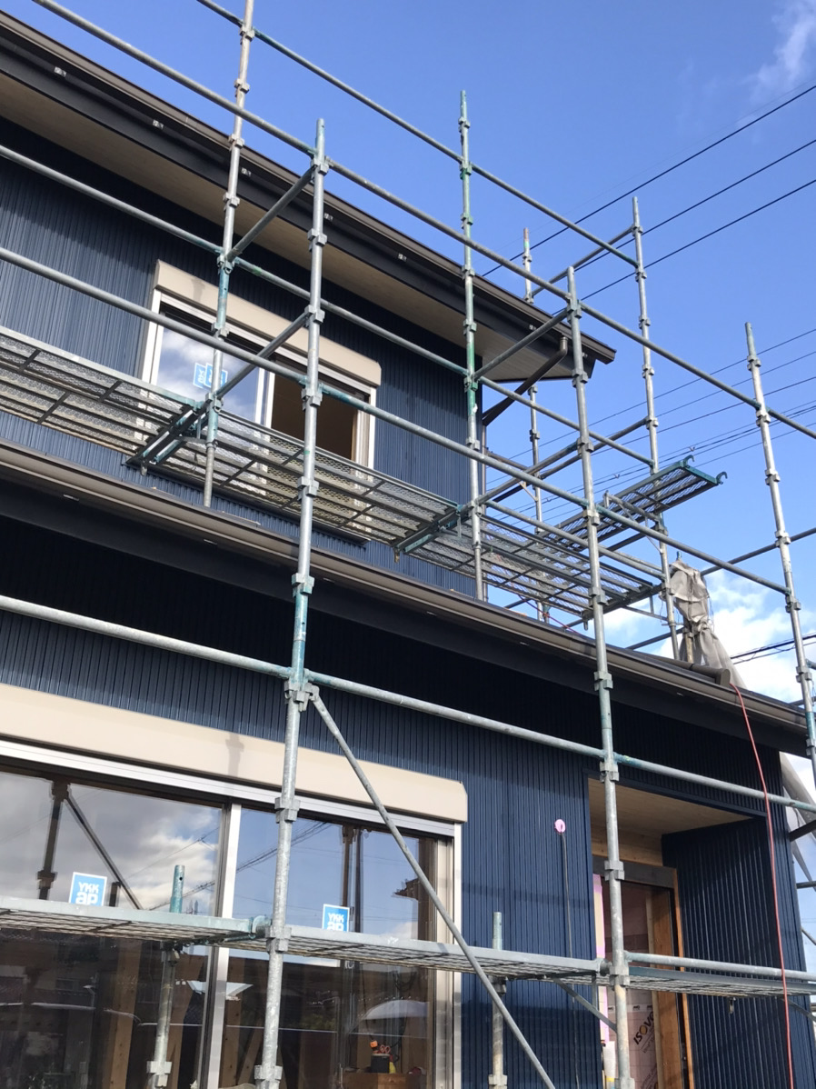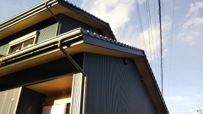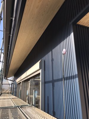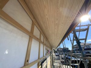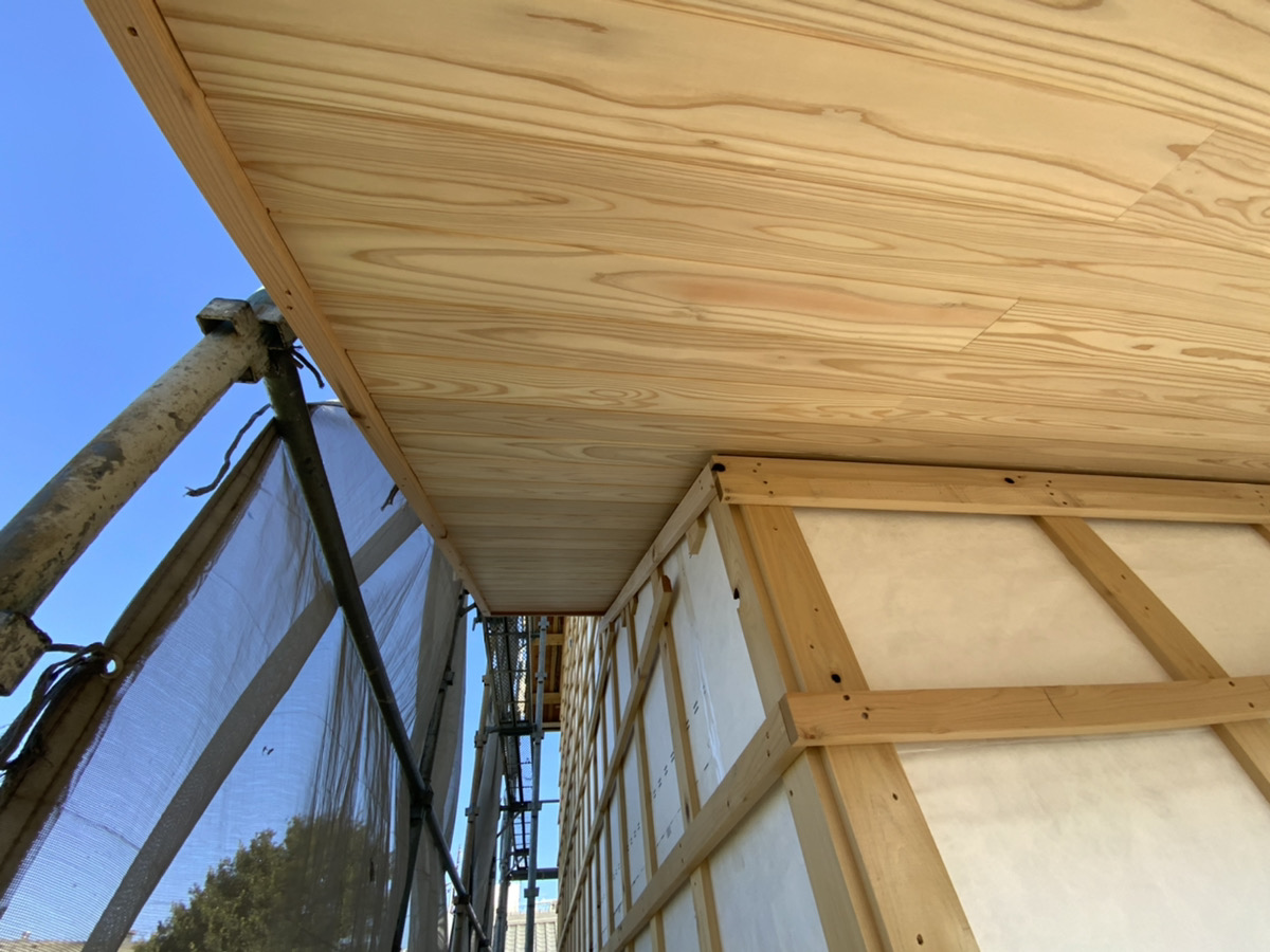 玄関上と軒裏に杉材が張られ、横胴縁が取り付けられました。このあと外壁のガルバリウム鋼鈑が施工されます。
