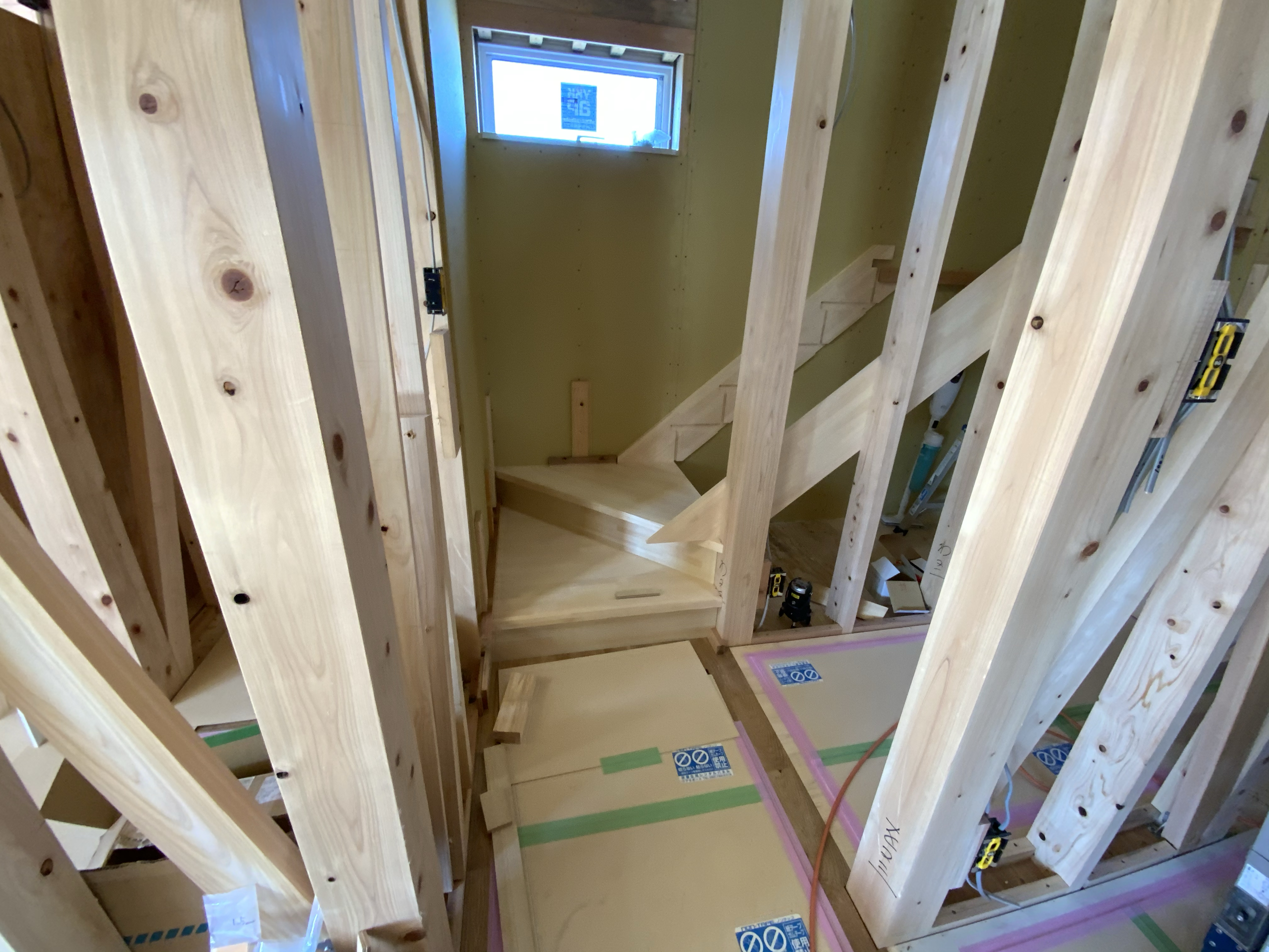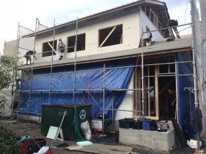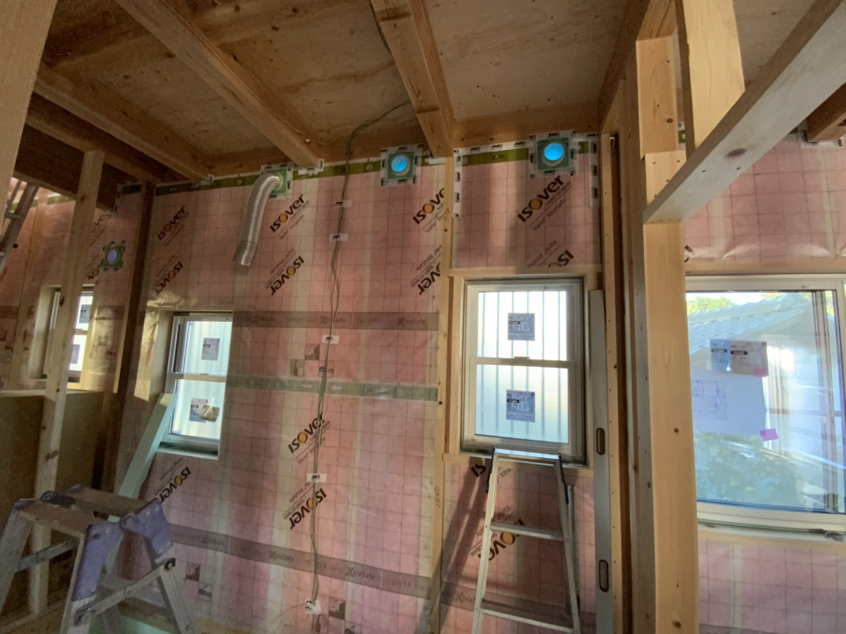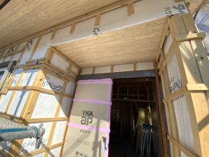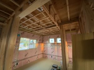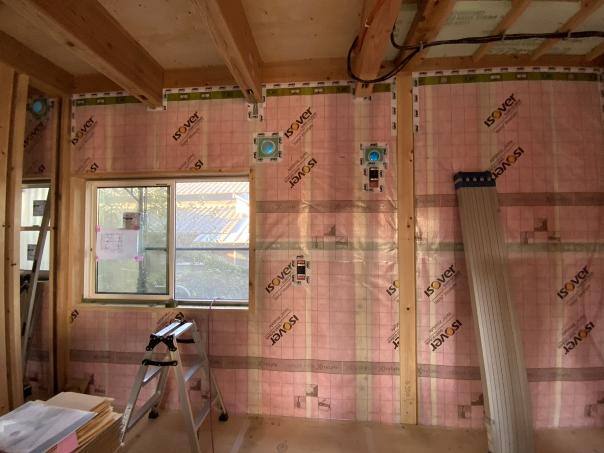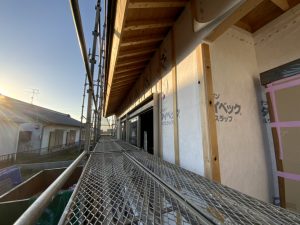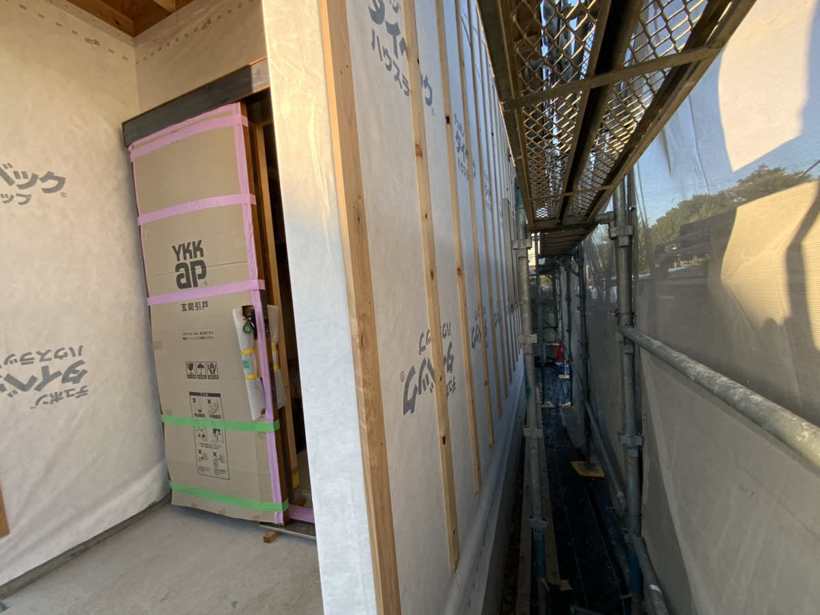 外部は透湿防止シートを貼り終え、下地胴縁が施工されています。この後胴縁が横向きに施工し、壁の中の通気ができるようにします。