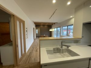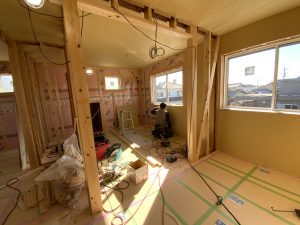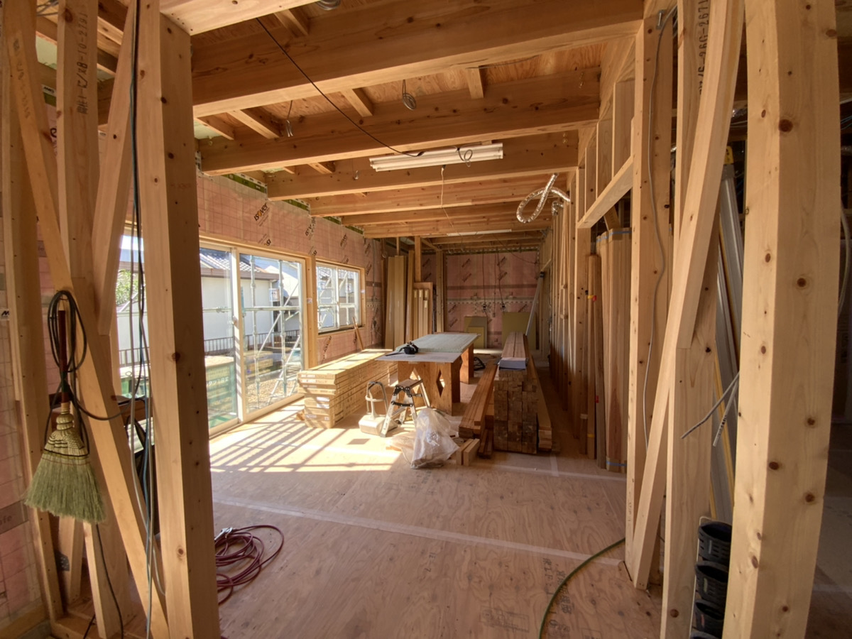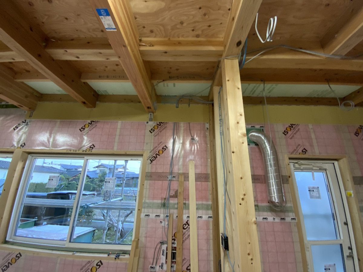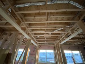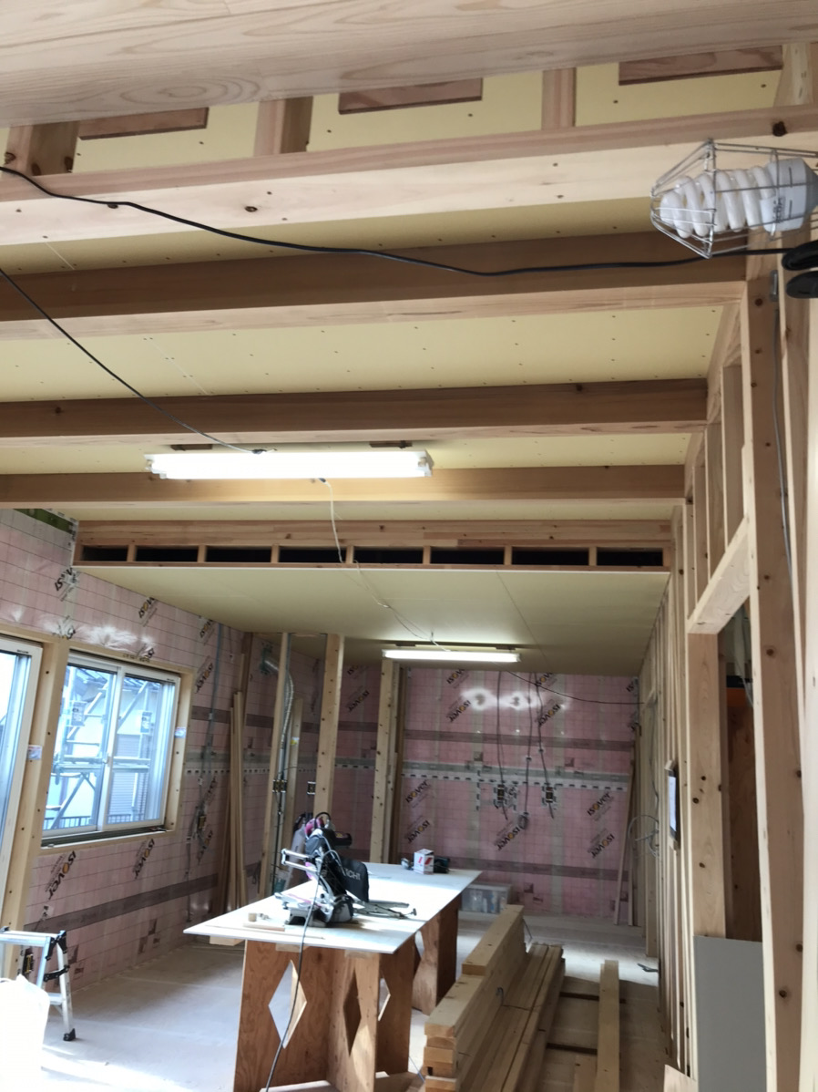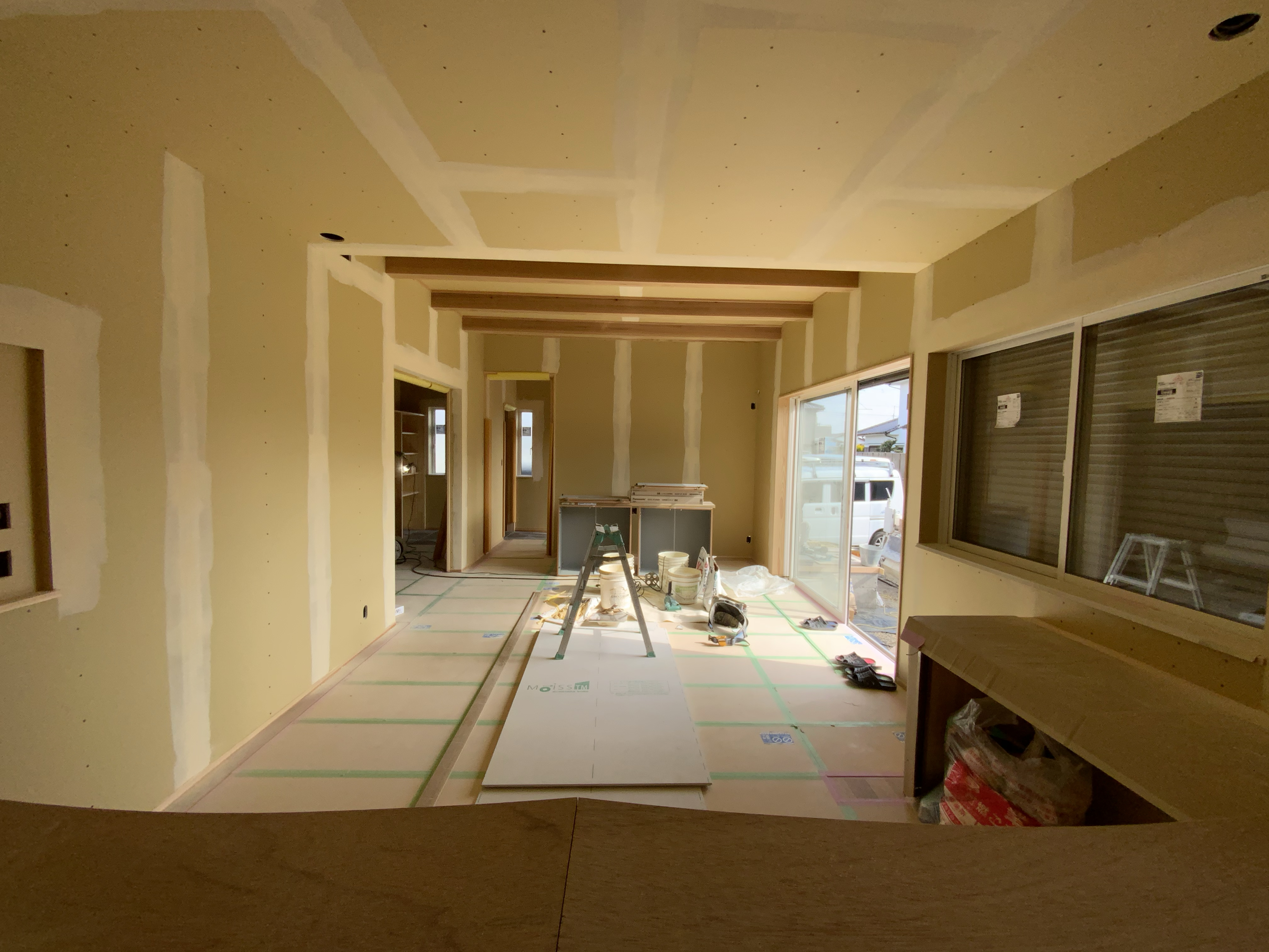 内部は天井プラスターボードが張られました。LDKの一部は天井が高く、化粧梁がみえる仕様なので開放感があります。