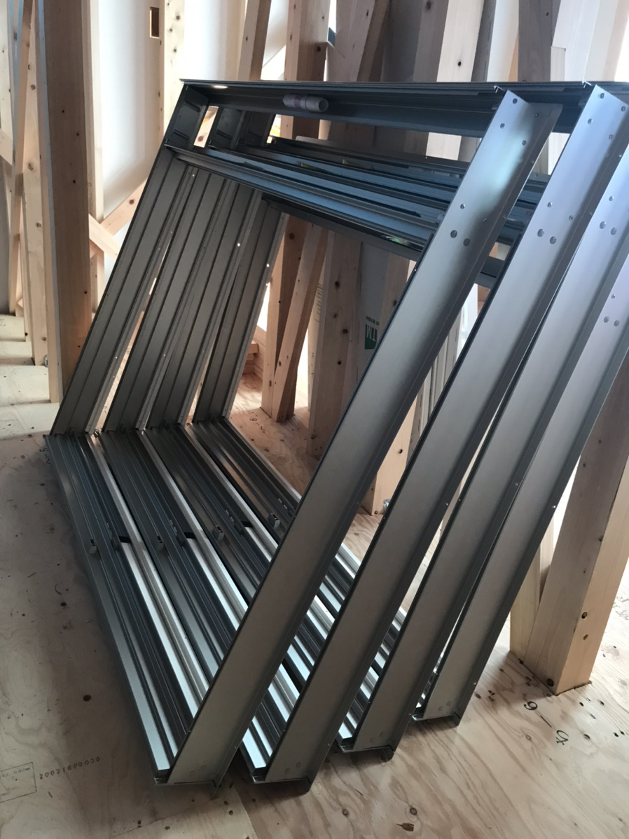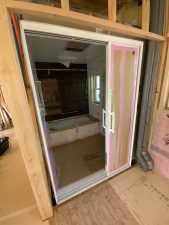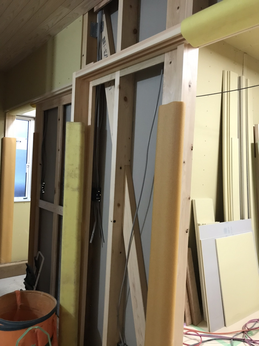 製作建具の建具枠が取り付けられました。s井大工さんはキッチン周辺の下地取付中です。