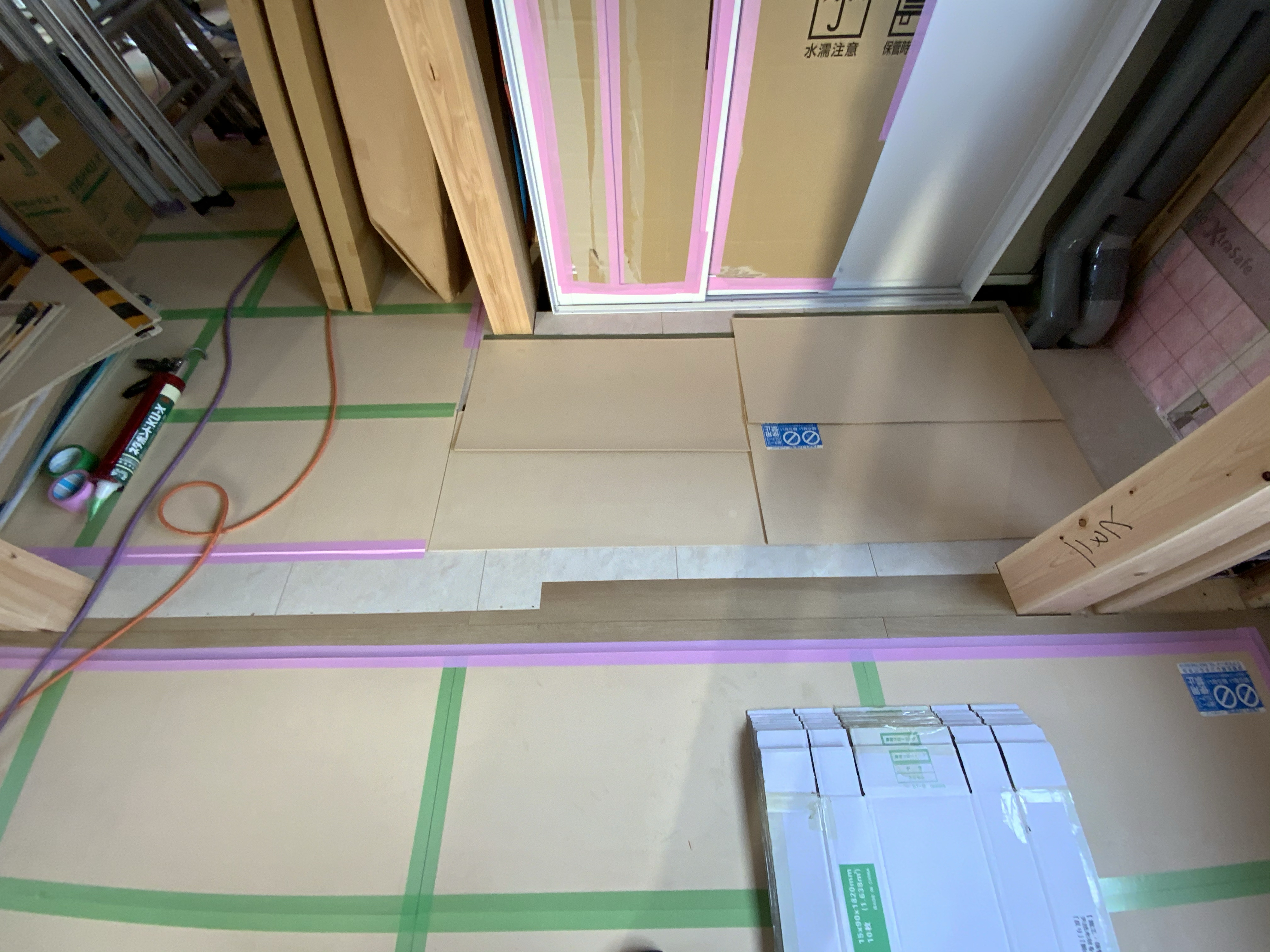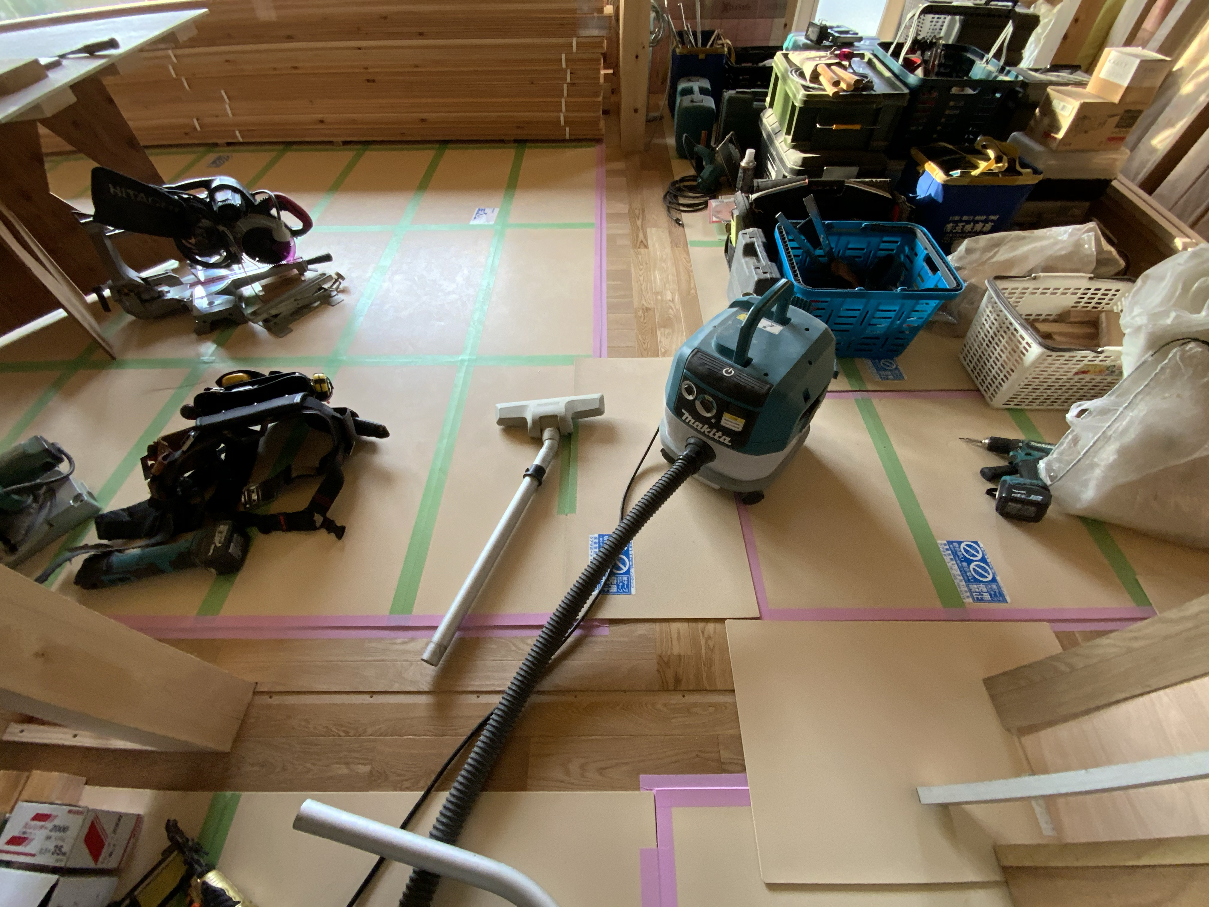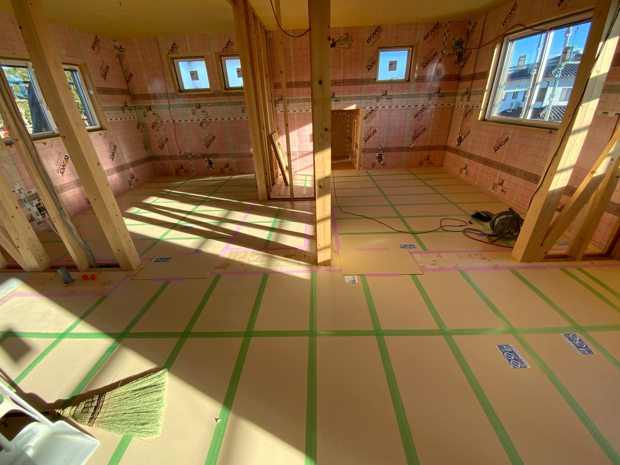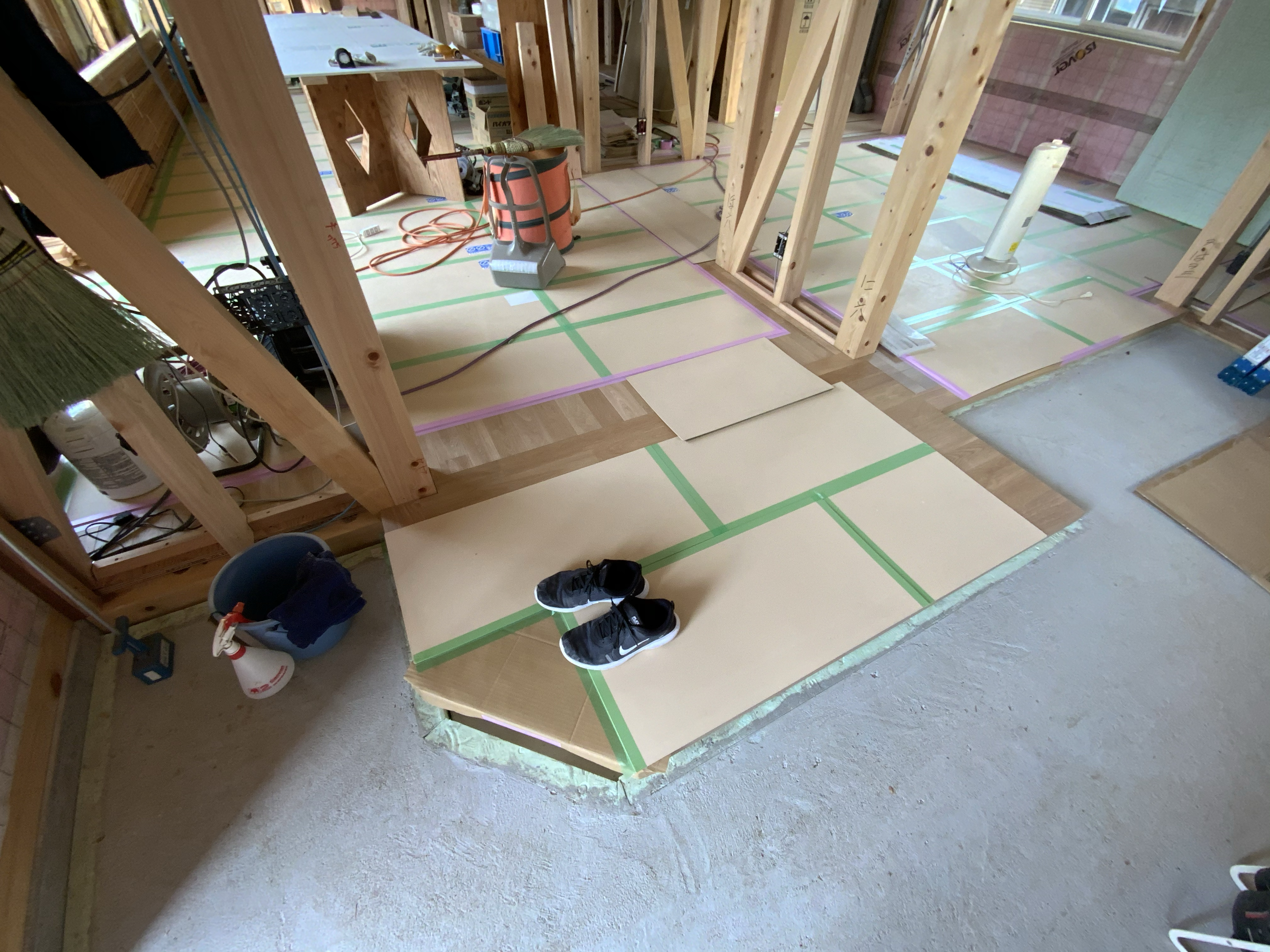 きれいに養生されてしまった後ですが、床が張られました。この養生シートは丈夫で何度も再利用できるエコ商品です。