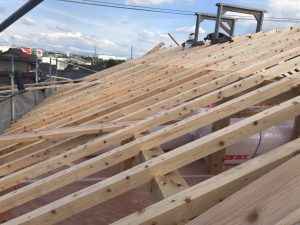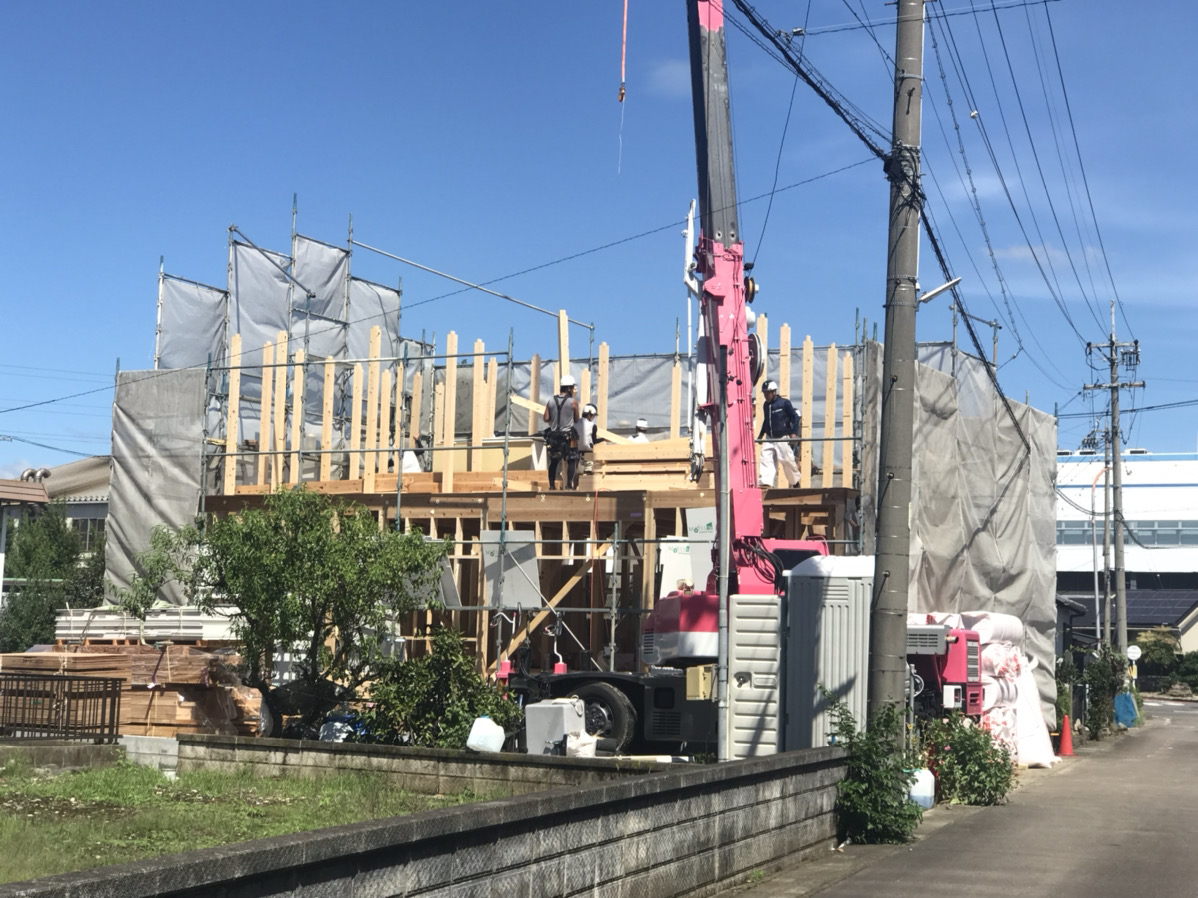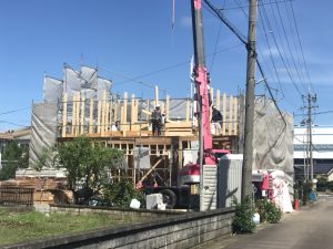 快晴の中、上棟は順調です。応援の大工さんも多いので手際よく進みました。