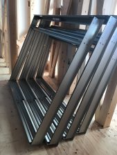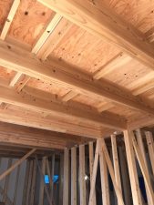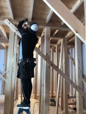 棟梁のS井さんが検査に向けて梁・筋交い・柱に金物を取り付けています。