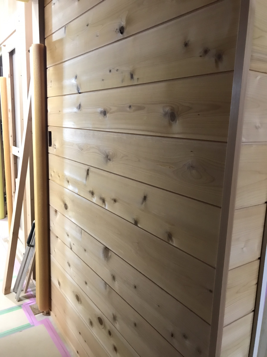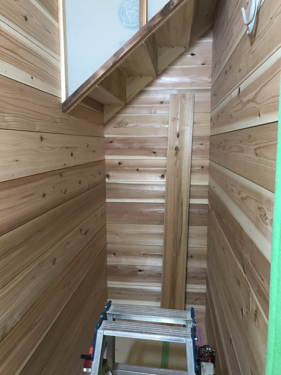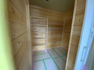 脱衣室は水に強いサワラ材、階段・WICなど収納部分には杉のアイジャクリを使用しています。