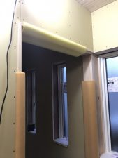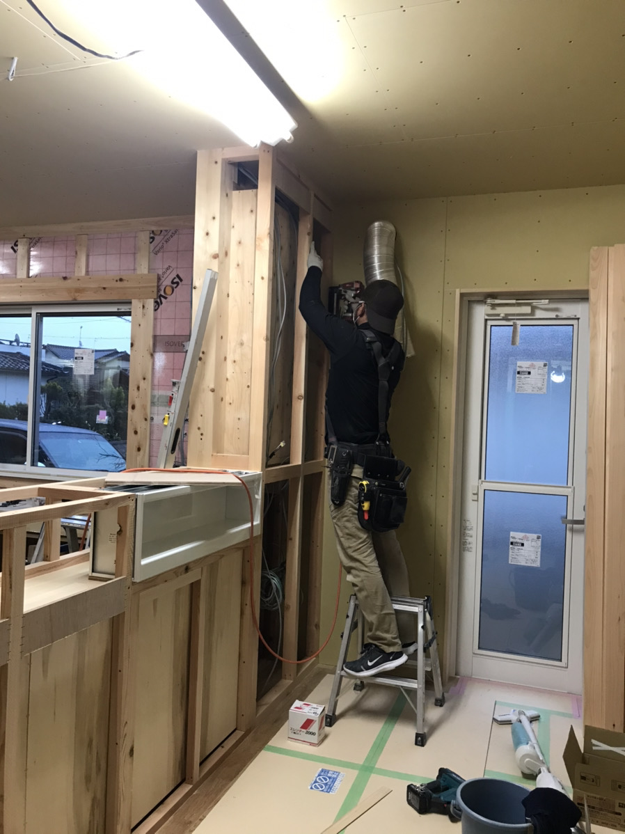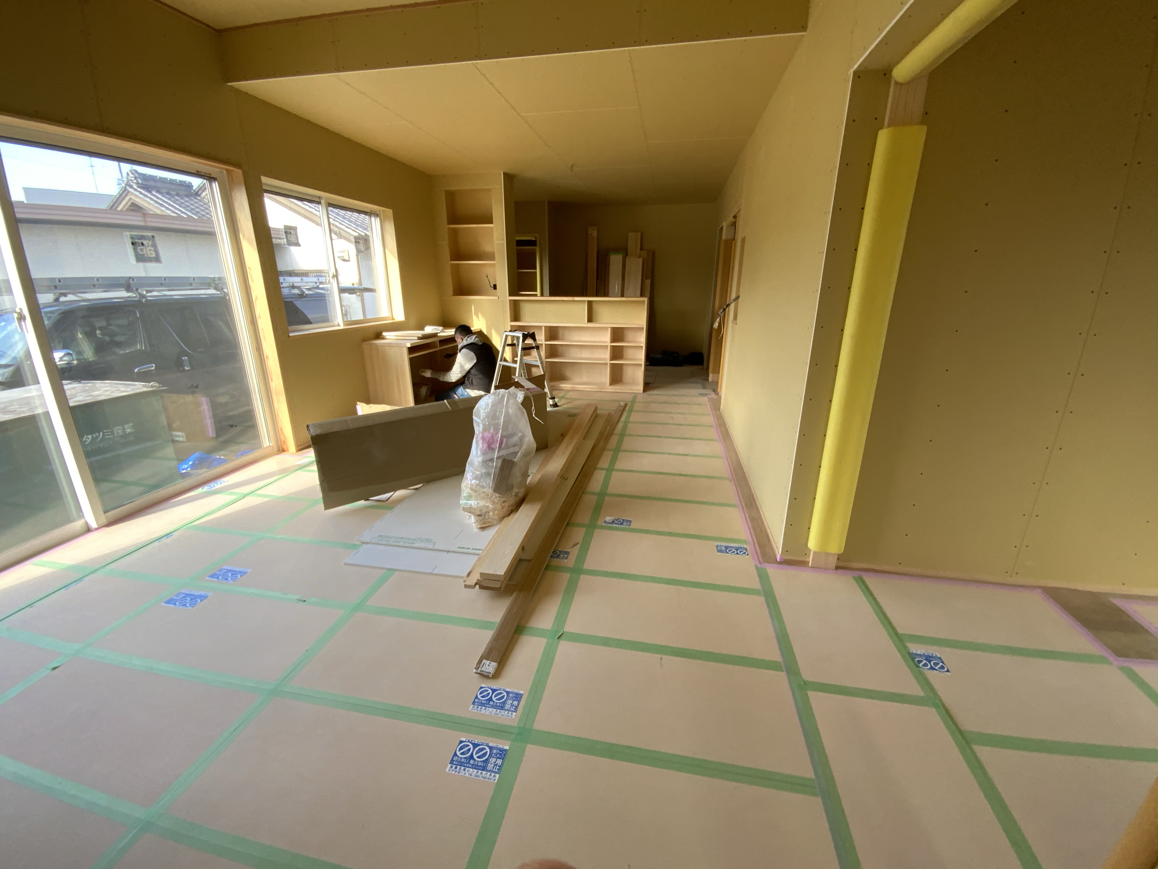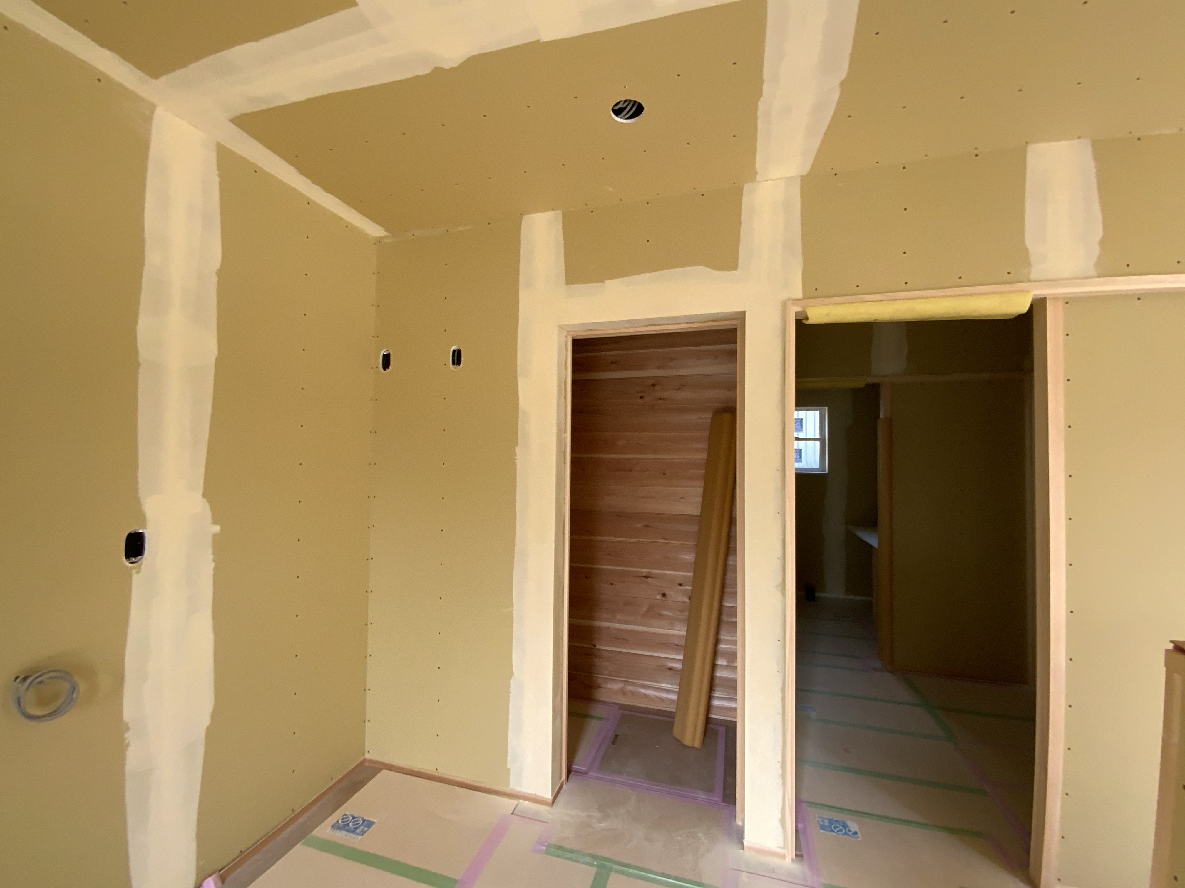 キッチン裏の収納スペースが多いので、カウンターデスクがとても使いやすそうです。パテ処理も施され、これからクロス貼り工事や照明取付へと進んでいきます。