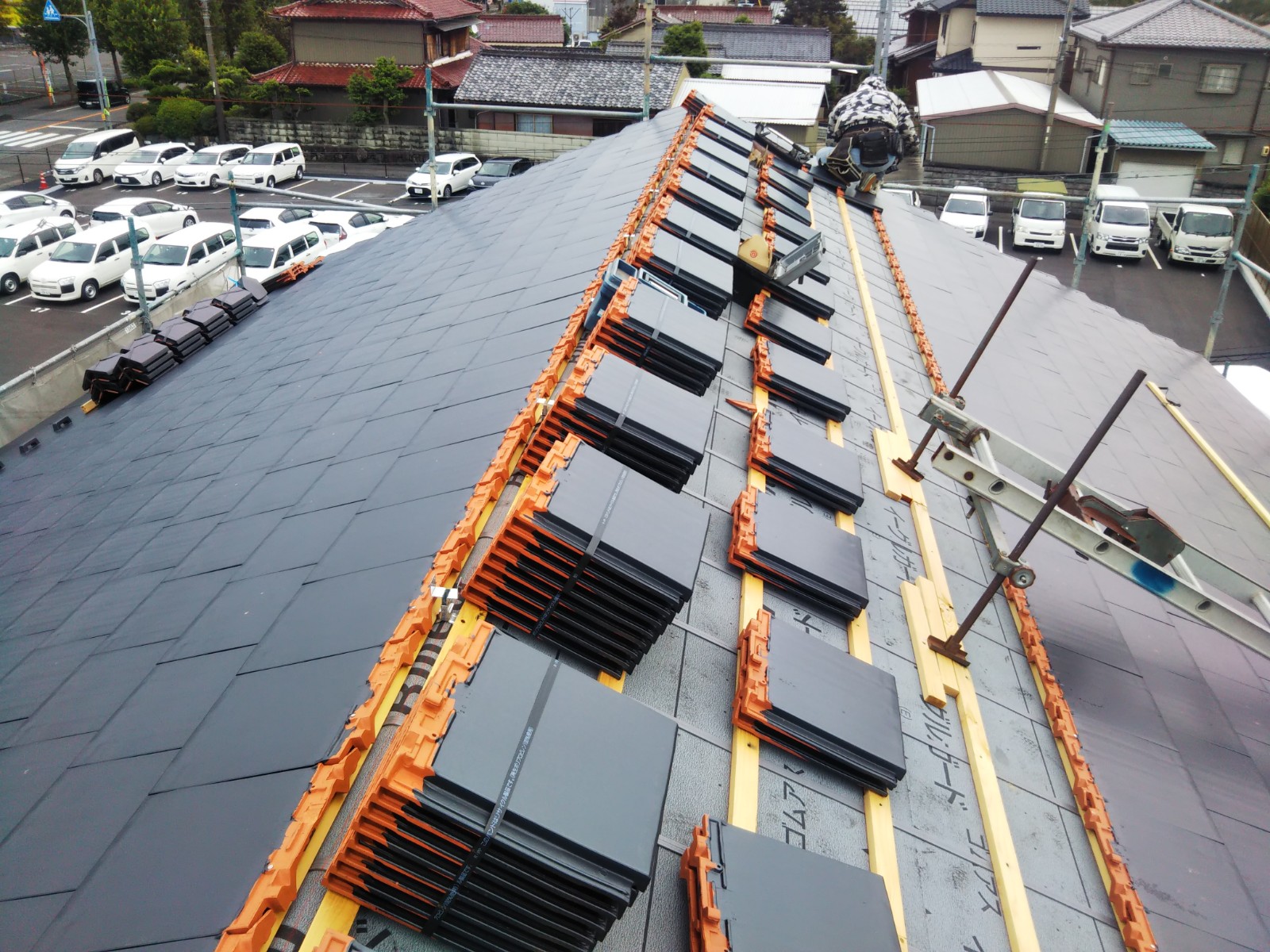 瓦施工が進んでいます。平板瓦フラットの一体袖タイプなのでとてもすっきりしています。