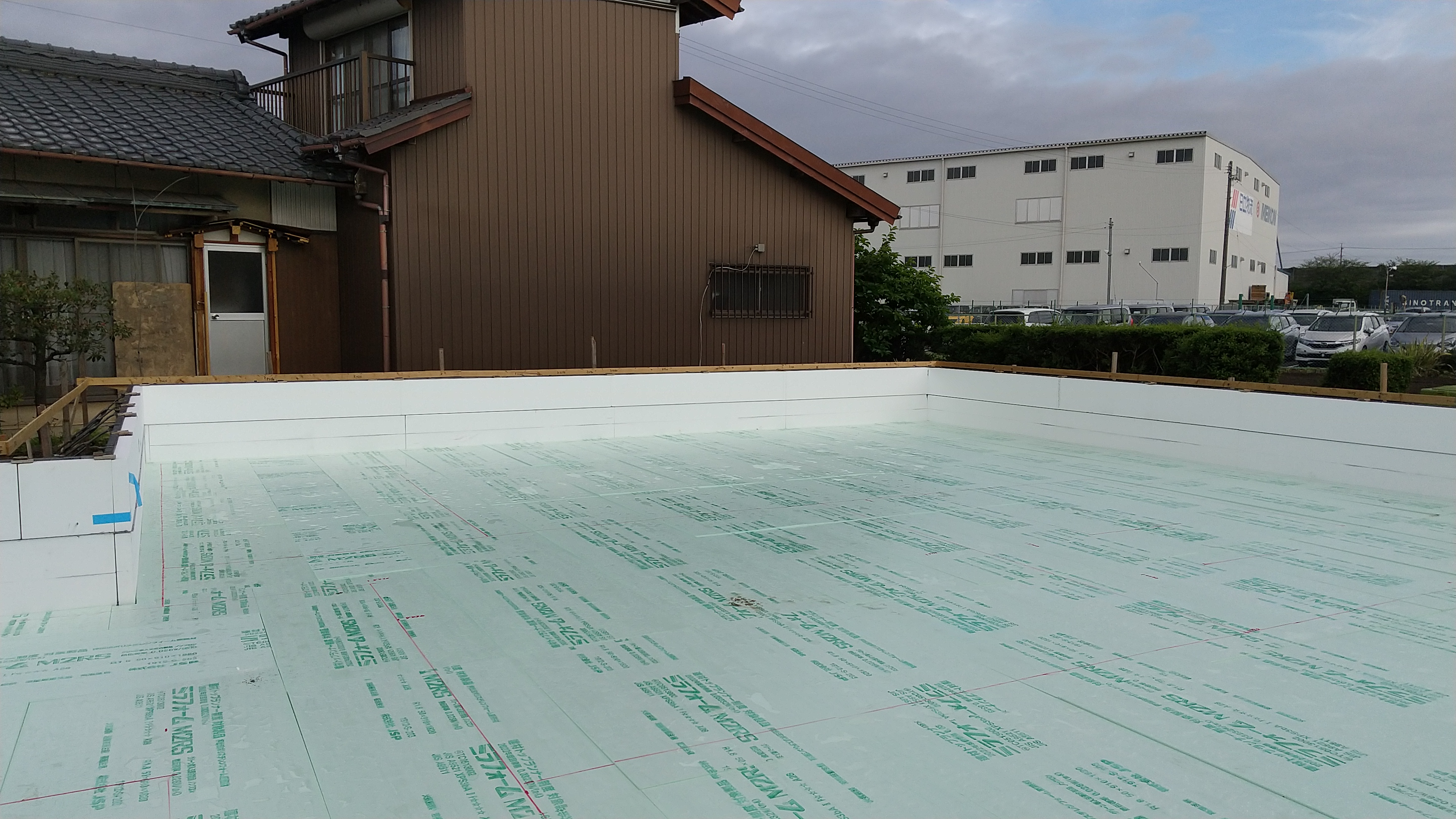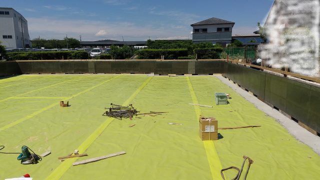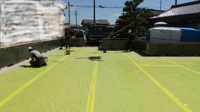 防湿シートを敷き詰め、外形型枠を組んでいきます。この日は、GW前の猛暑日。太陽の日差しと防湿シートの照り返しで、朝一番でも眩しい現場でした。シミができそ~(涙)