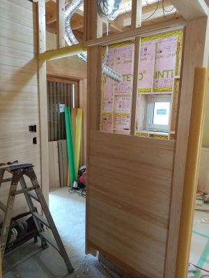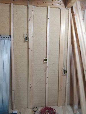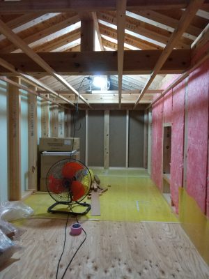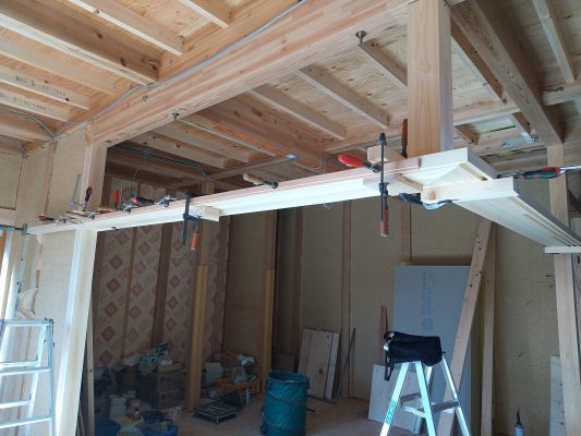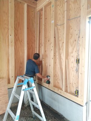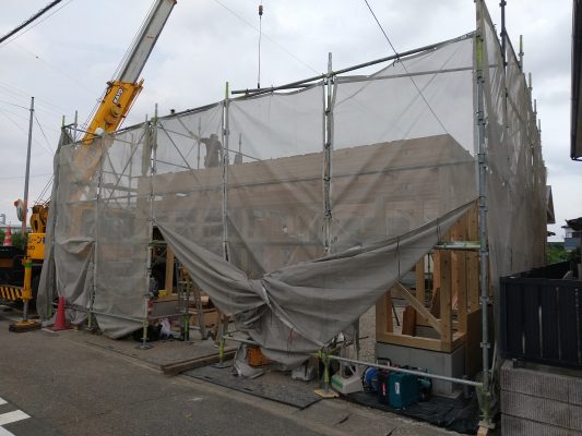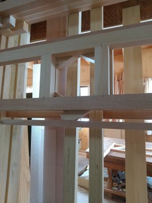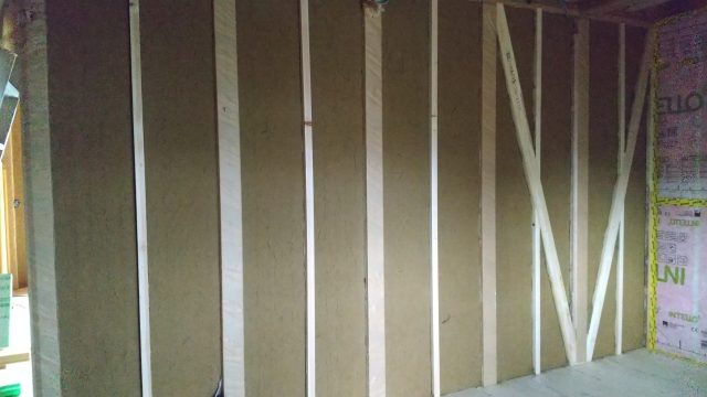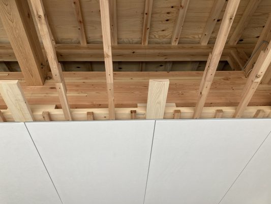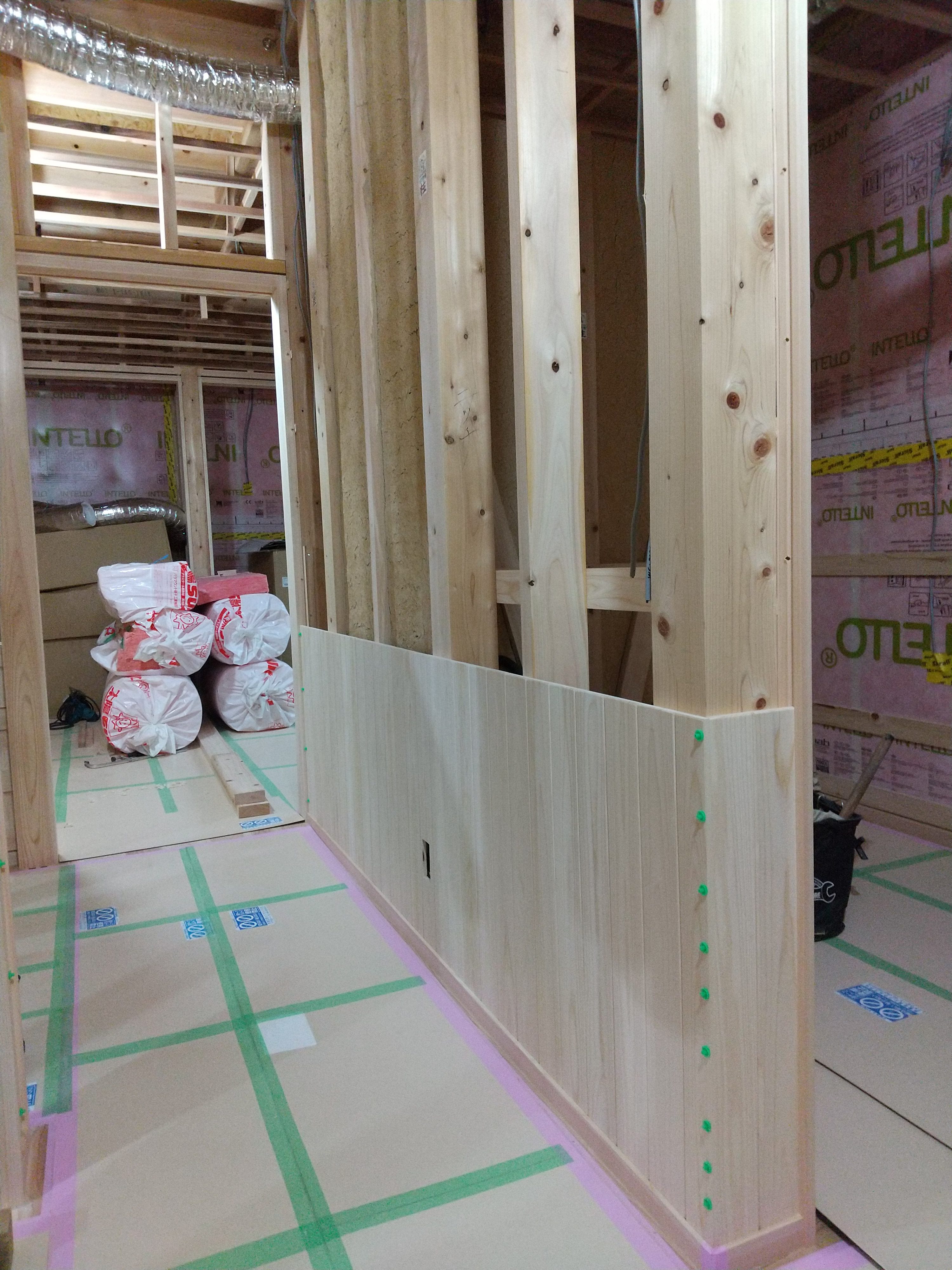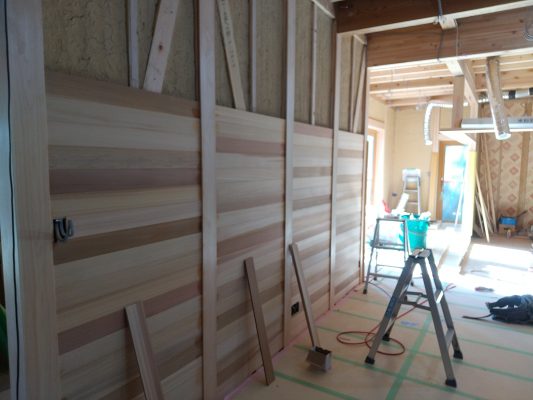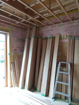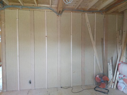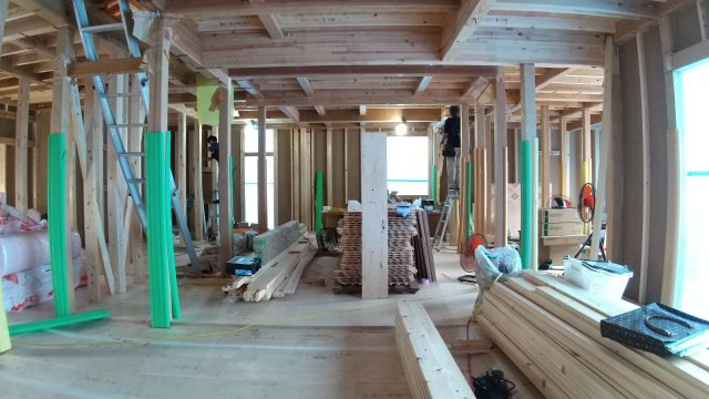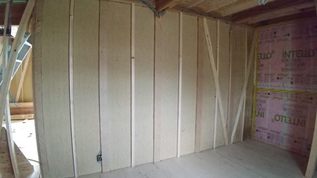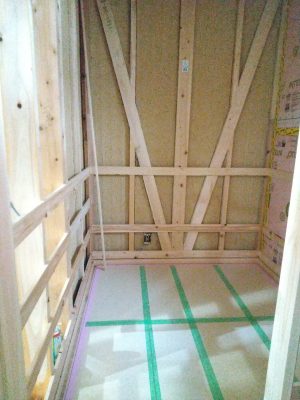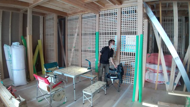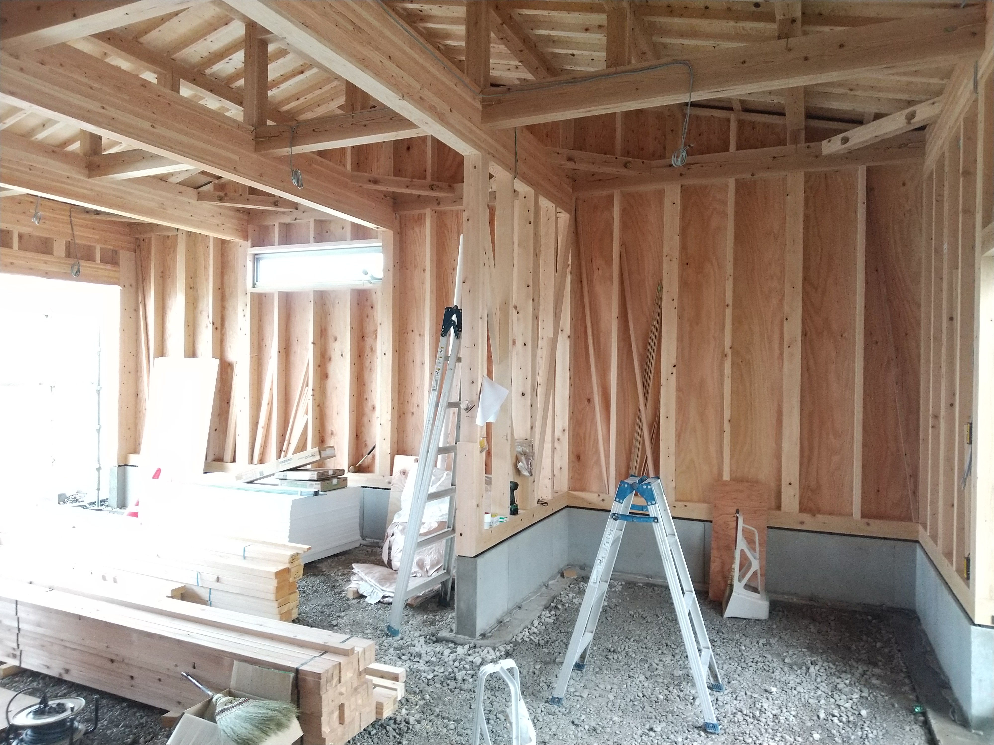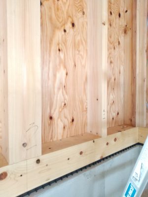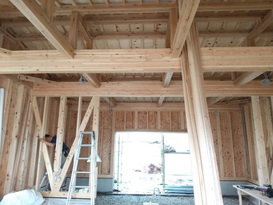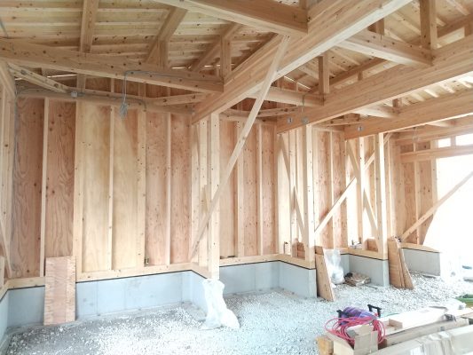 ミノワでは外部に面した耐力壁は面材を用いて、柱の間に高性能グラスウールを充填できる様にしています。内部は断熱材を施さなくても良いので、筋交いの耐力壁も用います。天気が悪いので、なかなか外の面材を張れないなぁ~とk棟梁が嘆いています。
