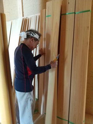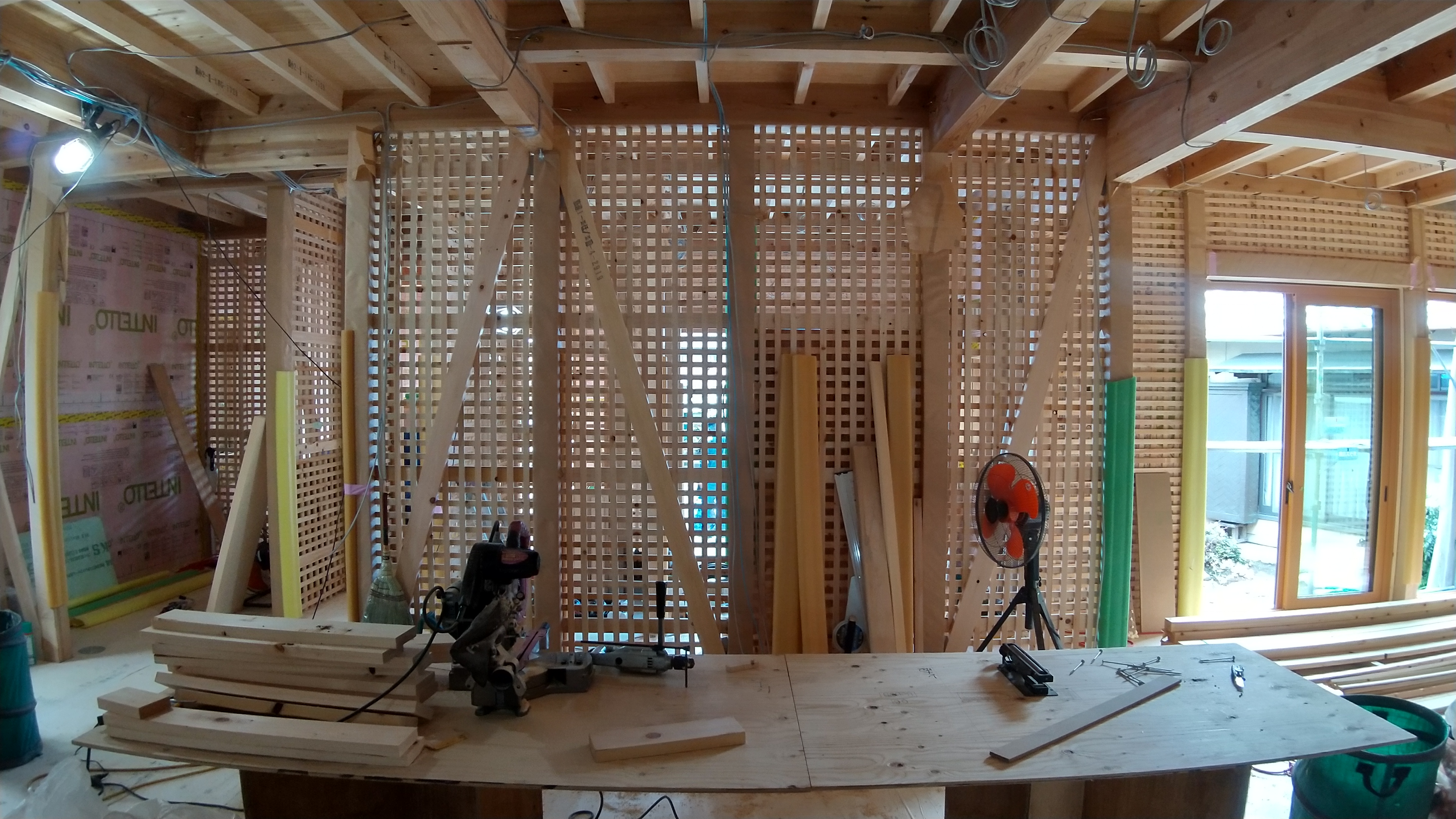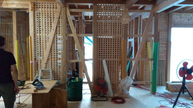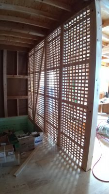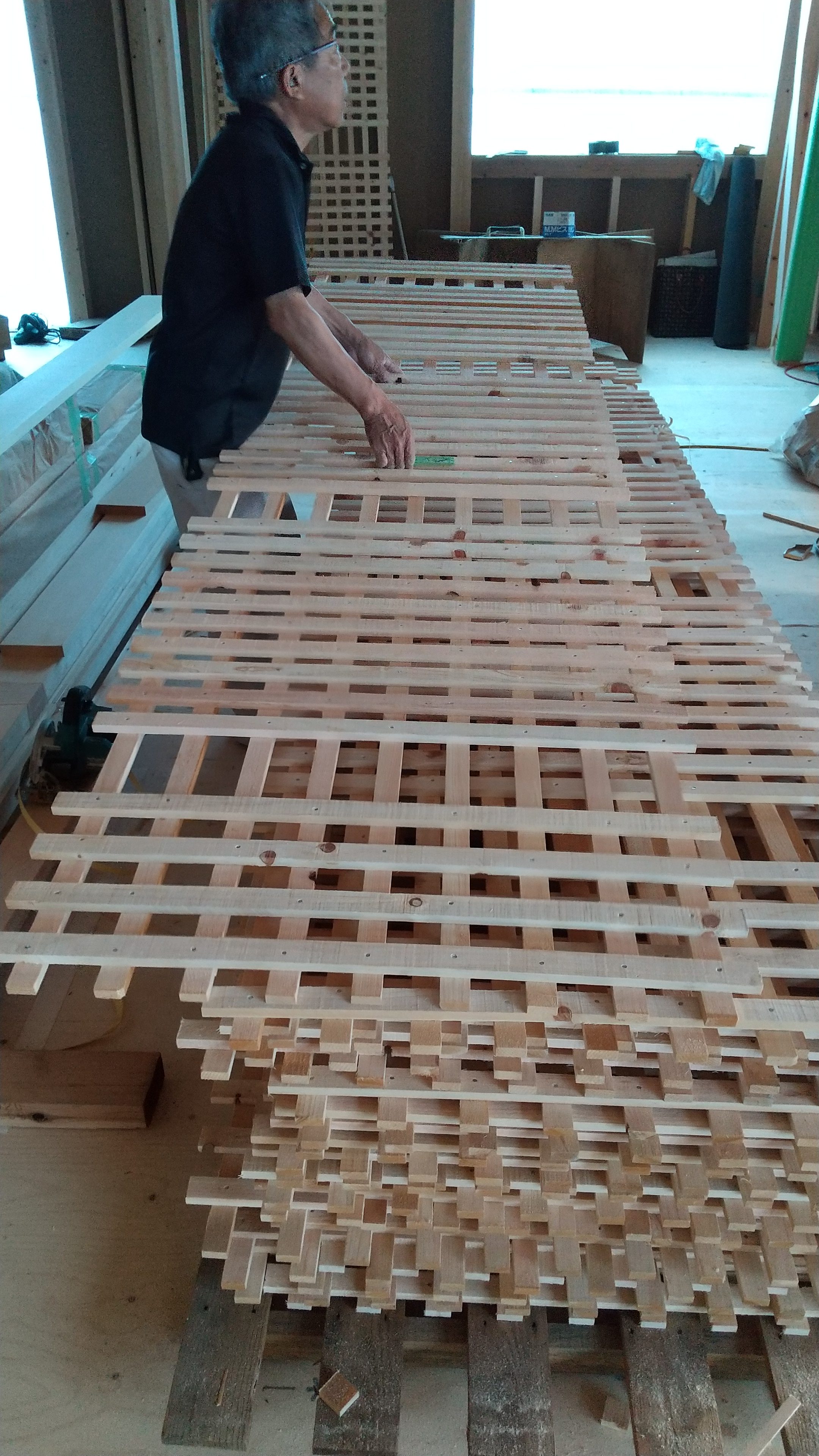今日は愛弟子のh君は他の現場に駆り出されているので、k棟梁は一人寂しく小舞を取り付けていました。小舞は昔は竹を組んでいましたが虫が発生する為、ミノワではヒノキを組んでいます。こちらも、棟梁が上棟前に白川の加工場でサイズの違う壁毎に造っておいたものです。小舞が設置された壁は簾戸の様で、暑い今日は涼しげに感じました。