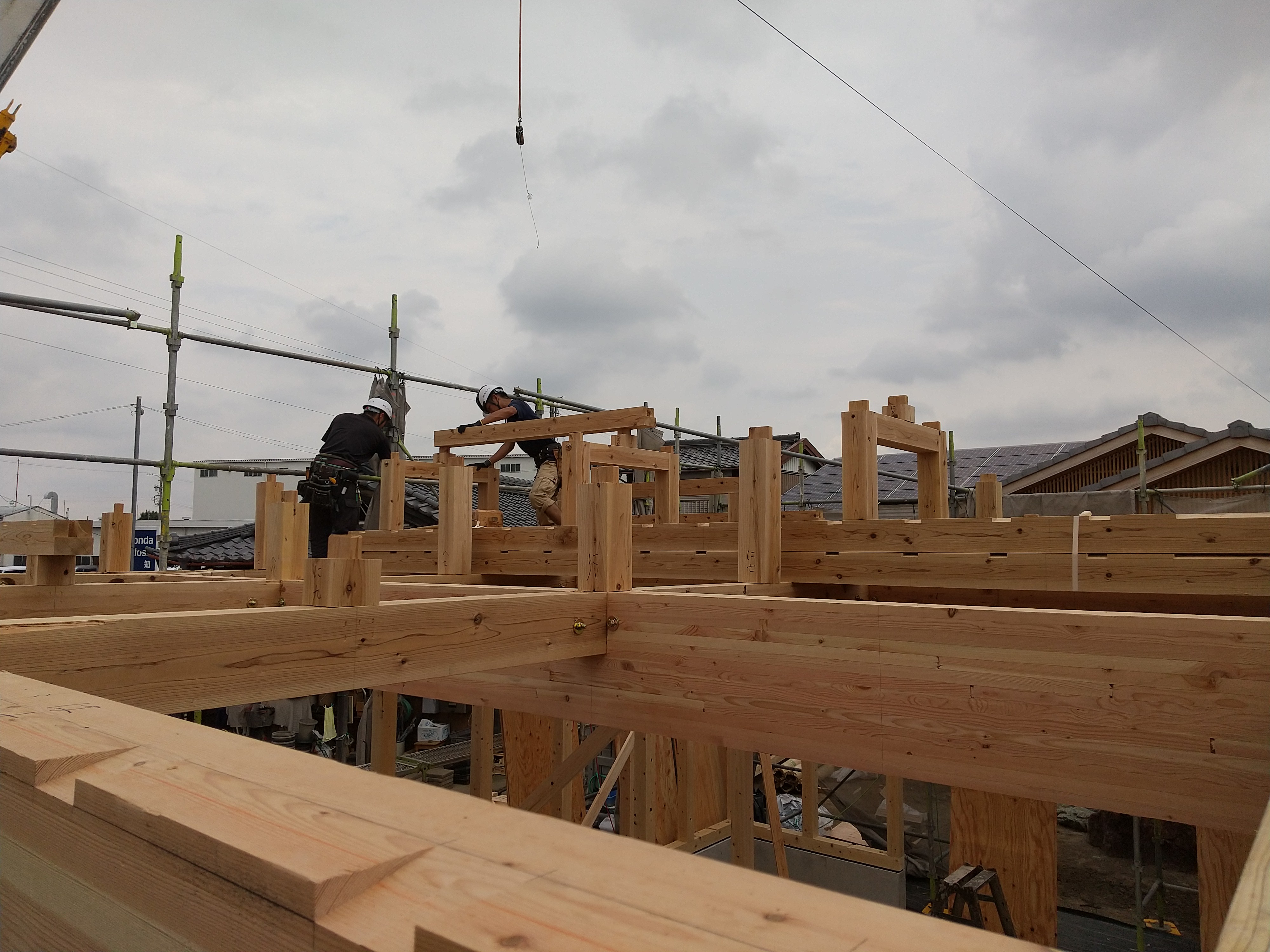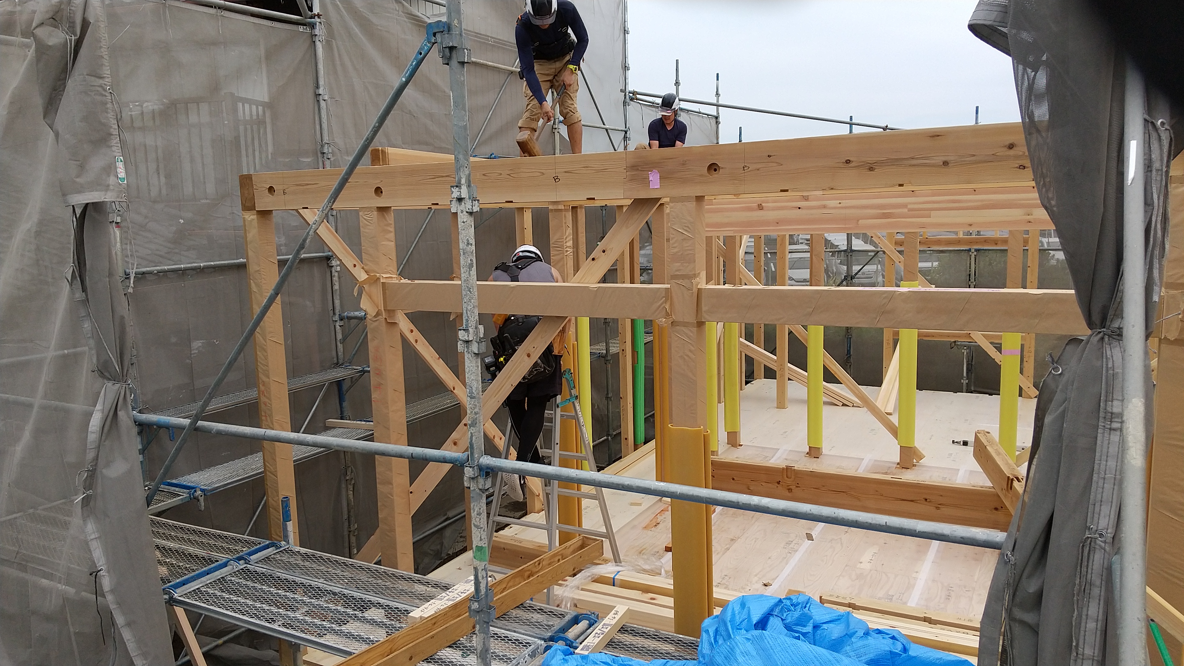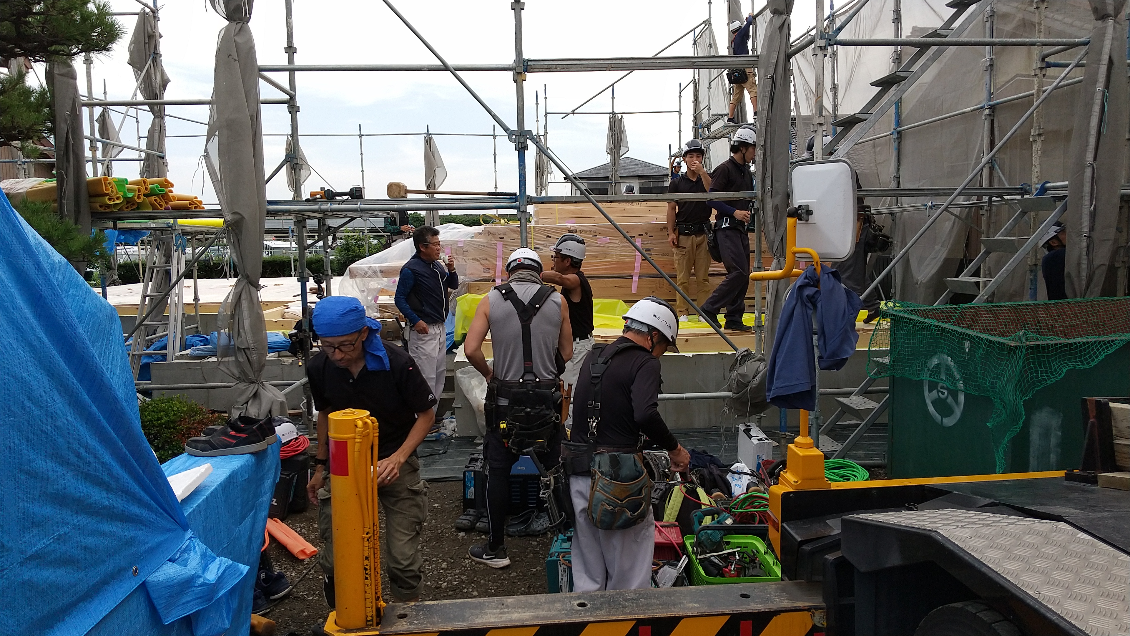 さて雲行きがまだ怪しいので、先を急ぎます。棟梁が大きな声で指示する事もなく、若手大工さんは力仕事を着々とこなして行きます。頼もしいです。雨が再び降ってこないうちに終われそうで安心です。上棟もよろしくお願いします。