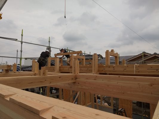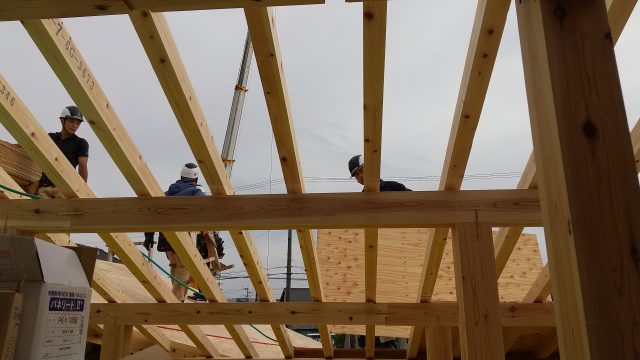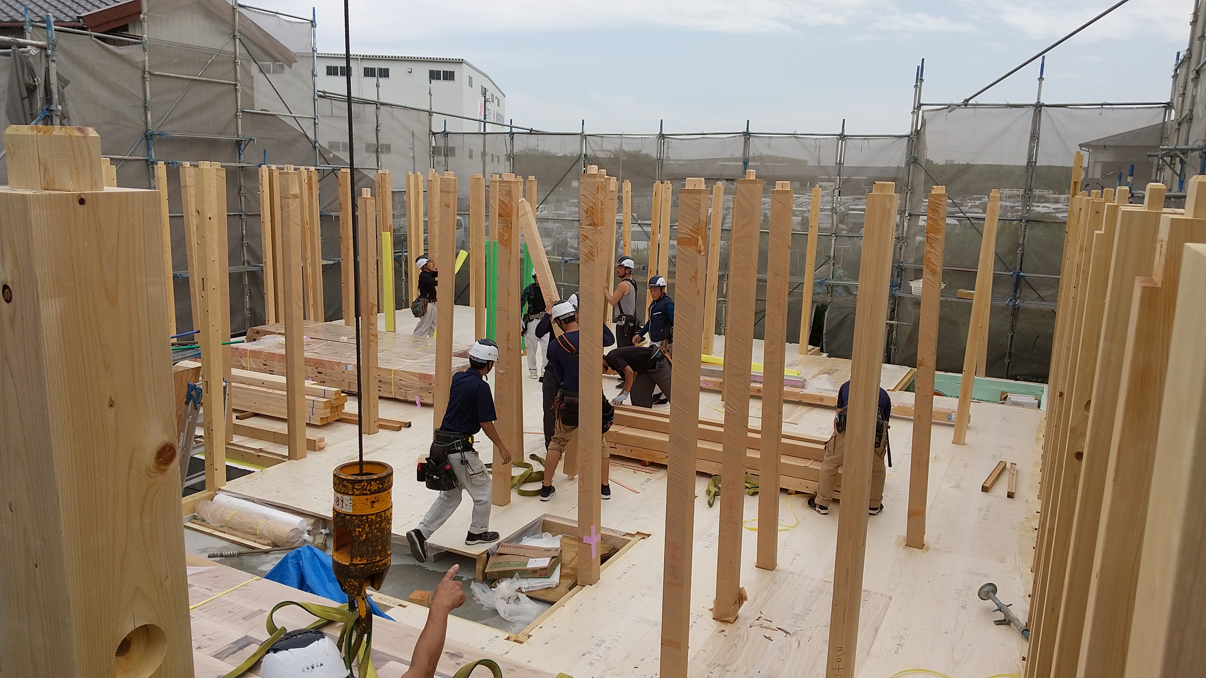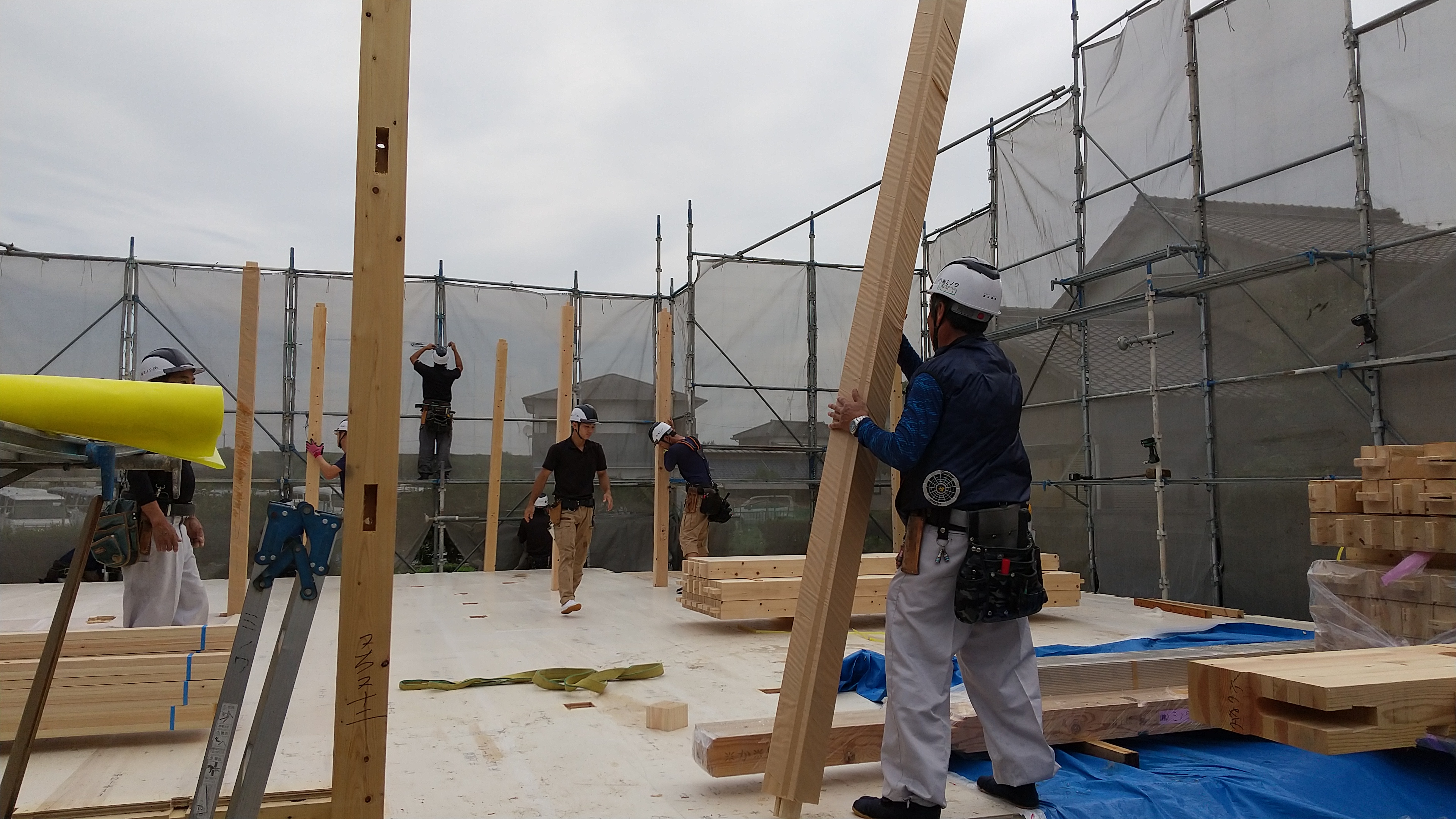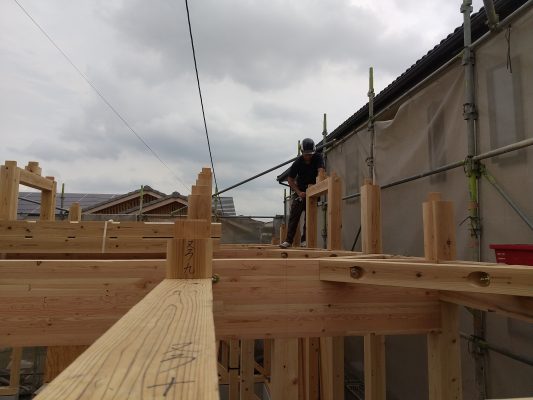 さて雲行きがまだ怪しいので、先を急ぎます。棟梁が大きな声で指示する事もなく、若手大工さんは力仕事を着々とこなして行きます。頼もしいです。雨が再び降ってこないうちに終われそうで安心です。上棟もよろしくお願いします。