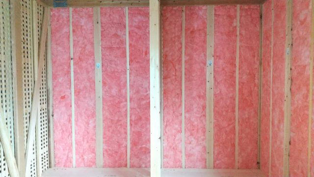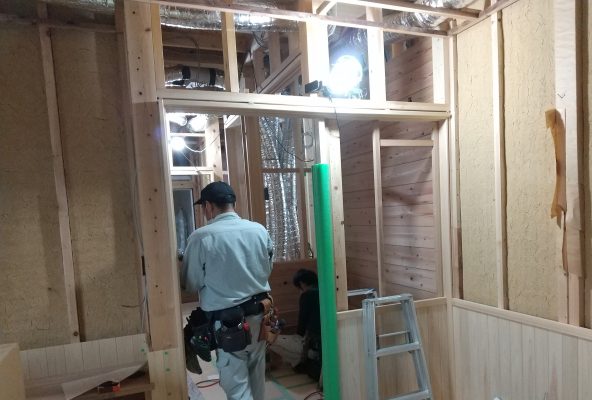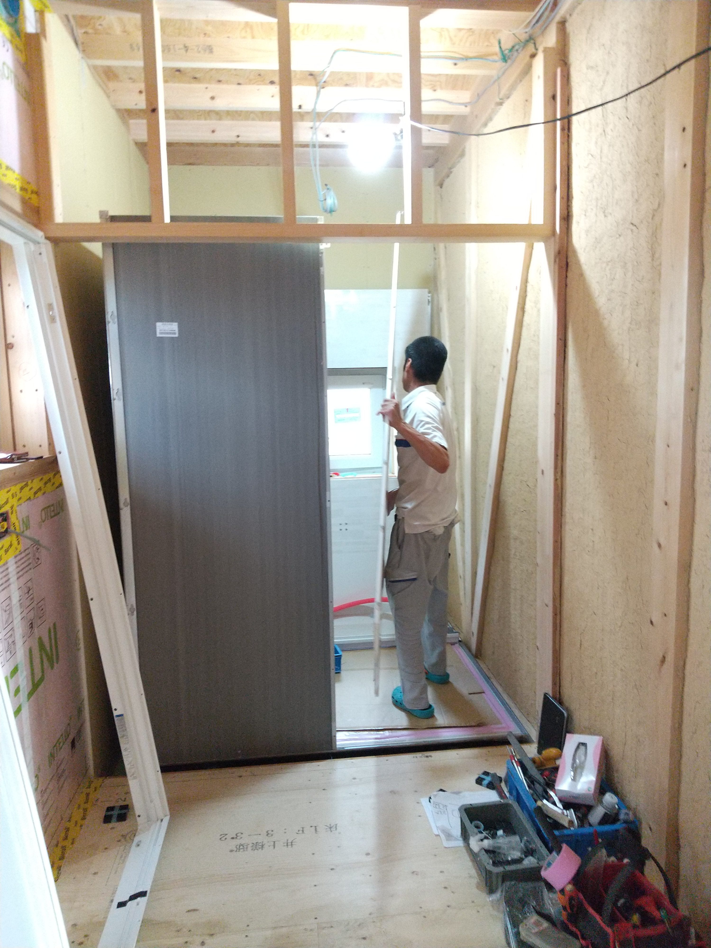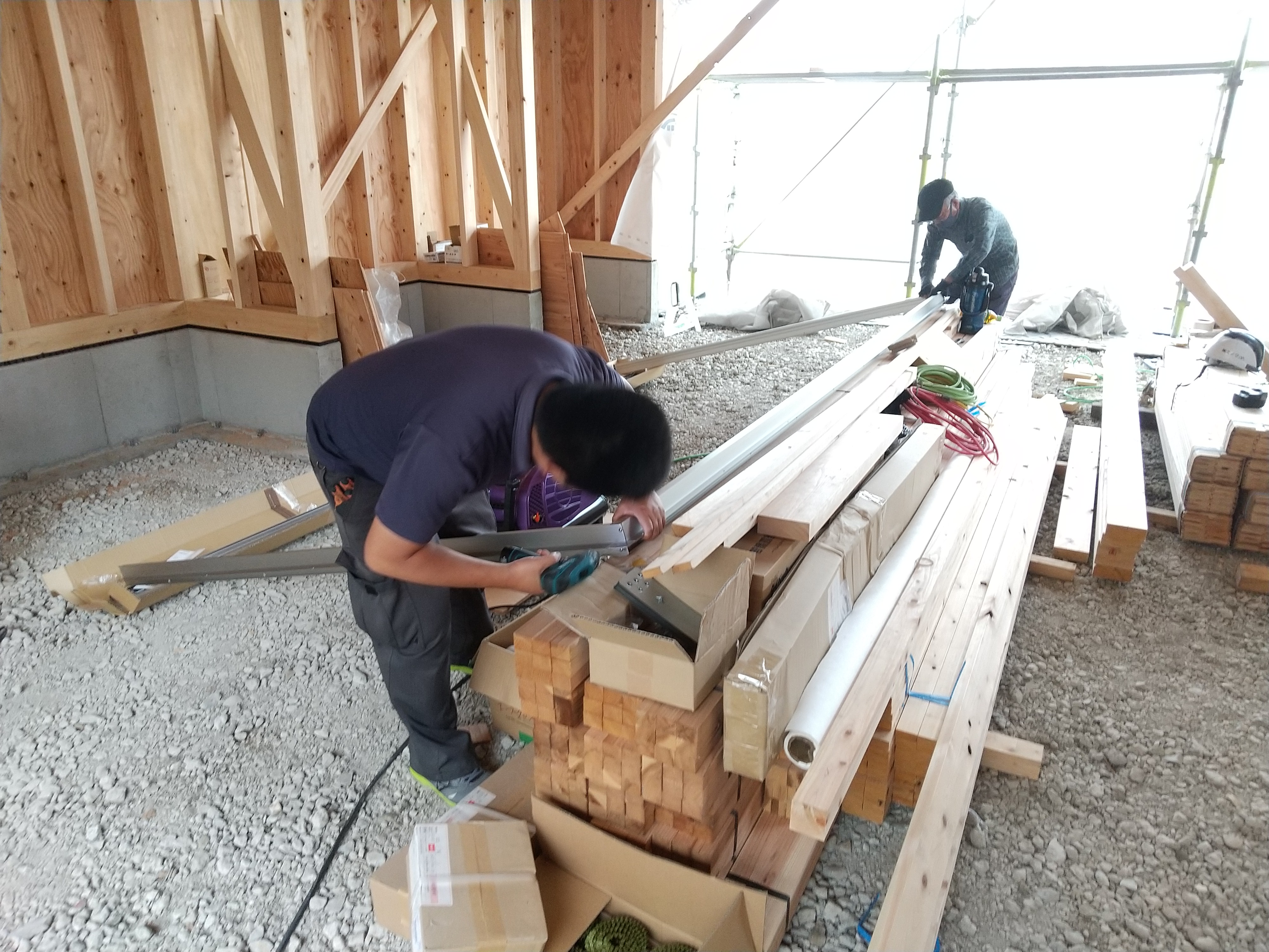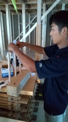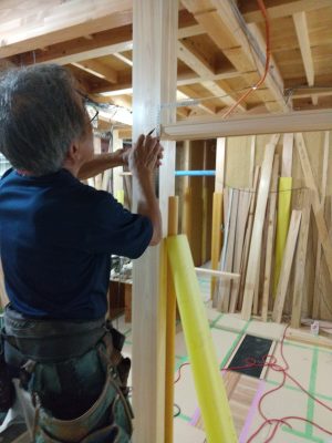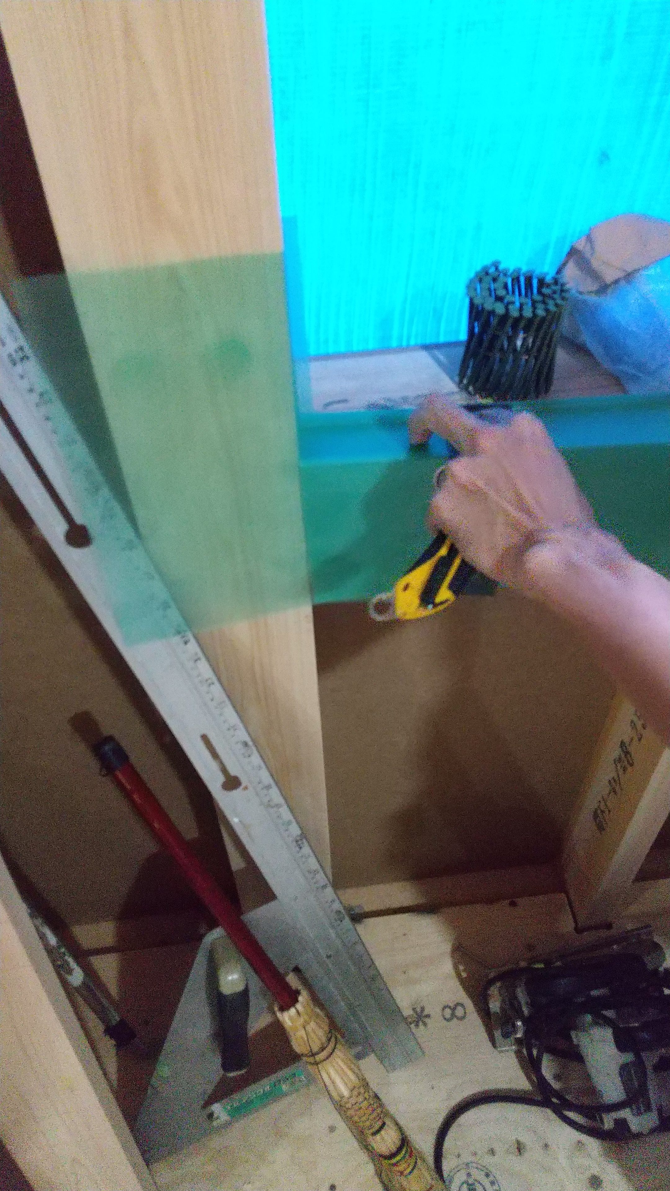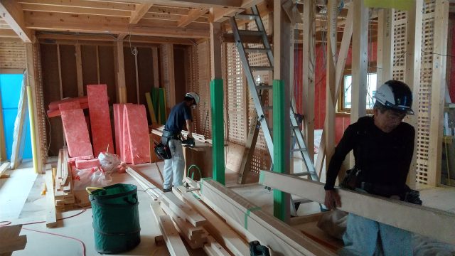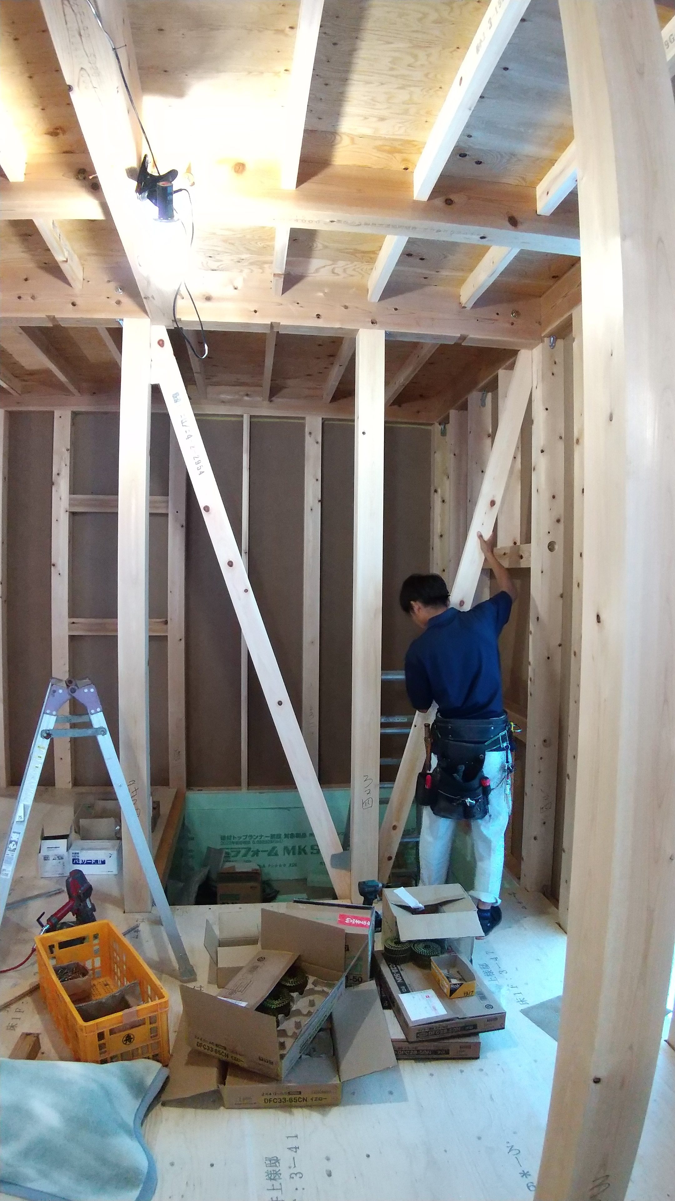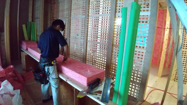 大雨が降っている中、内部ではh谷川君が高性能グラスウールの充填、k棟梁が内壁の間柱の取付を行っています。h谷川君は、グラスウールを潰さず施工する為に一部壁内部にある下地分をサシガネをあてて器用にカットします。