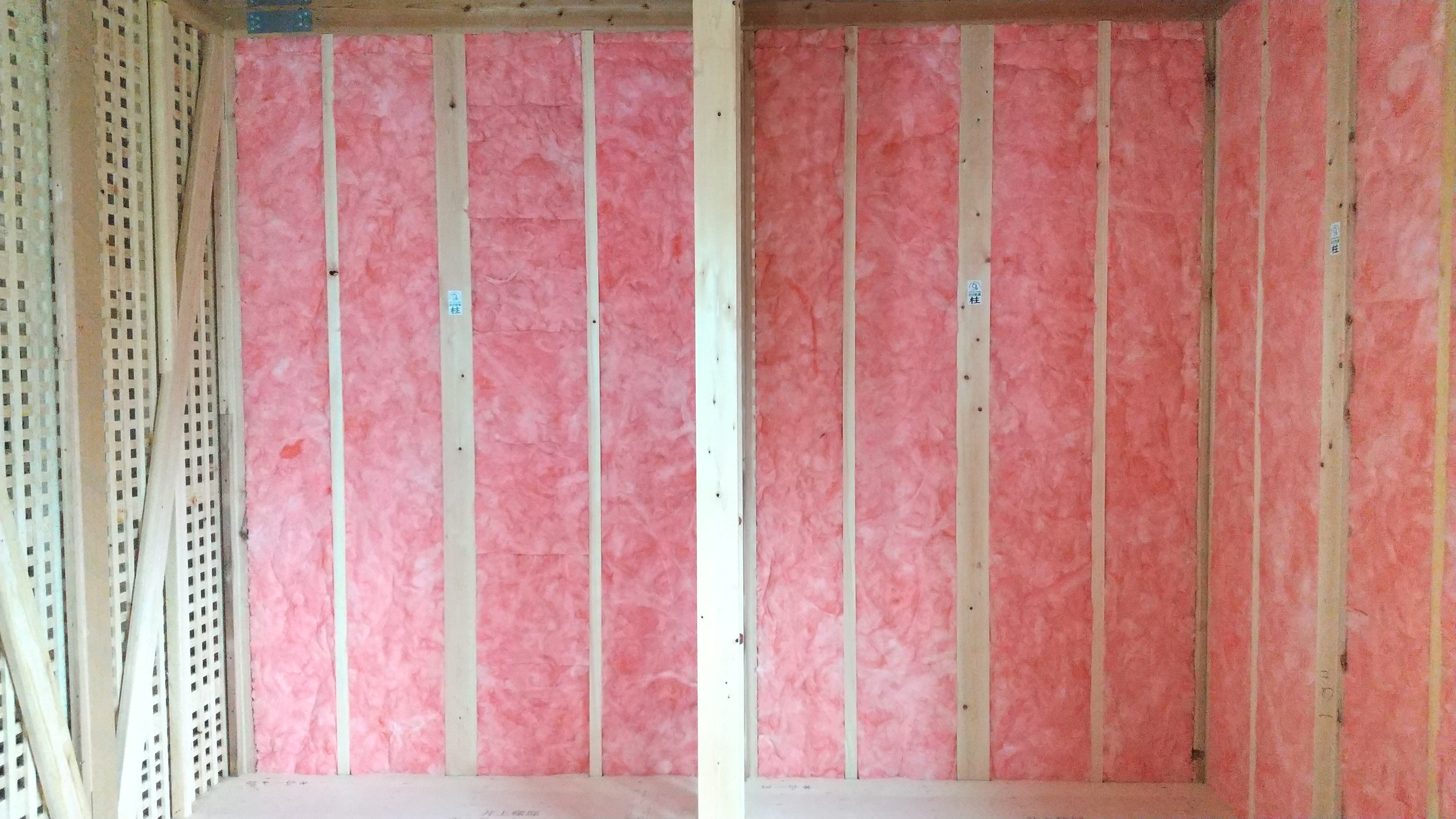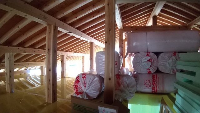 高性能グラスウールも隙間なくしっかりと充填施工されています。きちんとした仕事は、見た目もきれいですね。高性能グラスウールは、通常のグラスウールよりも細かい為、空気室(繊維の間に空気を閉じ込めた空間)が小さくなり、対流(空気の動き)がおきにくくなるため、高い断熱性能があります。ガラスが主材料なので、水を吸収してしまう事もありません。燃える事もなく(不燃)、火災時には延焼を防ぎ、有害ガスも発生しません。昔の施工不良で良いイメージを持たれていないグラスウールですが、実はとても性能が良く環境によい商品なのです。h谷川君の施工なら安心ですね。