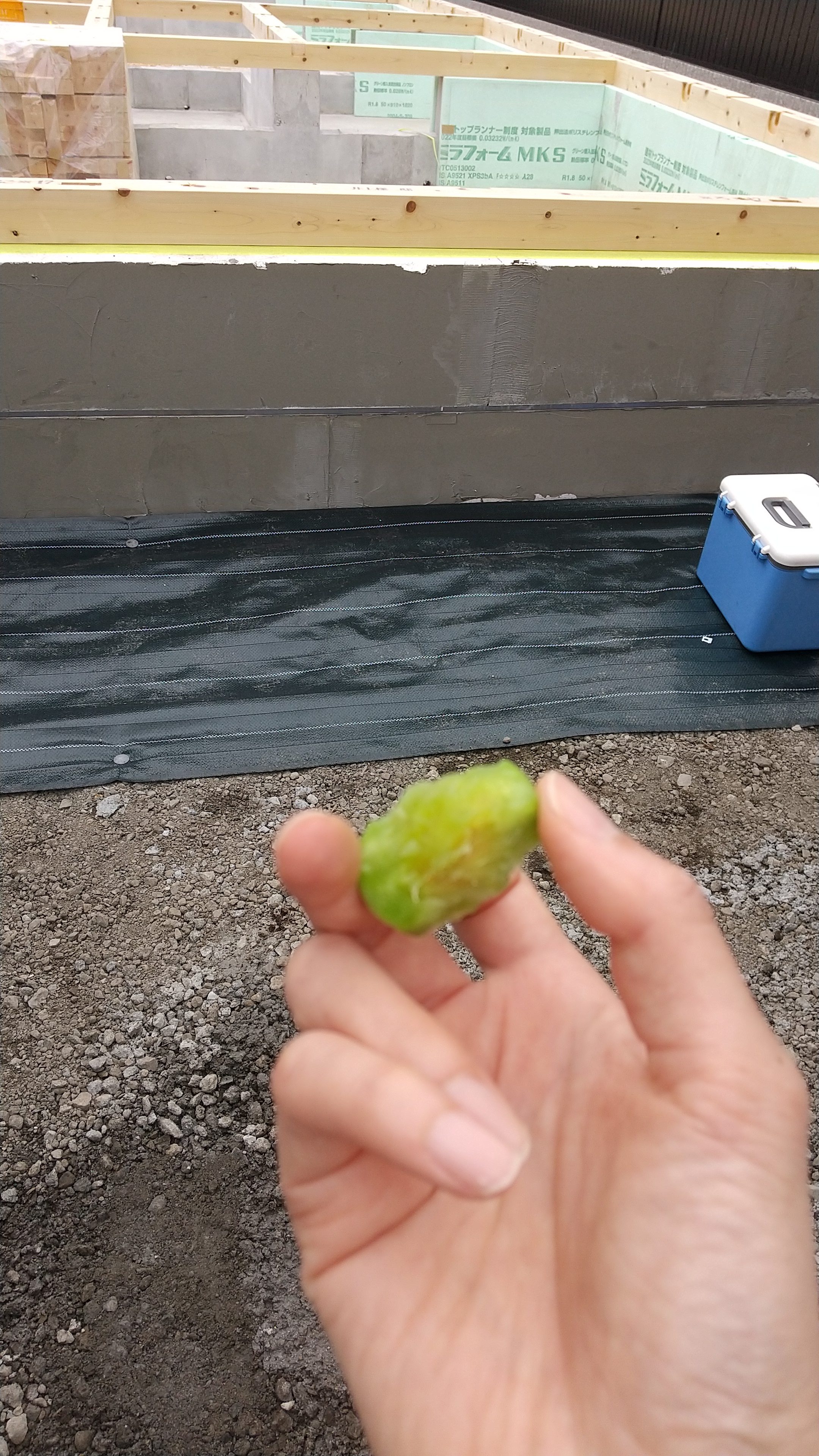 10時頃は小雨が降り始め、雲行きが怪しくなりましたが、現地に駆け付けると雨が上がり「やっぱり晴れ女です」と自画自賛していると、k棟梁が苦笑しながら採れたての生梅をお裾分けしてくださいました。食べたことが無い若手大工k君、h君も、私に無理やり誘われ、渋い顔をして一緒にいただきました(笑)。初めて生で食べましたが、やっぱり酸っぱいんですね。良い梅酒になりそうな梅でした。ほとんど食べてしまった汚い写真でゴメンナサイ。