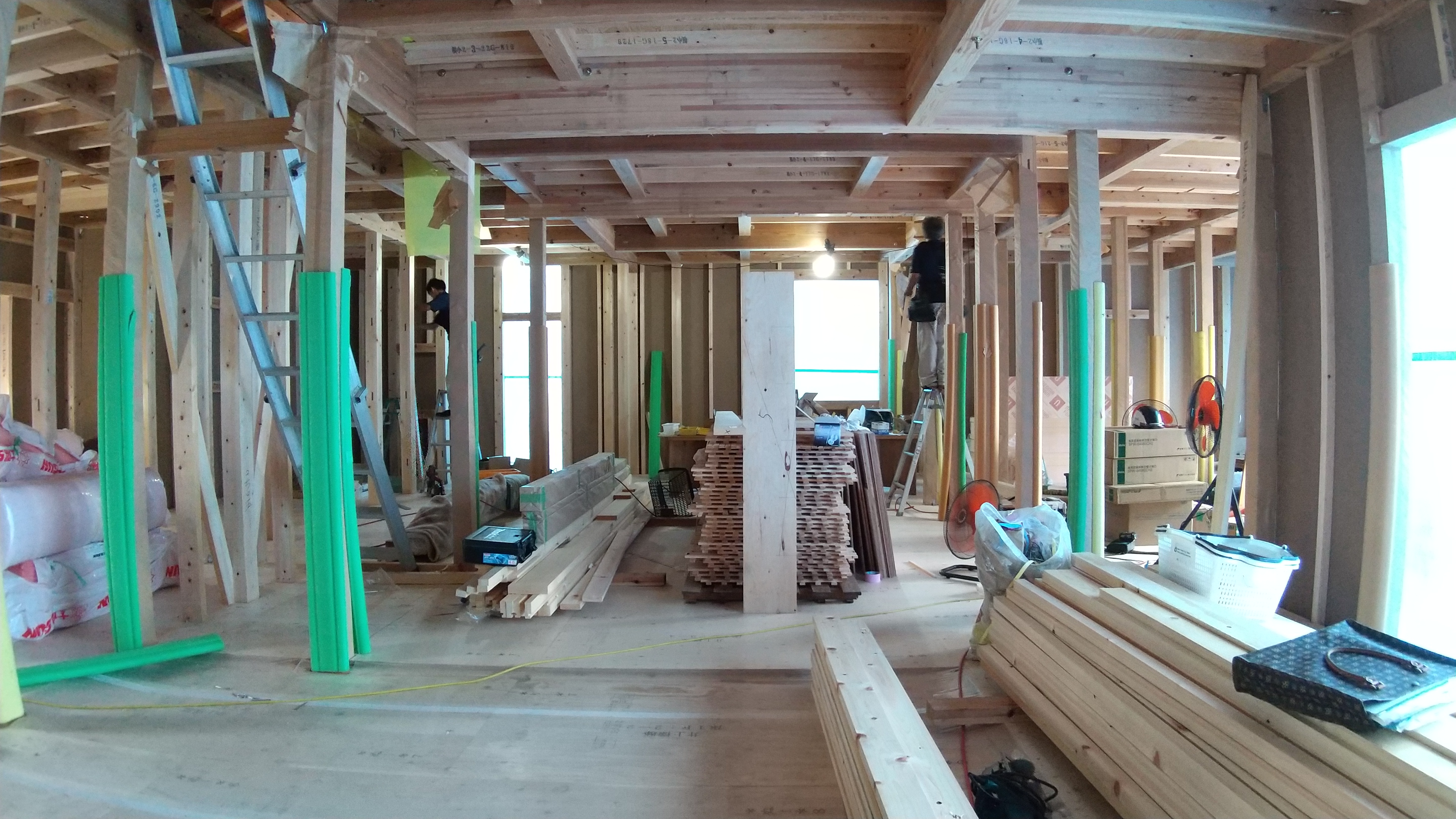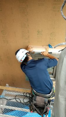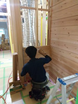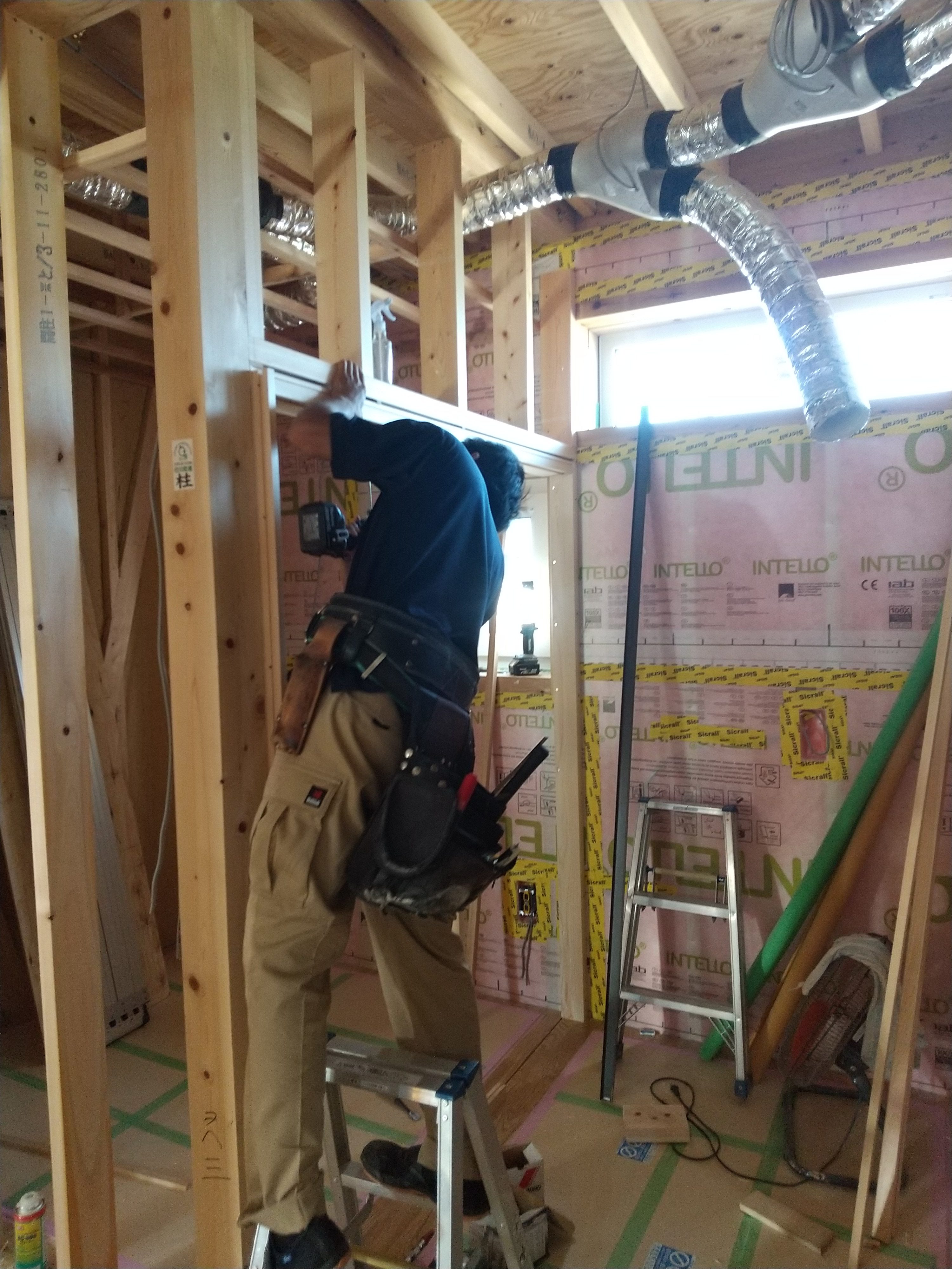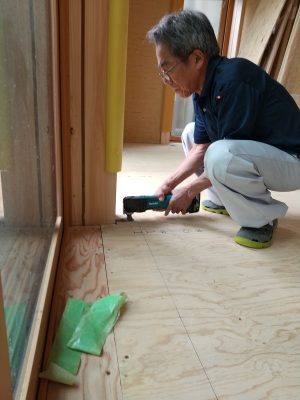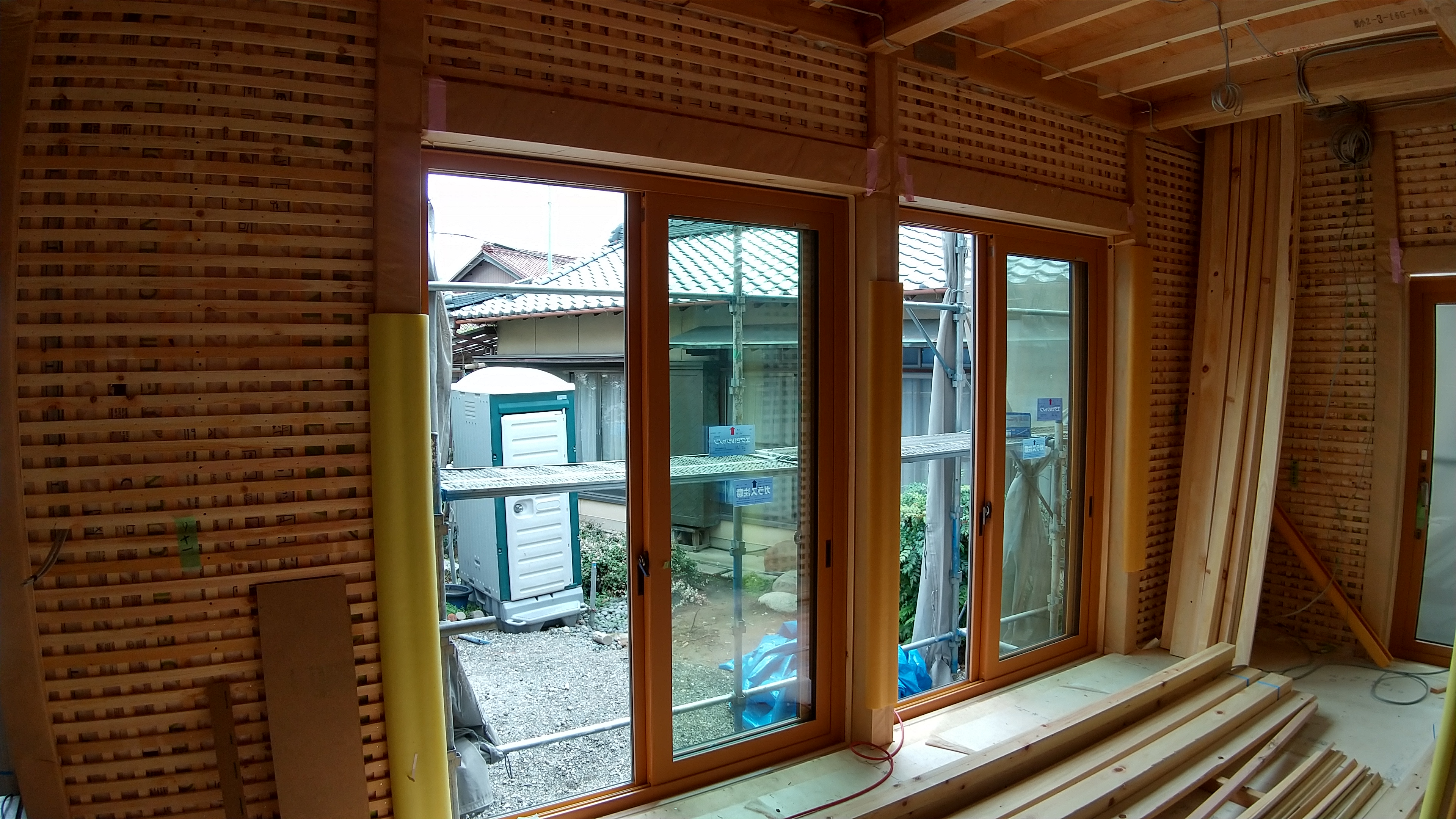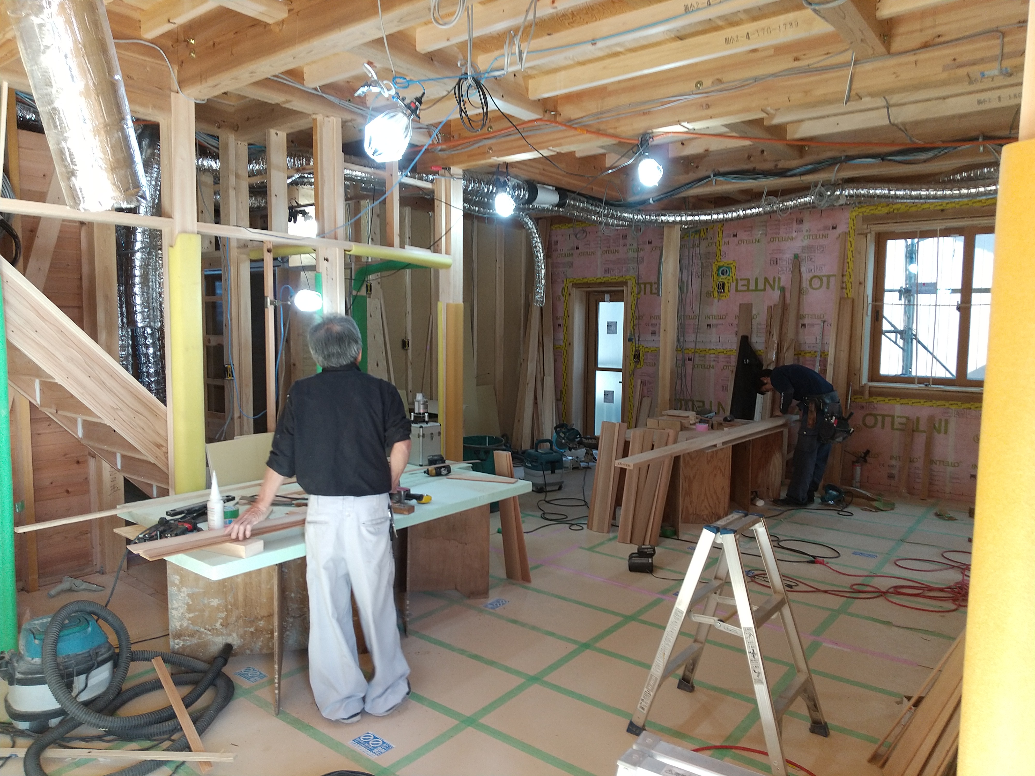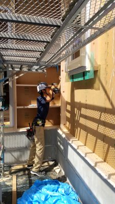 今日は、k棟梁は耐力面材を取り付け、h谷川君はサッシを取り付けていました。f井電気のh場さんも到着し、i様のお母様は工事が進んでいる様子を見られて喜んでみえました。