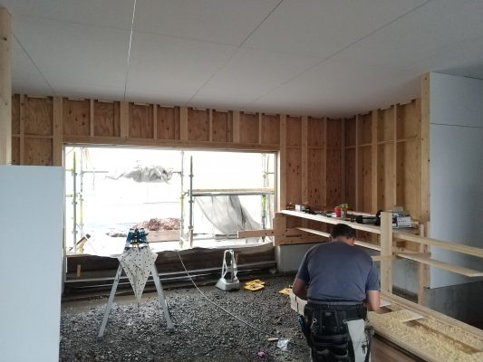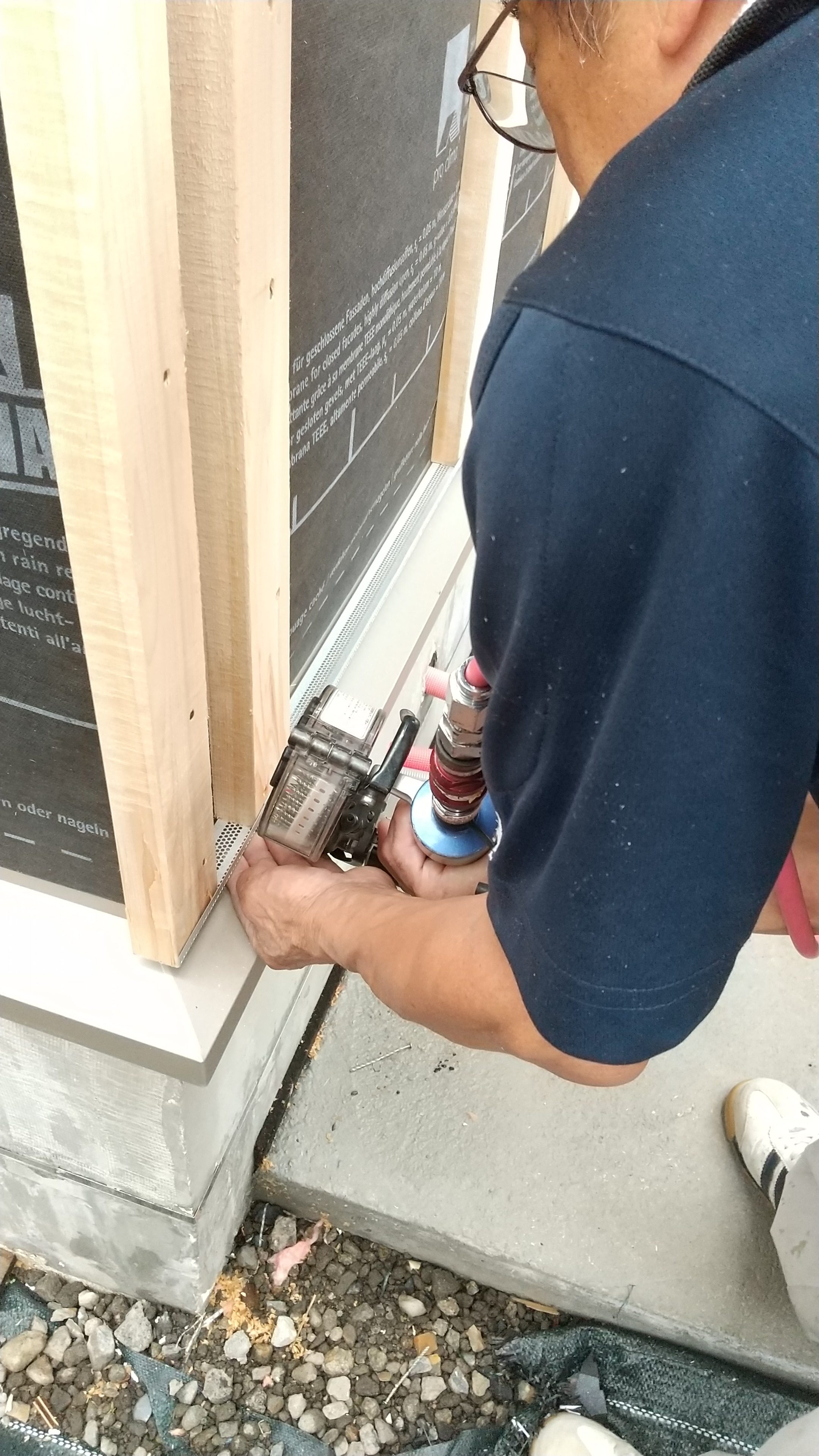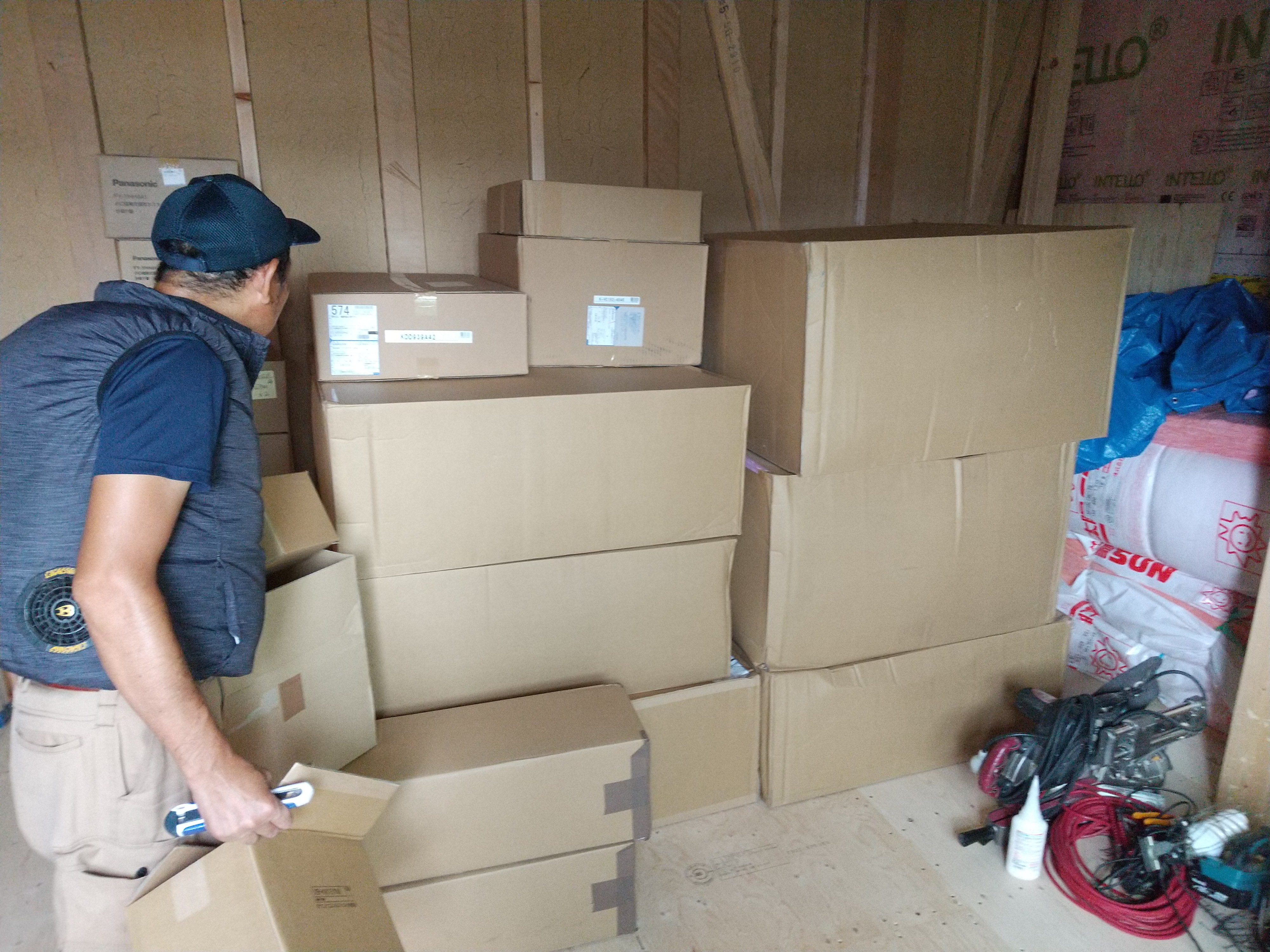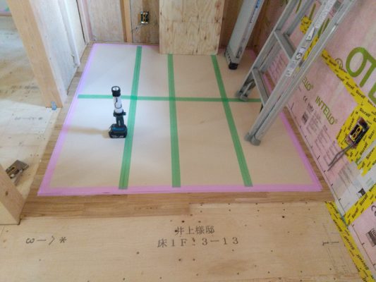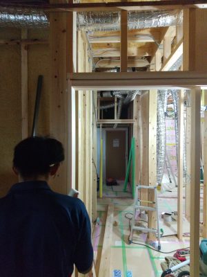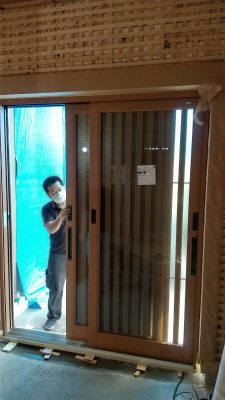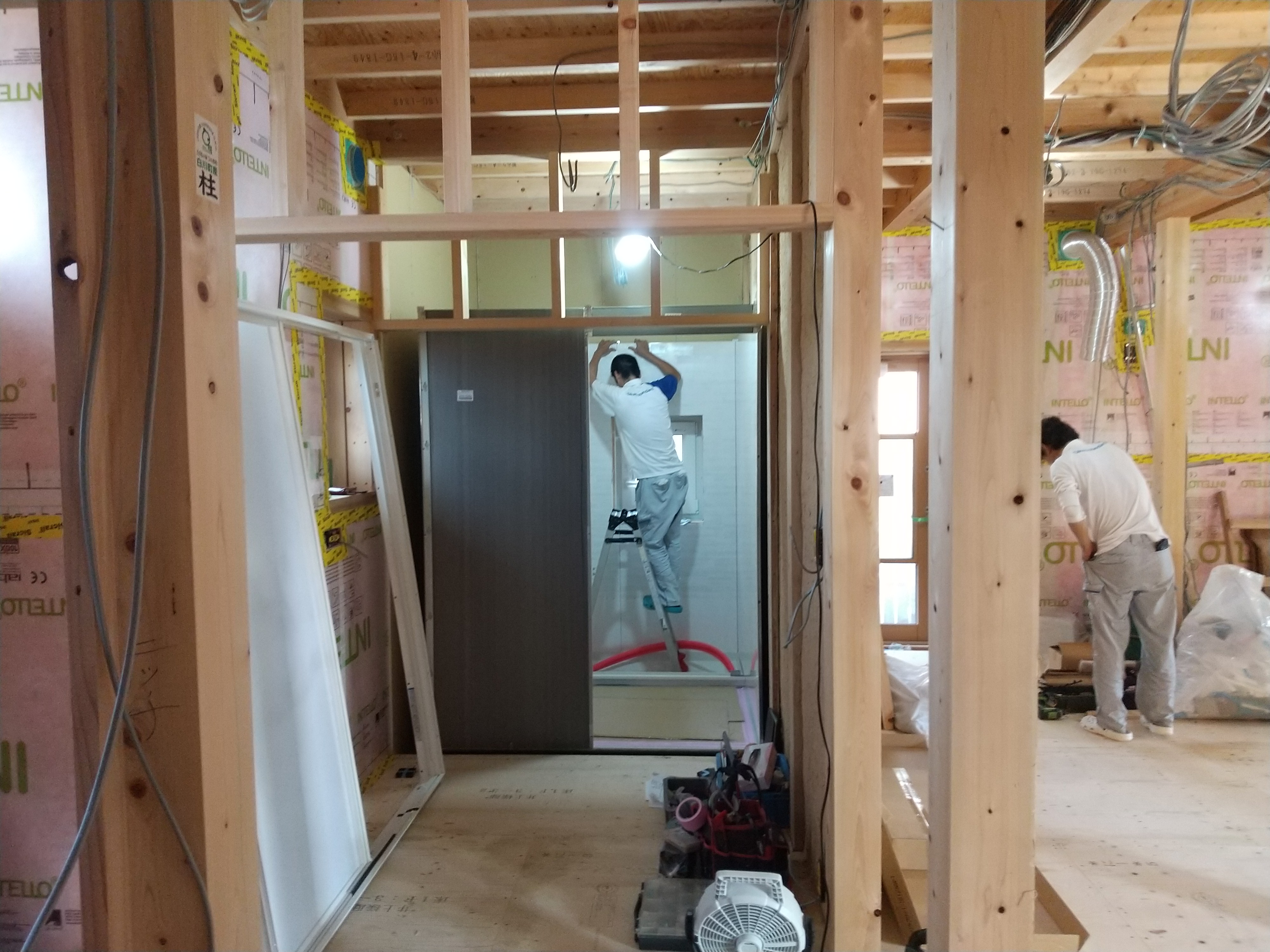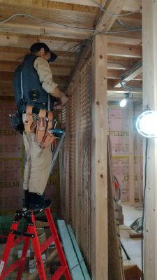 今日は、k棟梁は耐力面材を取り付け、h谷川君はサッシを取り付けていました。f井電気のh場さんも到着し、i様のお母様は工事が進んでいる様子を見られて喜んでみえました。
