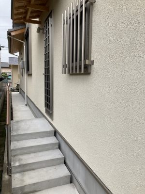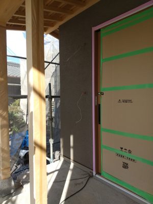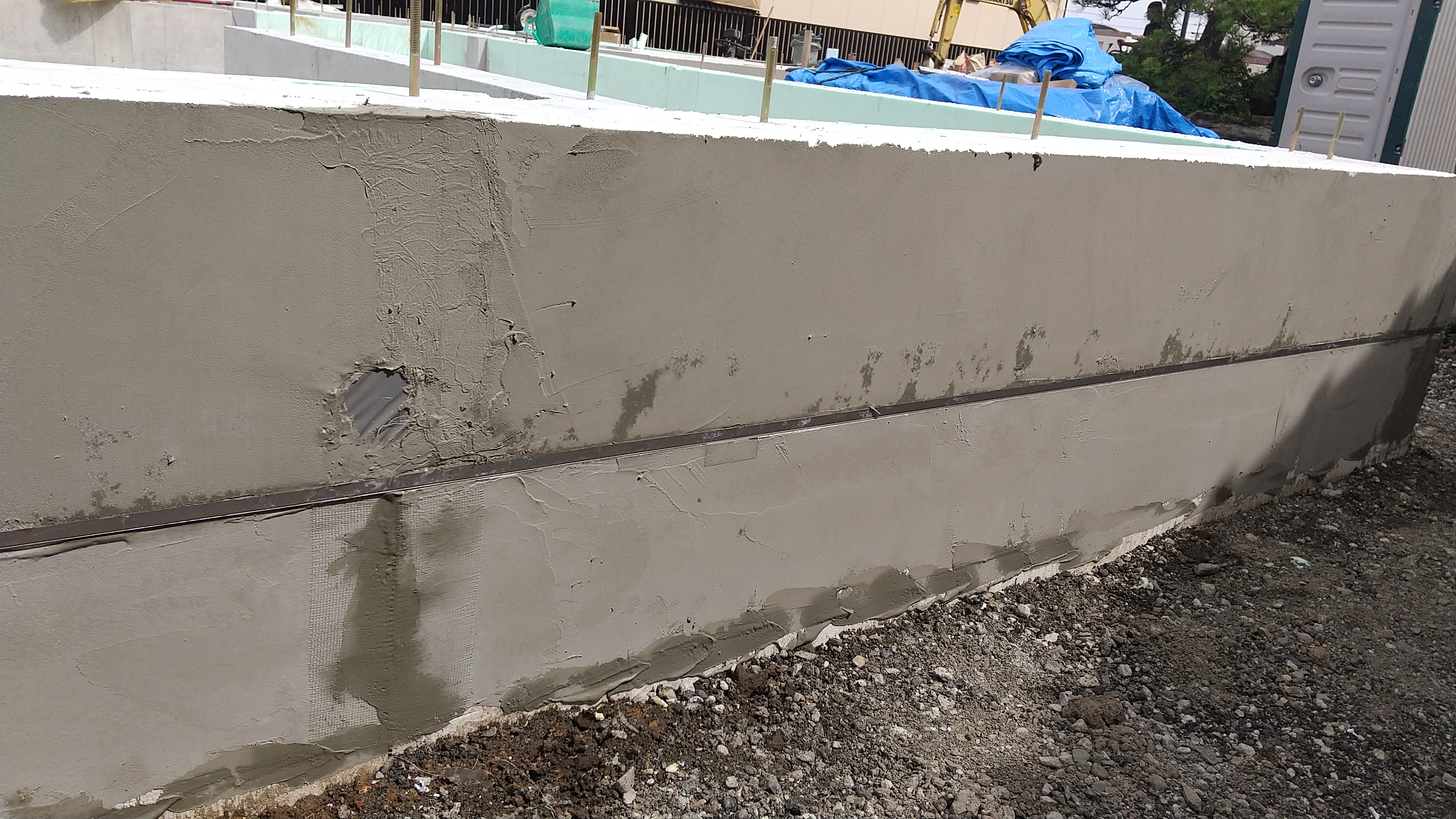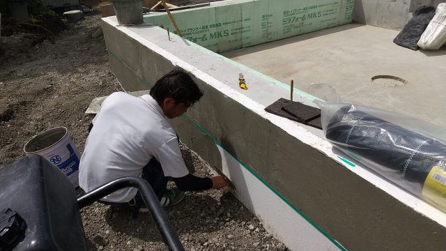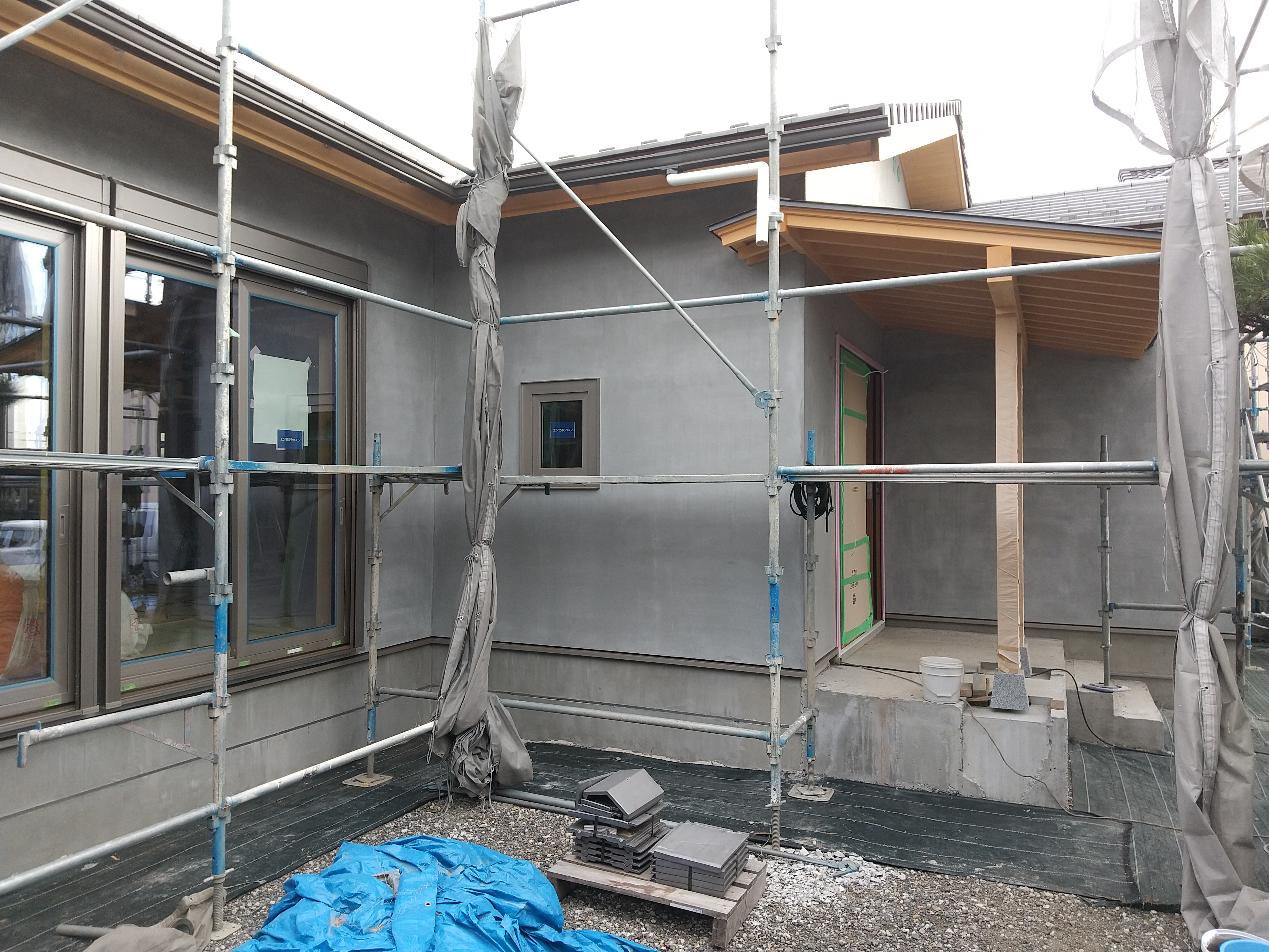 型枠を外してから雨が続き、本日雨があがりましたので、基礎の立上りの下地の樹脂モルタルを塗り、玄関ポーチもコンクリートを打ちました。一旦、基礎工事はこれで終了、来週から木工事の始まりです。