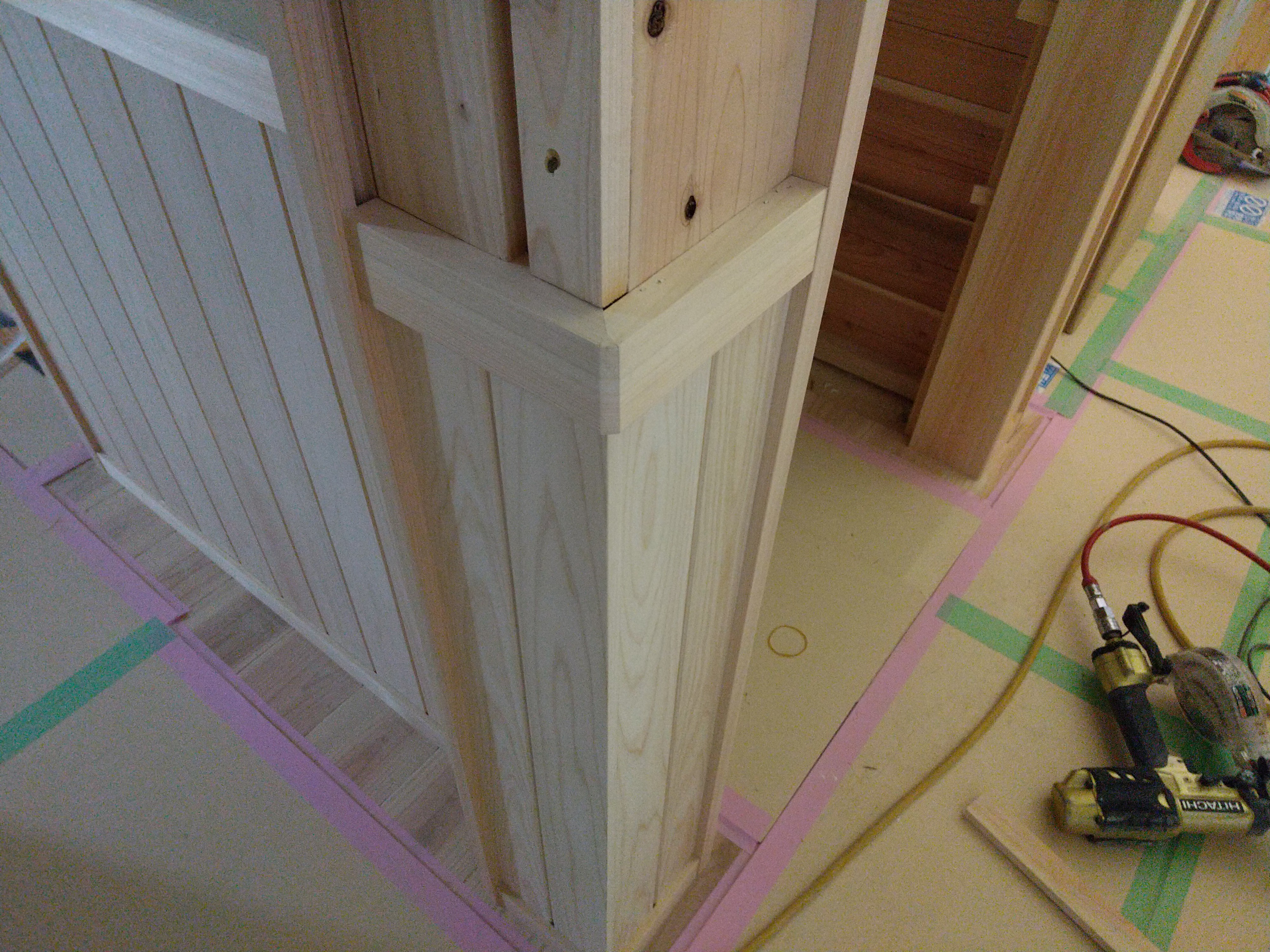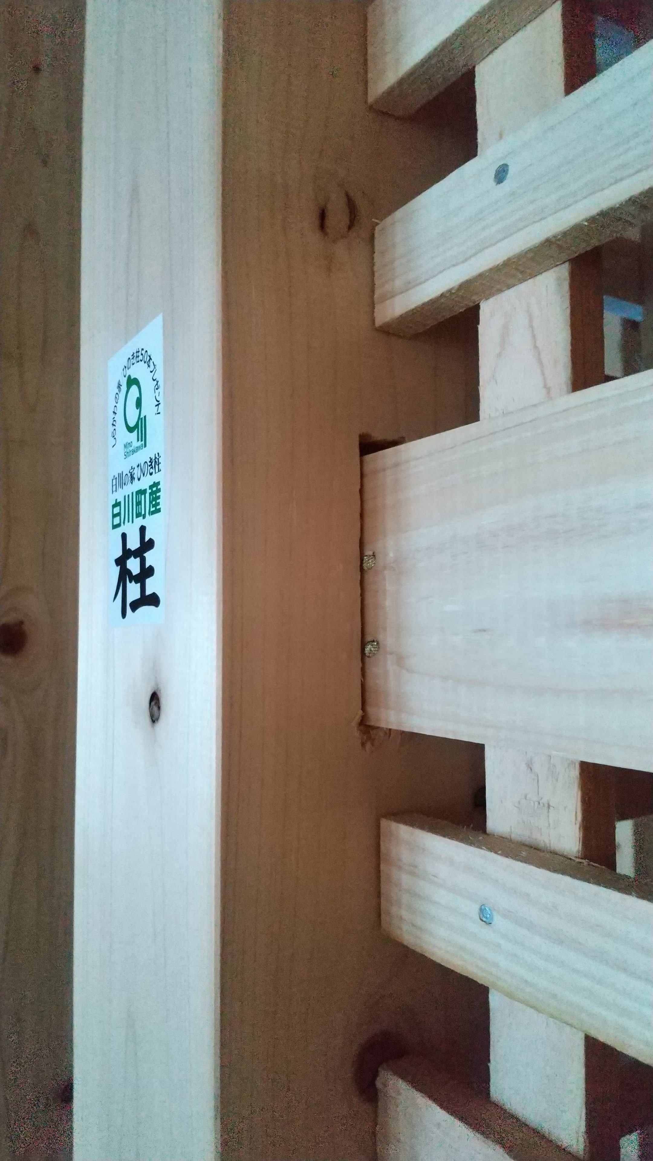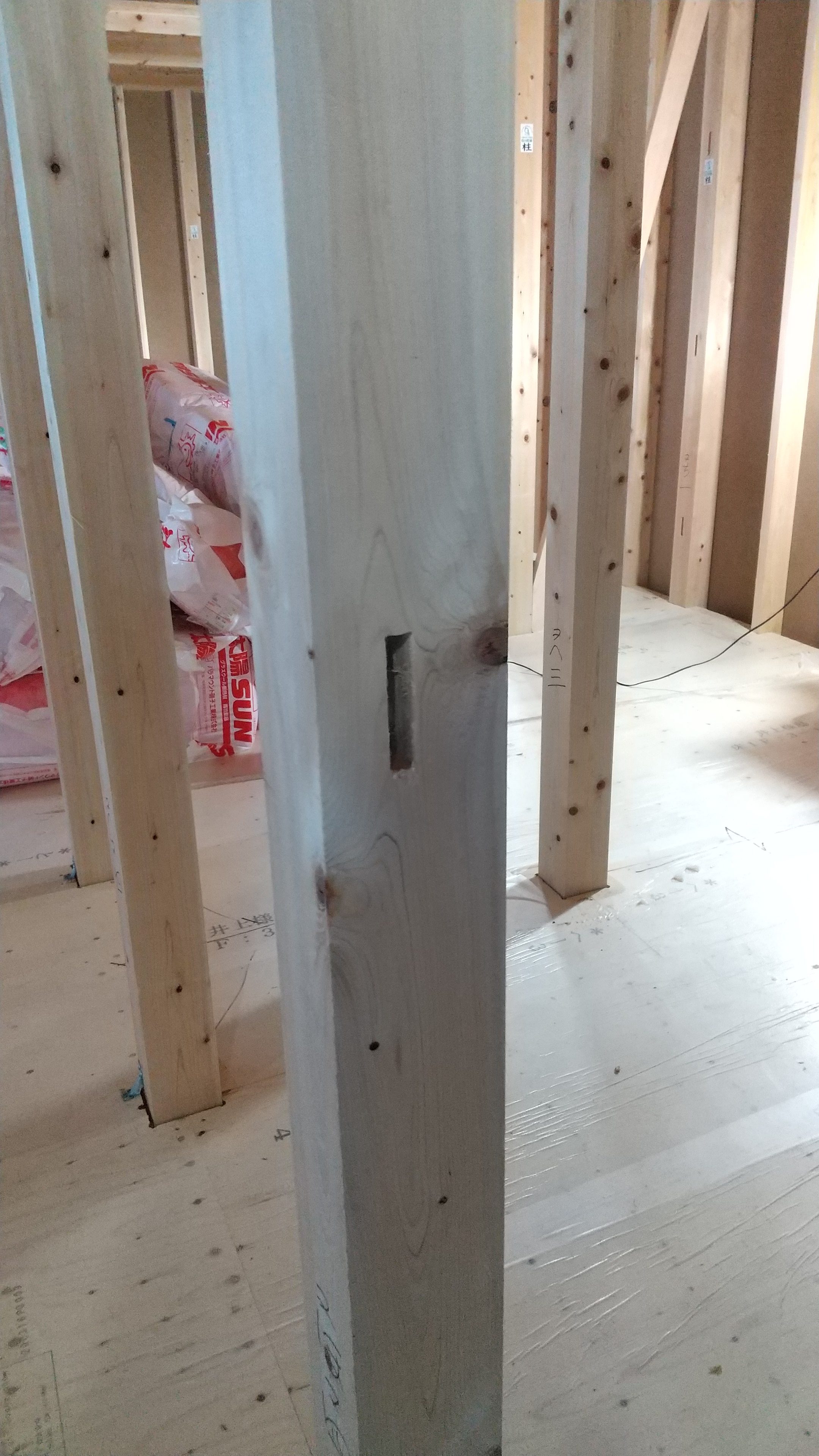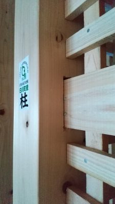 土壁の部分には、プレカット打合せの際に貫を入れてもらう様に打ち合わせをし、上棟の際には貫の穴が施してある柱が納入されるようになっています。あら!シールが写ってしまいましたね。こちらは、通し柱が岐阜県証明材である事、土台、桁、梁、母屋が全体の80%以上岐阜証明材である場合に応募するとプレゼントされます。今年は応募が少ないようで、i様もお受け取りになる事ができました。柱の代金は、後に買われる家具や家電の足しにしていただけますね。