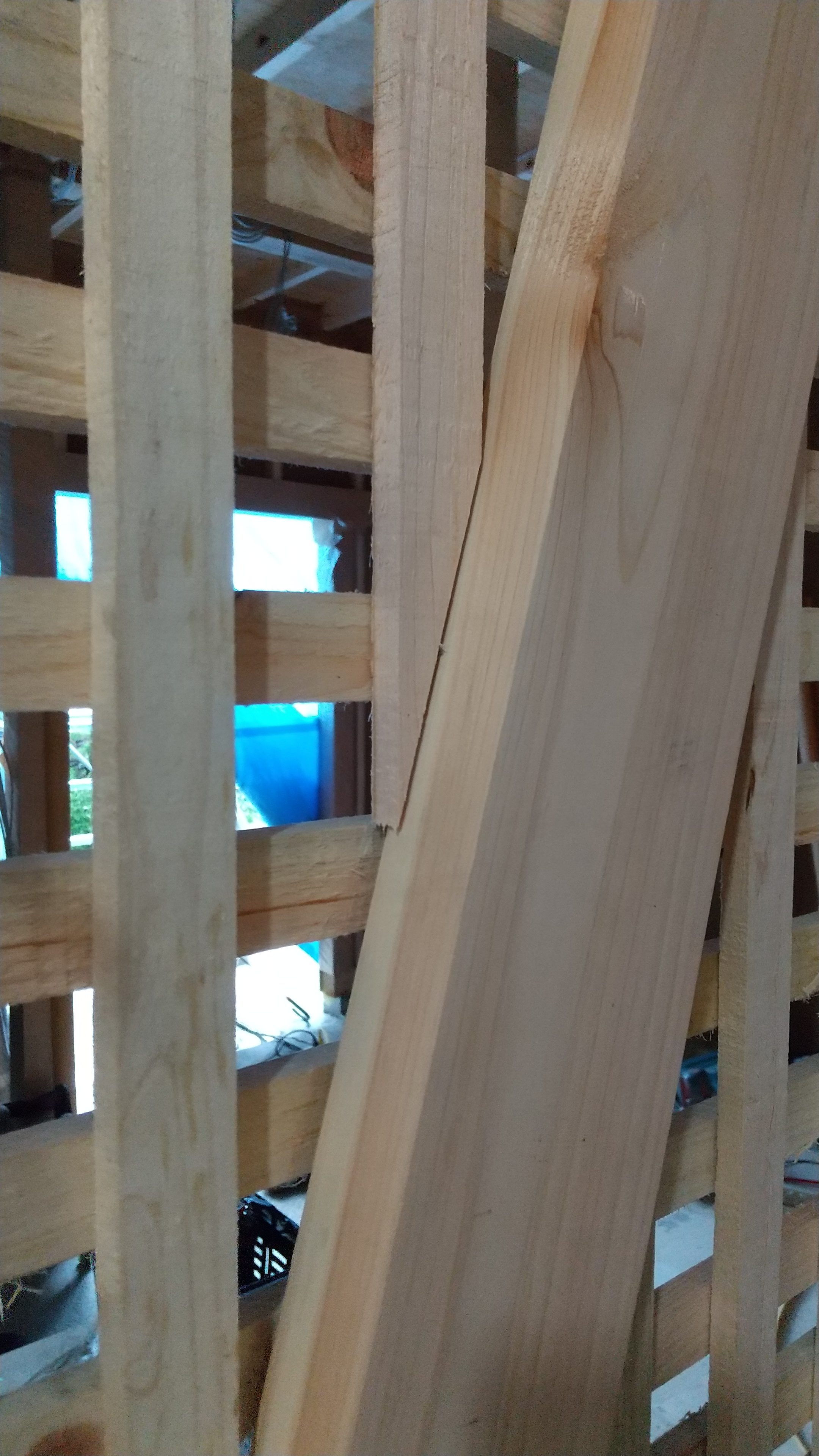 あれ?先日この壁は全部小舞が嵌め込まれていたような~「h谷川がたきもん(焚き物)にしちゃったわ~」(←燃えるゴミと言う意味です)とk棟梁。すかさずh谷川君を見ると苦笑い。ここは両側が真壁なので壁の厚みを薄くするため、小舞の片側を筋交いの部分だけカットしているんですね。これは間違えそう~せっかく親方が造った小舞ですがゴメンナサイ。h谷川君の母親目線です。