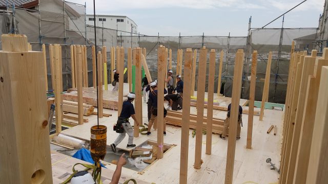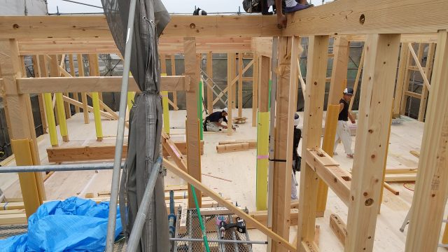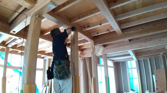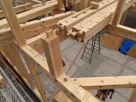 7月3日の中間検査に向けて、接合部の金物の取り付けを行っています。