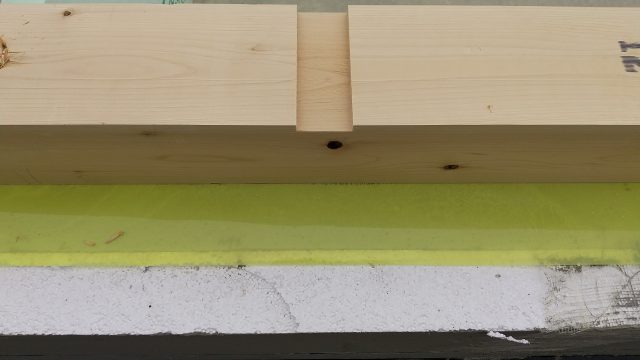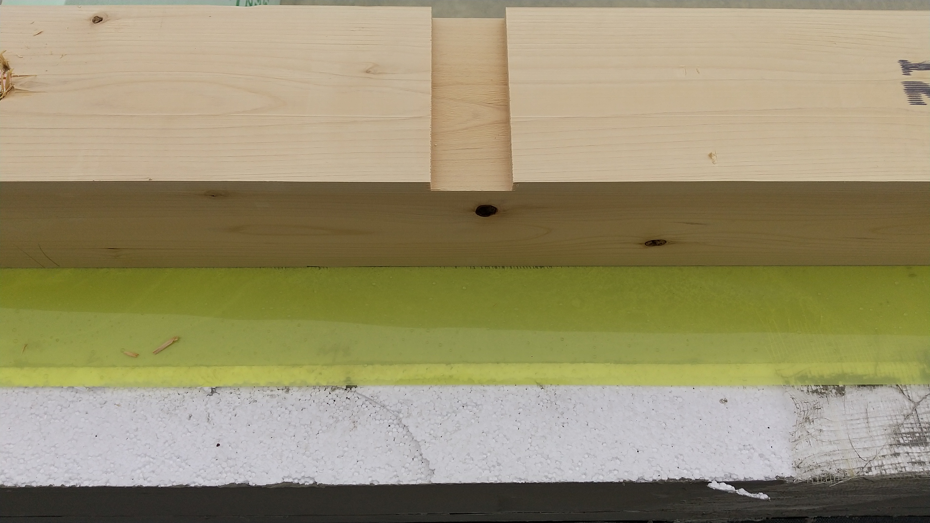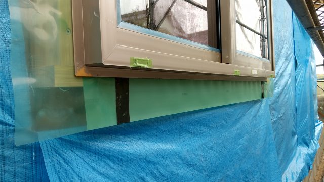 あ!これは、a監督が棟梁と打ち合わせしていたサッシ廻り専用の防水シートですね。ちゃんとタテ側勝ちになっています。k棟梁、完璧ですね。