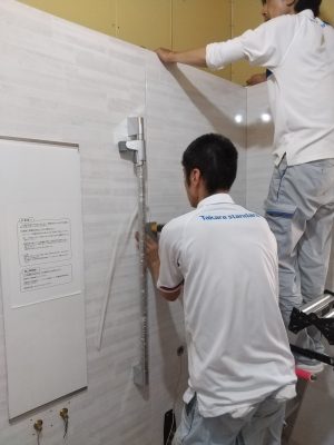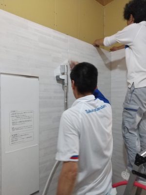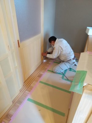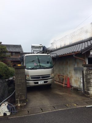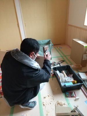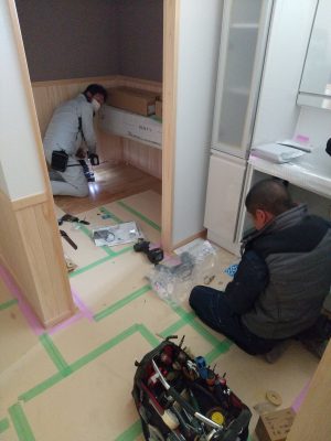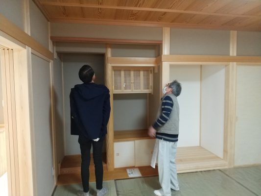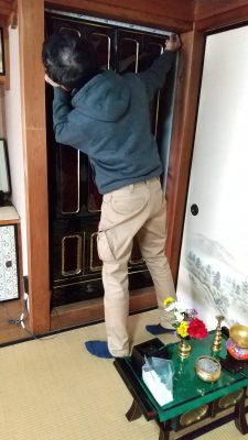測量士さんが計測中に、仏壇の大きさの再確認です。仏壇はめったに動かす事がない為、良い機会なので仏壇屋さんに洗いに出されます。工事中、預かってもいただけますのでお勧めです。