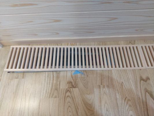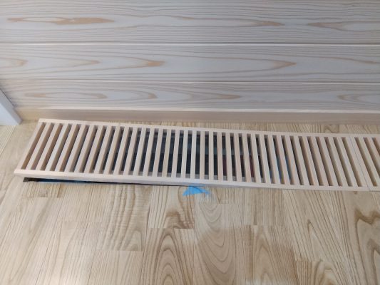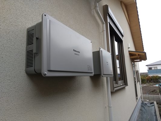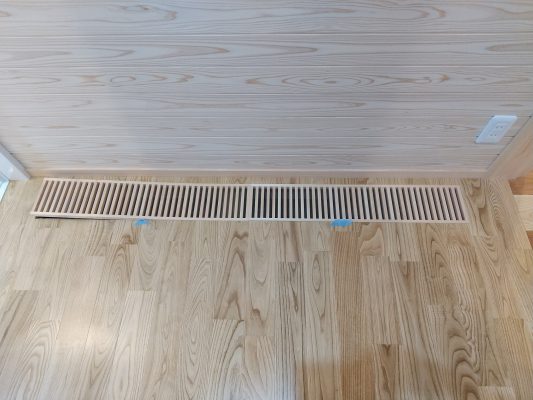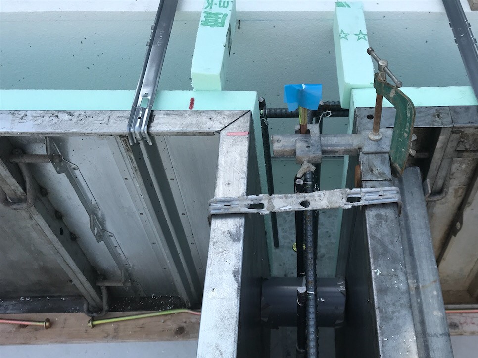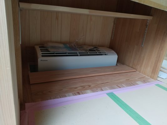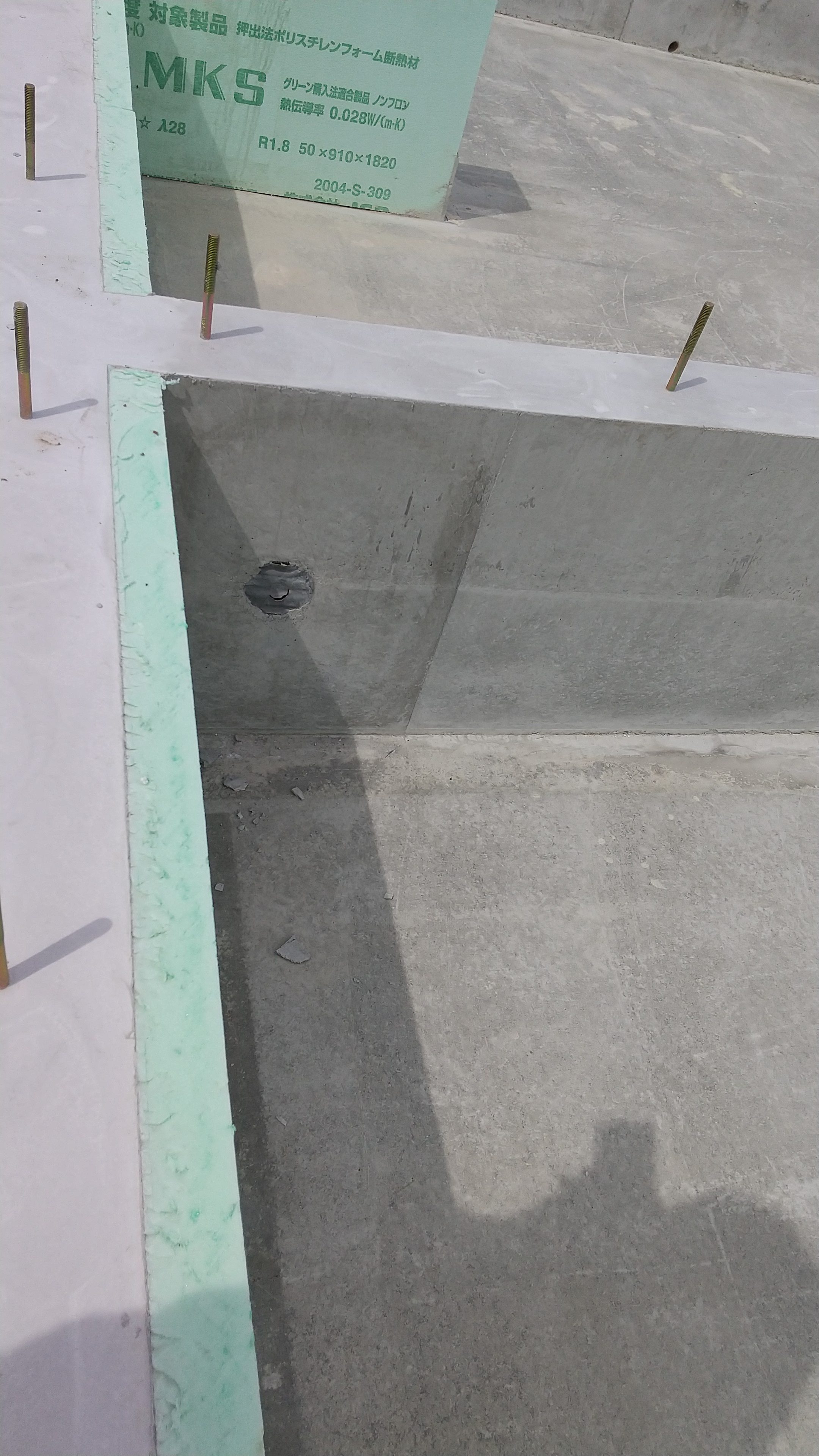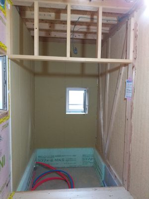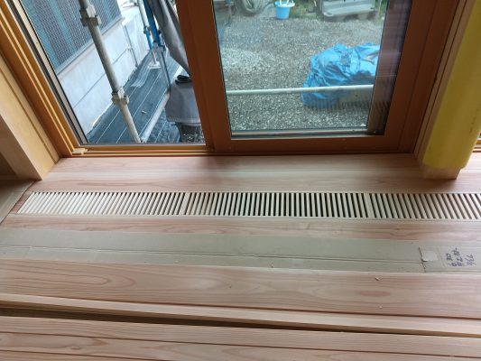 今回は半埋め込みエアコン(一般的な壁掛けエアコンを使用)を設置しますので、あらかじめエアコンの配管を通すスリーブを基礎の立上りに空けています。半埋め込みエアコンは主に暖房用で、暖かい空気は上に上がる性質を利用し、床下の空間に暖気を送り込み、エアコンからの直接的な風を感じることなく、床下からほんのりと暖かくしてくれます。