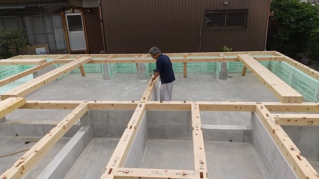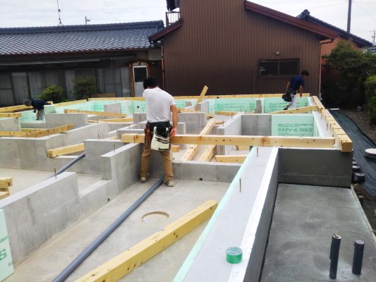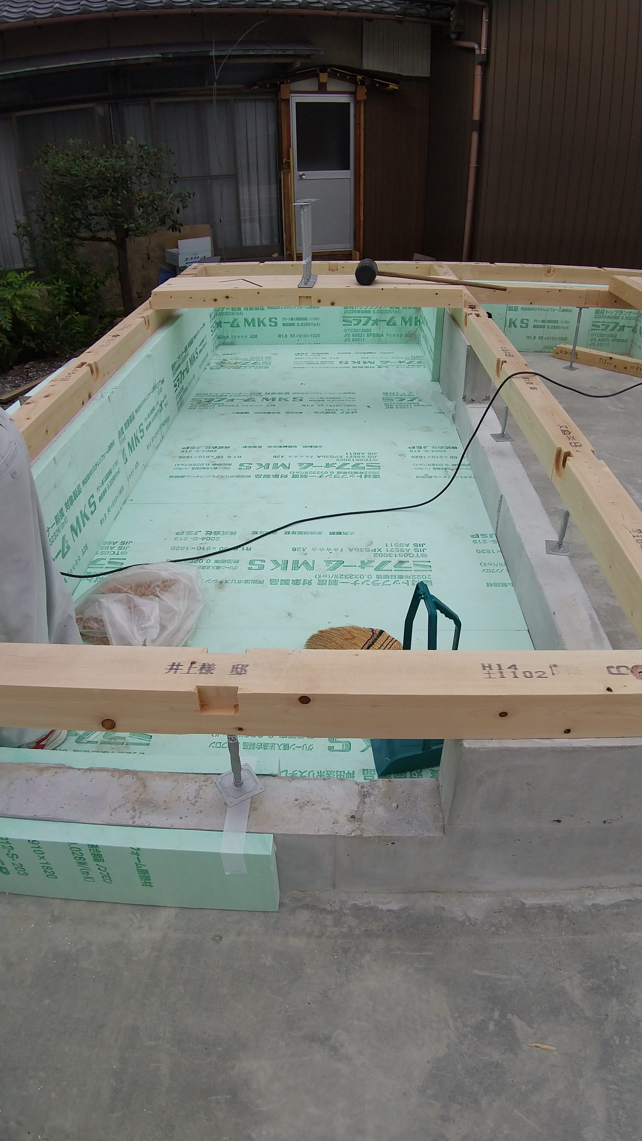 立上りの型枠と内側の断熱を組んでいきます。アンカーボルトの位置は、a監督がしっかり確認し、いよいよ基礎工事も終盤です。