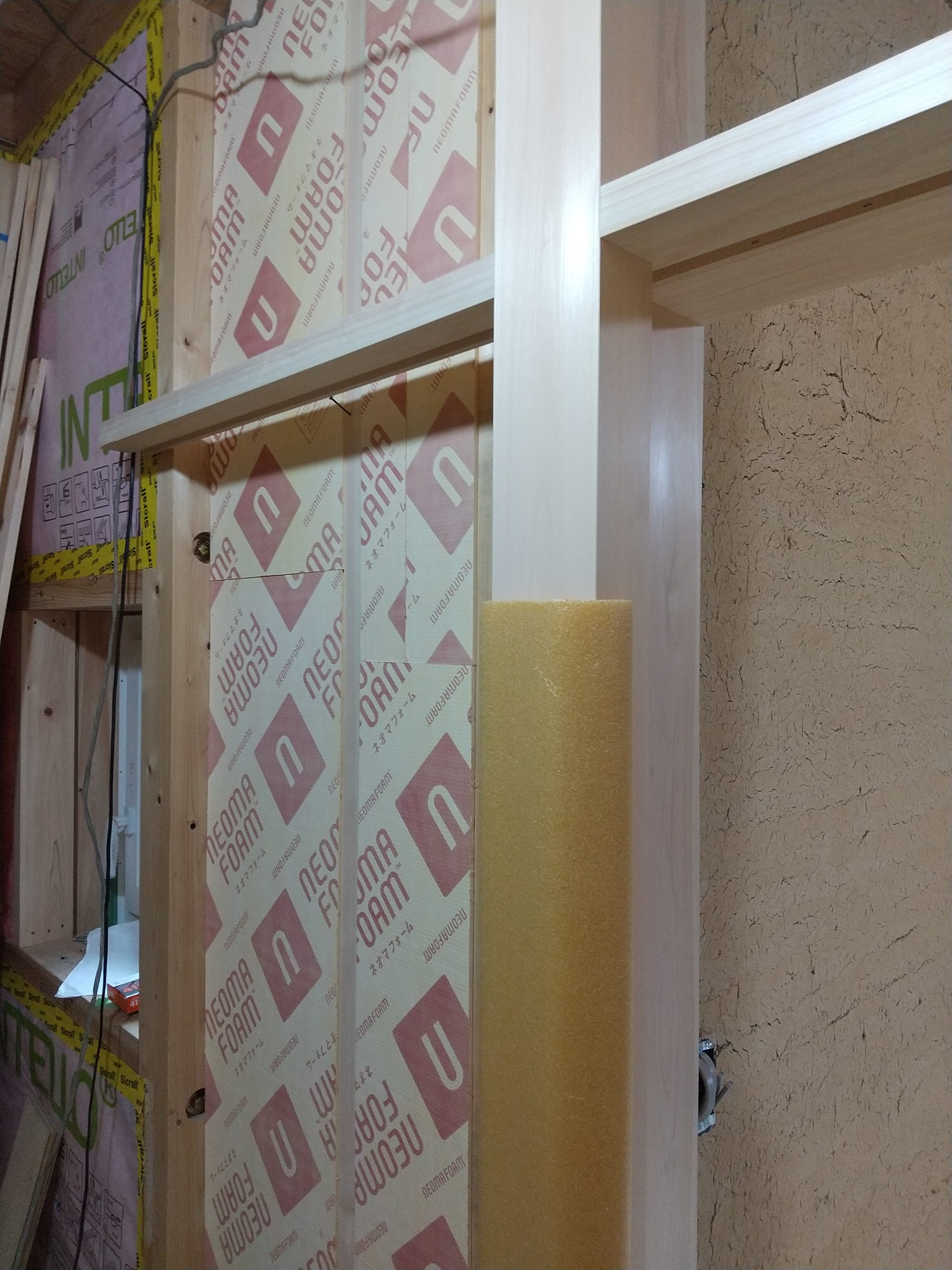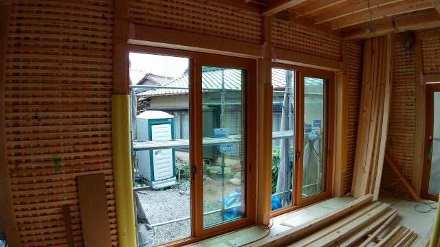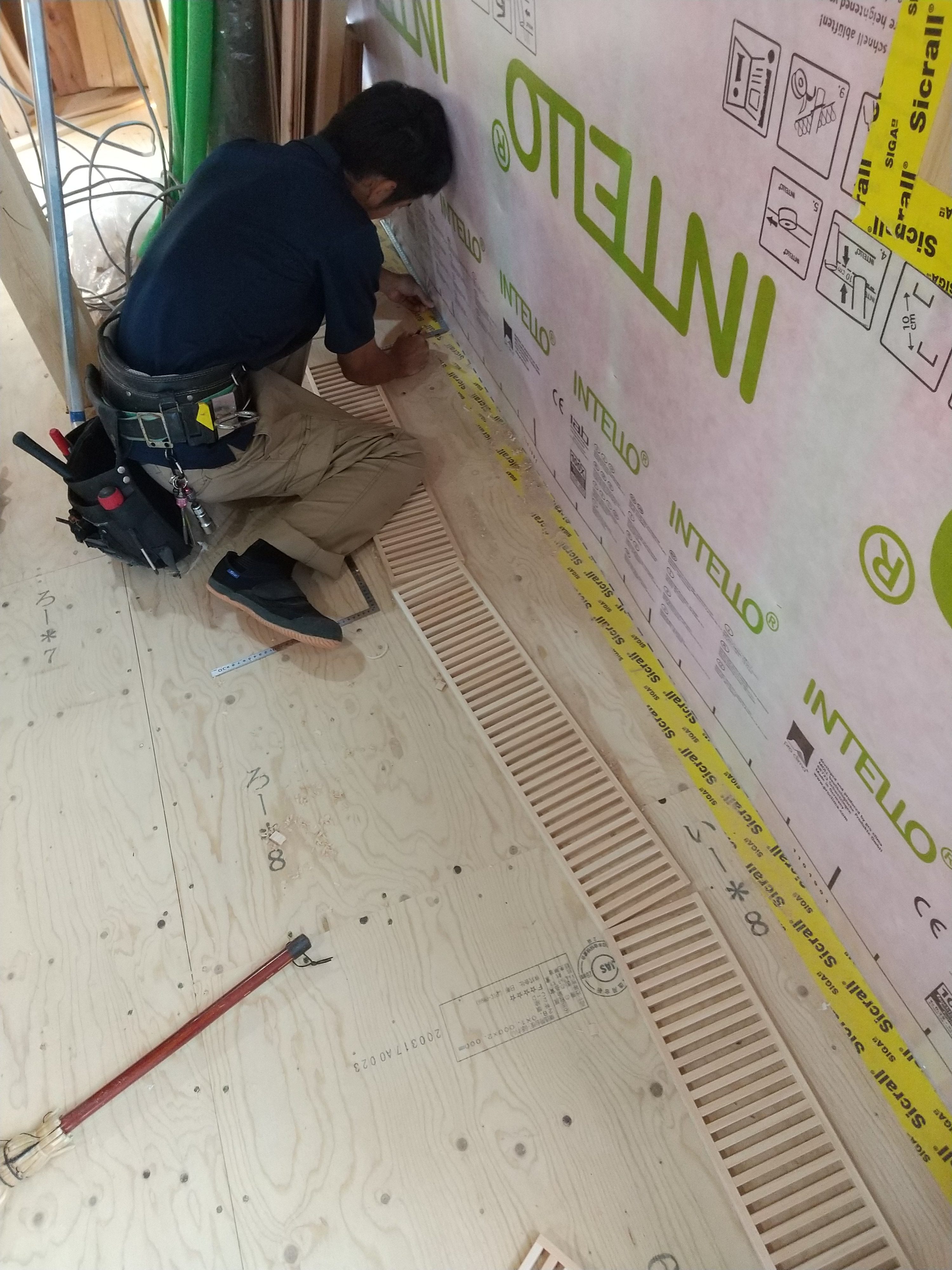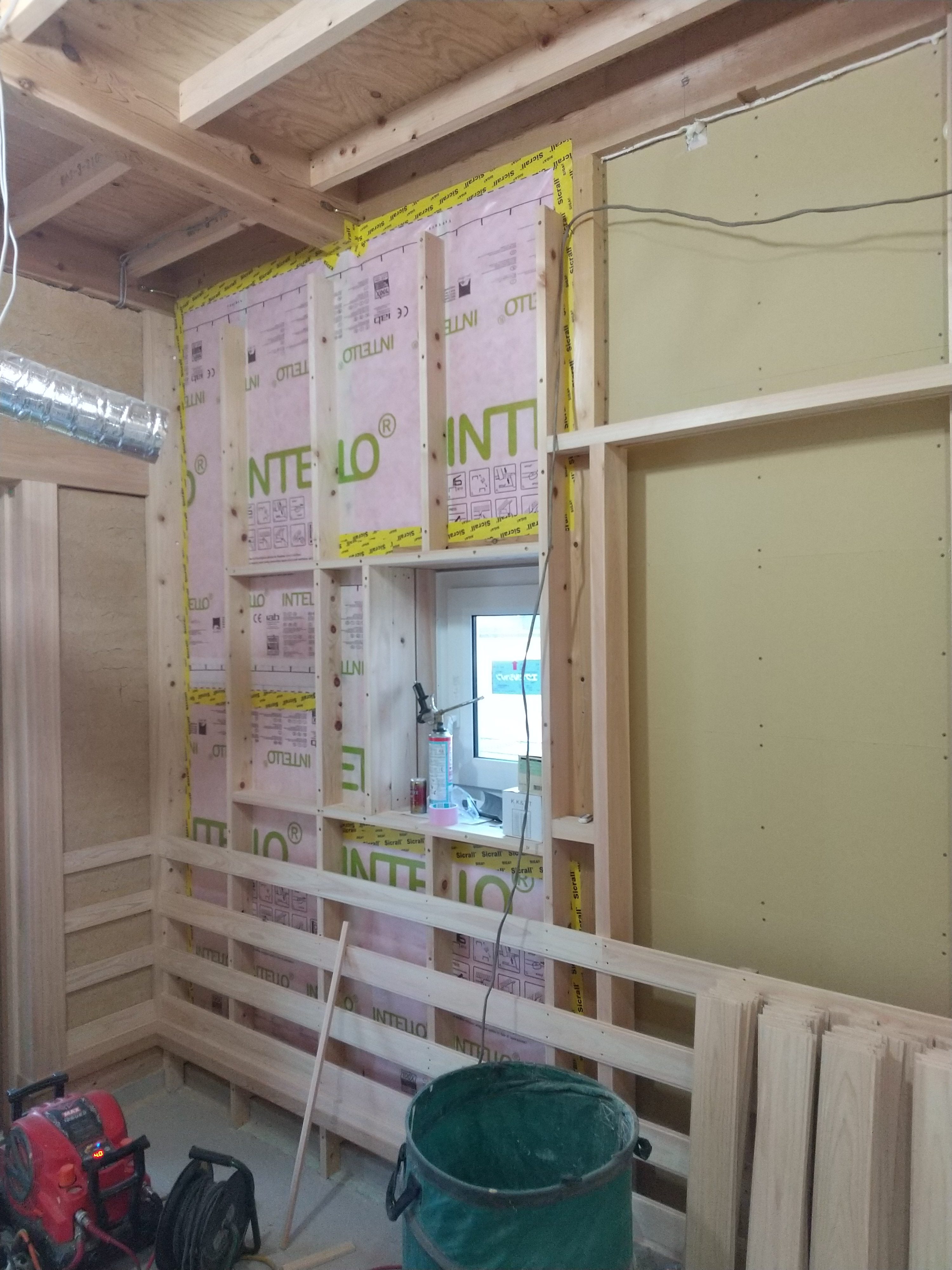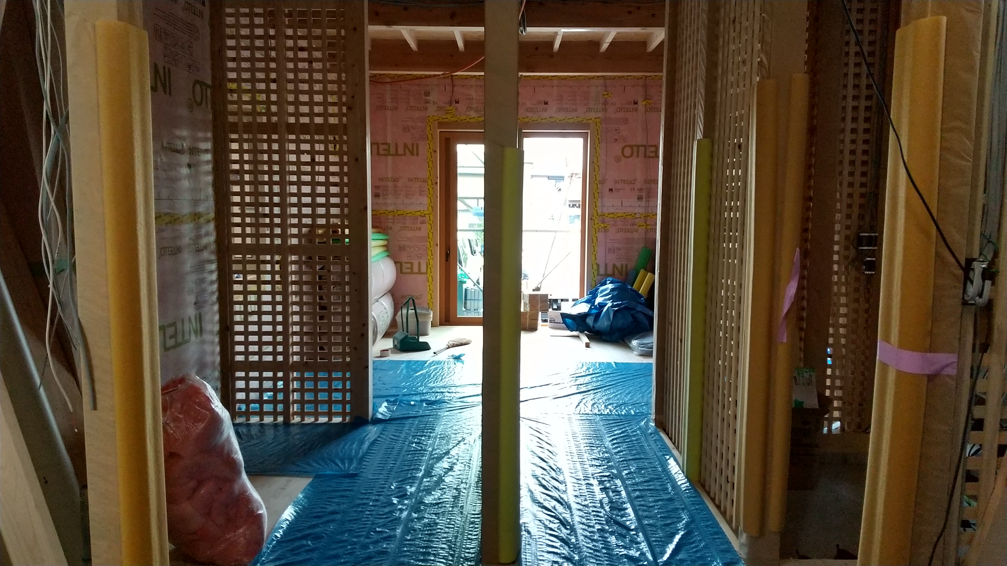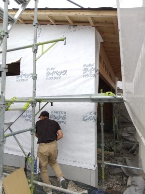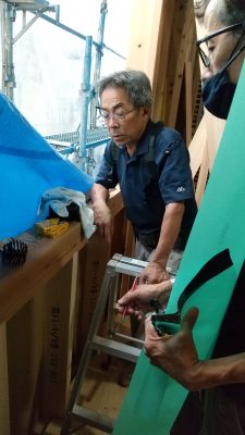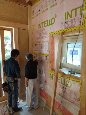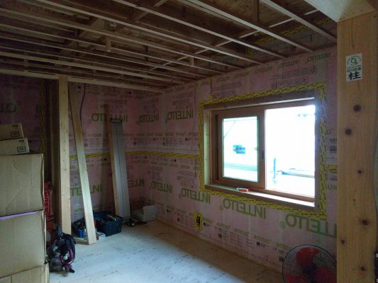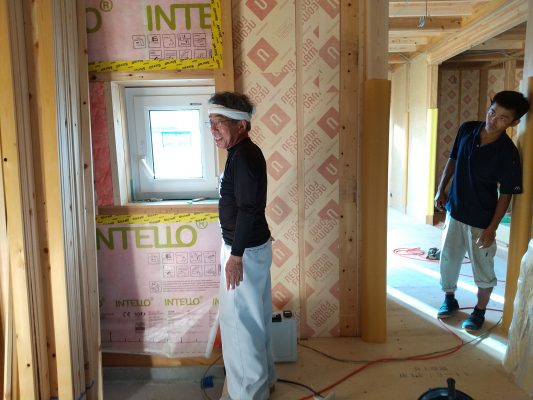 この後、室内で発生した湿気により、壁内部で結露が起きないように、この外側に通気層を設けます。透湿防水シートは、外部からの雨水の侵入を防ぐ防水性と、壁体内の湿気を外部に逃がす透湿性を兼ね備えたシートなのですが、k棟梁はどんな構造になっているんだろうね、凄いよねと商品に感心しながら施工しています。本当に発明した方は凄いですね。