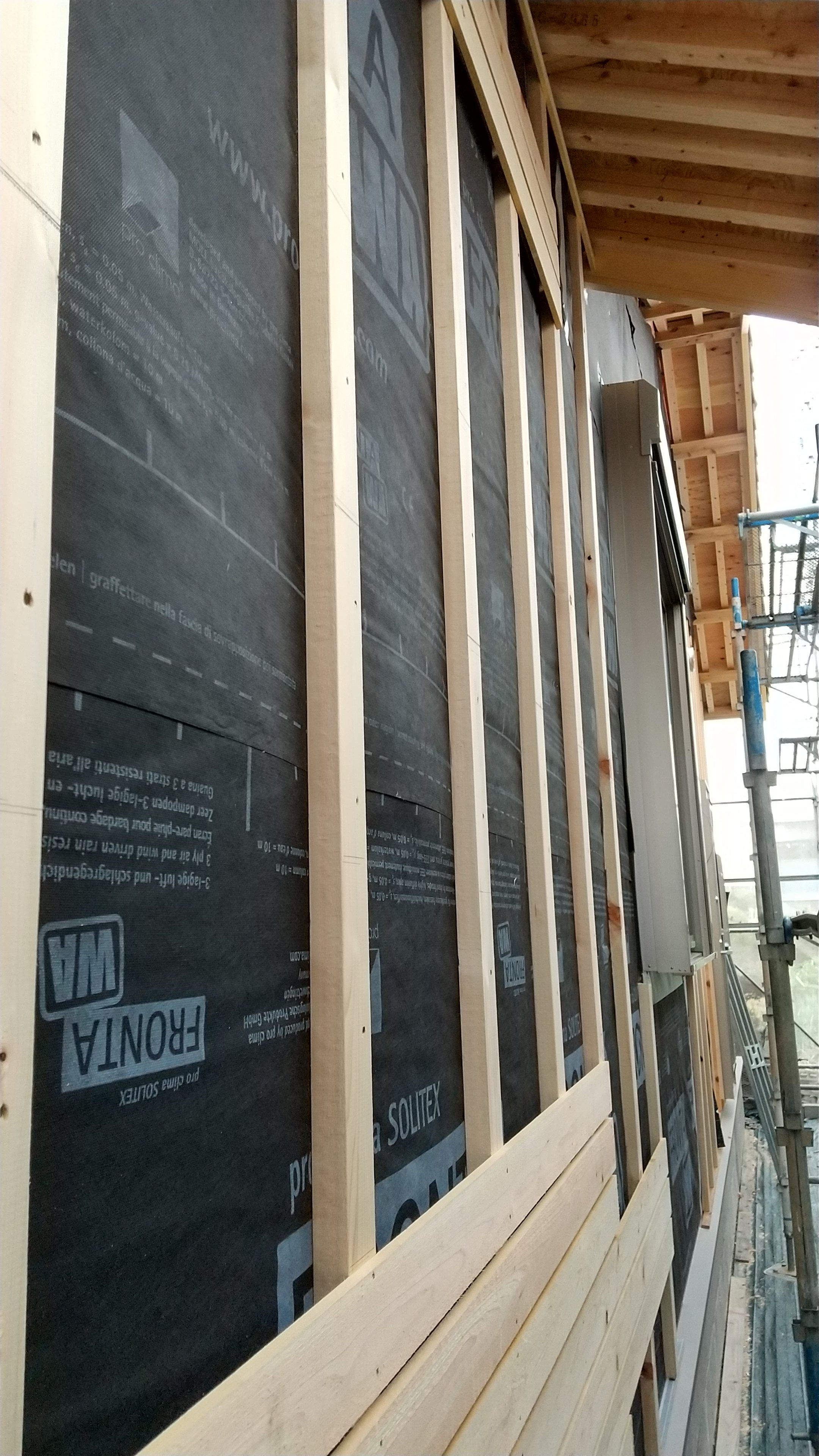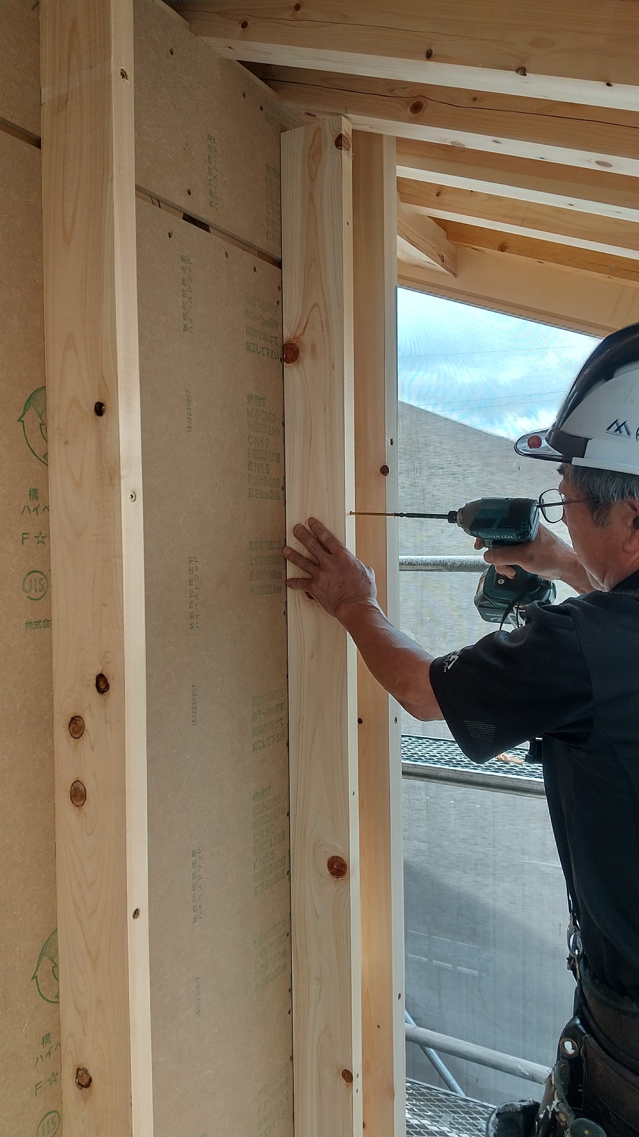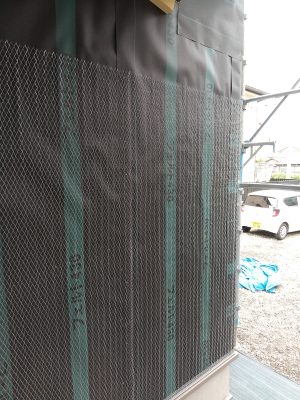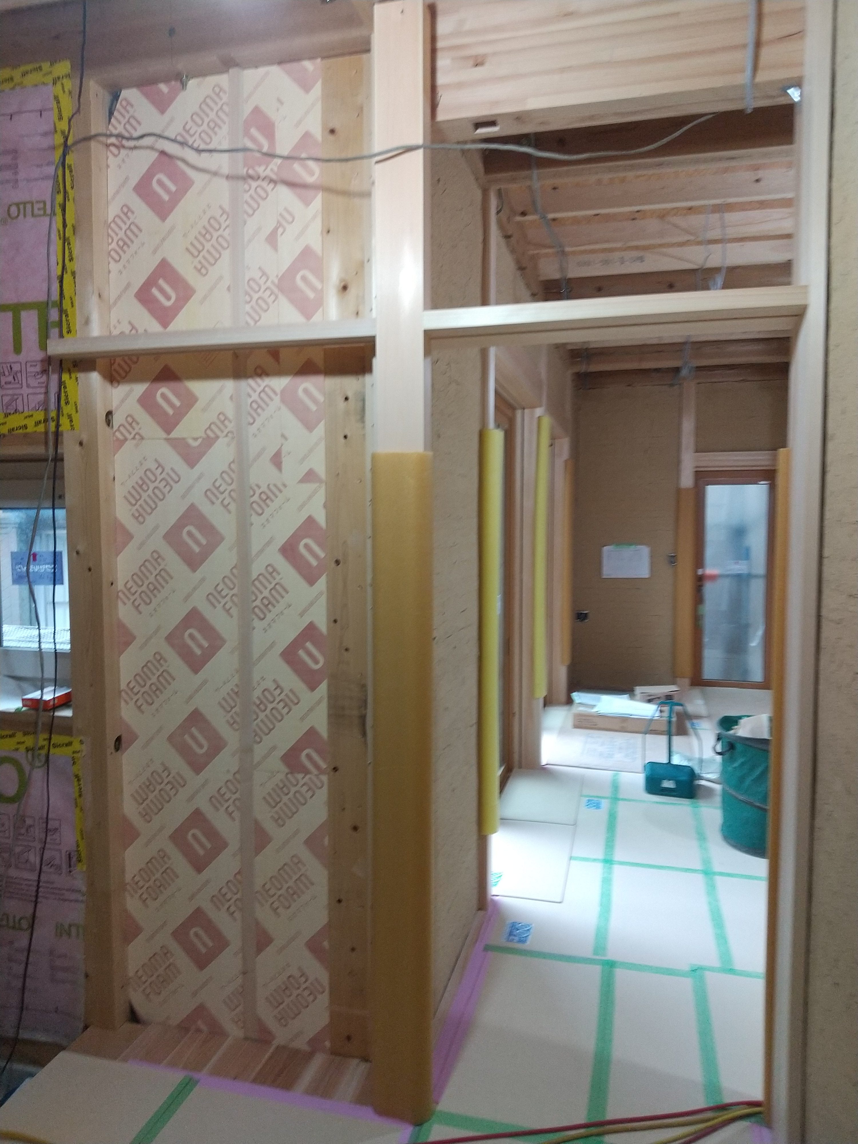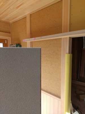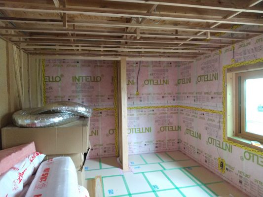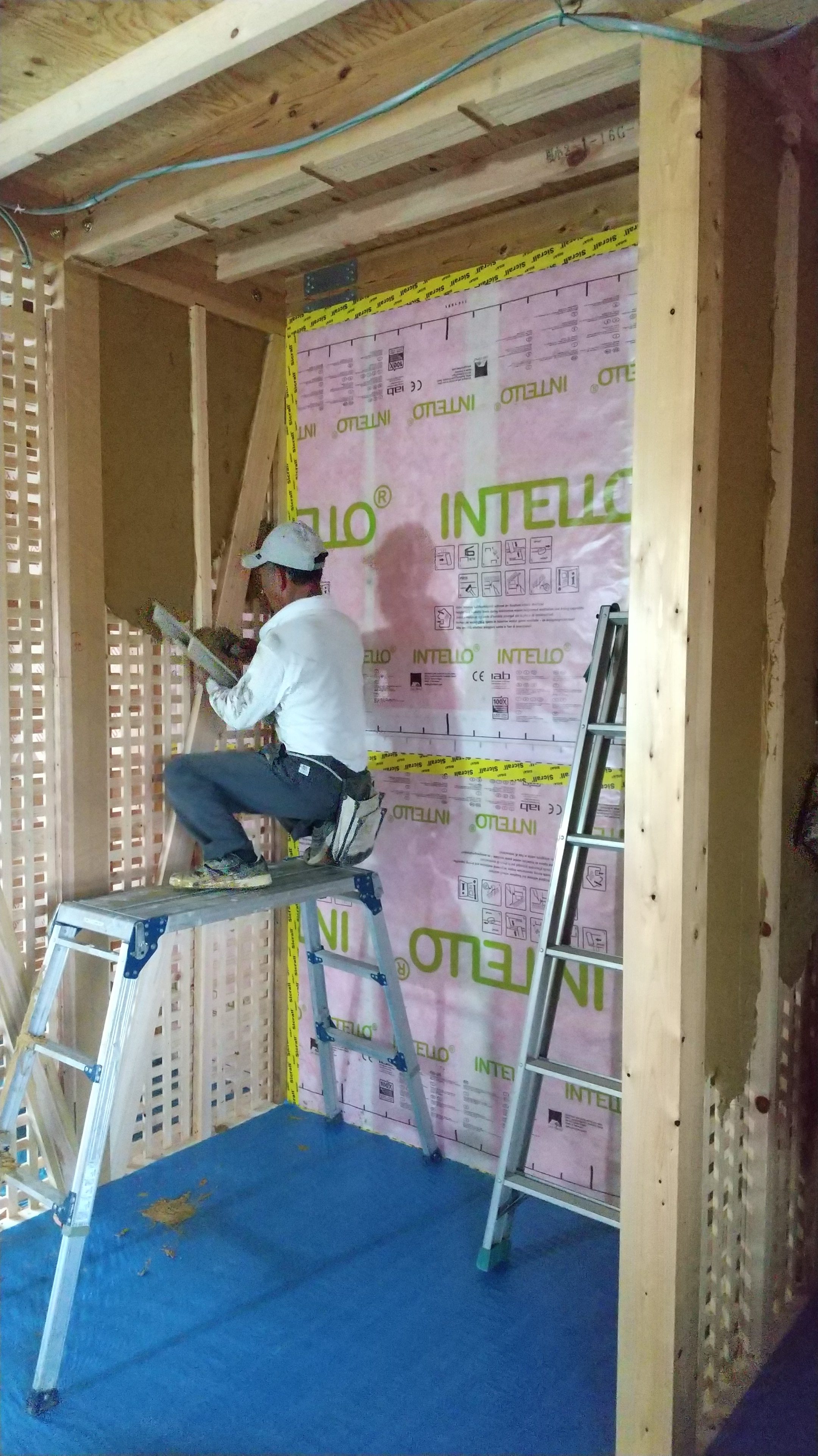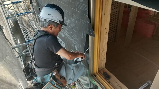 この後、室内で発生した湿気により、壁内部で結露が起きないように、この外側に通気層を設けます。透湿防水シートは、外部からの雨水の侵入を防ぐ防水性と、壁体内の湿気を外部に逃がす透湿性を兼ね備えたシートなのですが、k棟梁はどんな構造になっているんだろうね、凄いよねと商品に感心しながら施工しています。本当に発明した方は凄いですね。